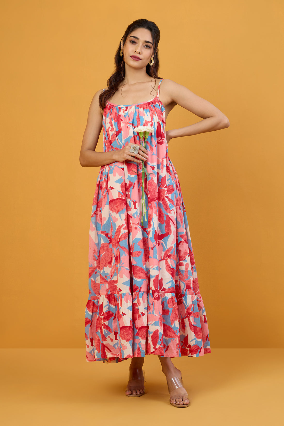 Monochrome Petals Long Ruffle Strap Dress