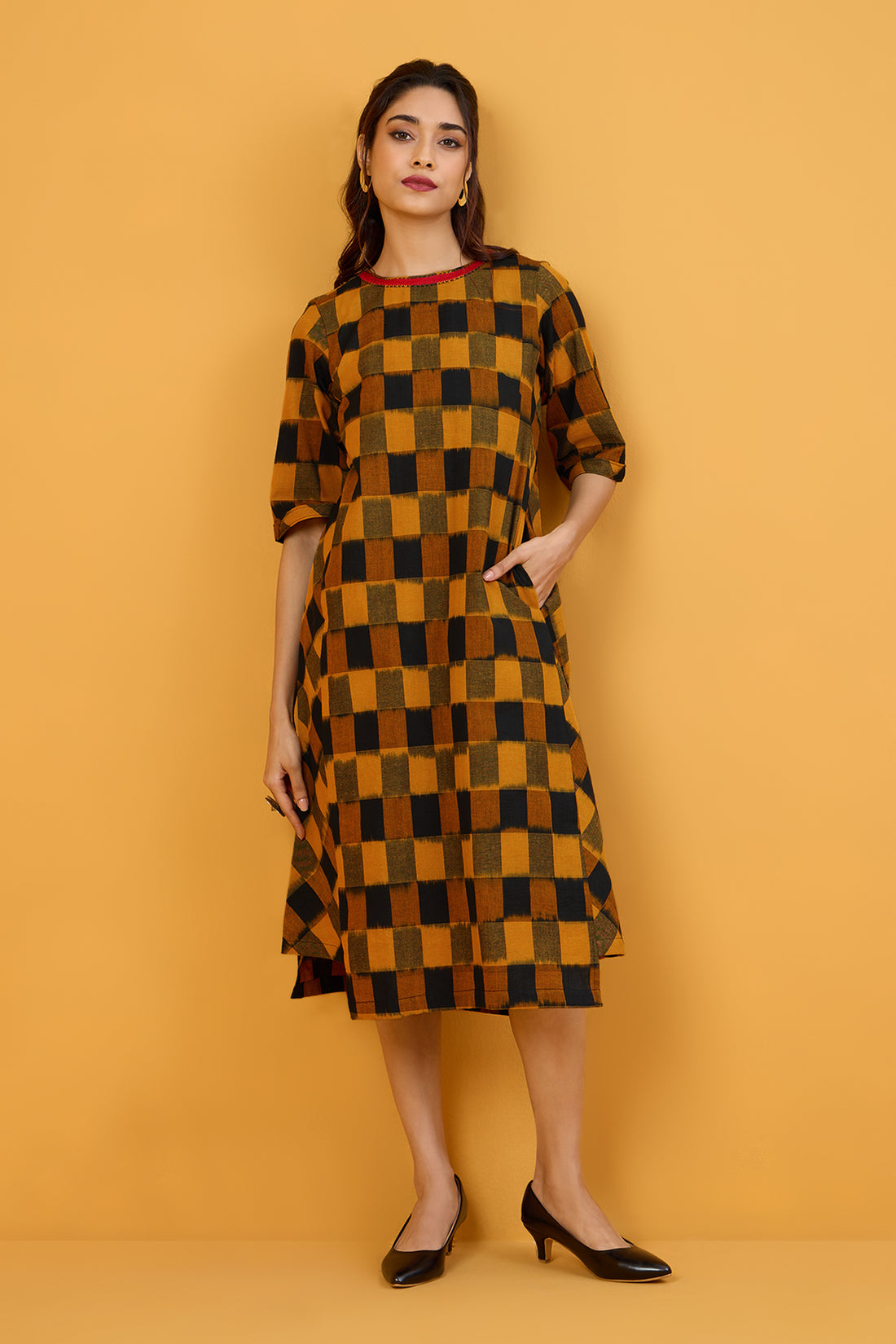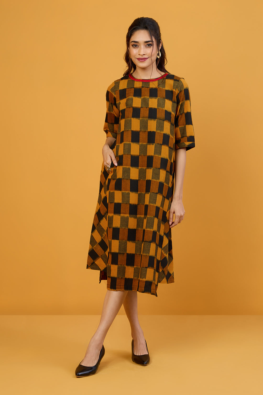 Golden Noir Checks Side Bias Shift Dress