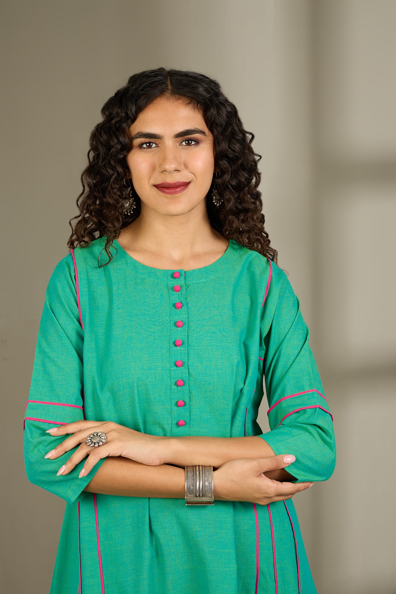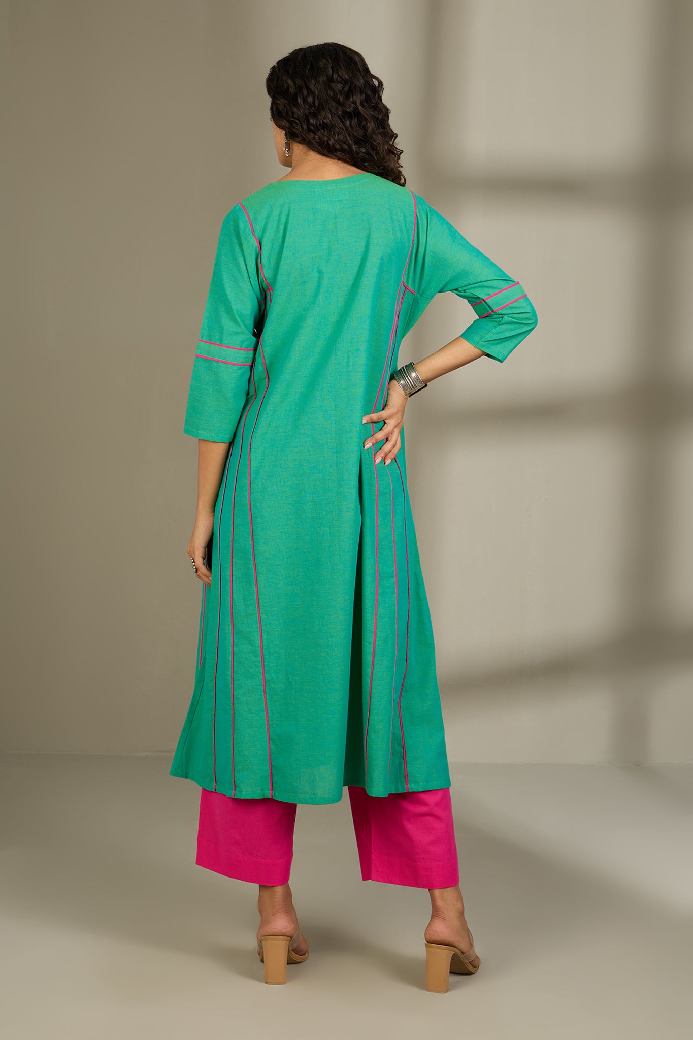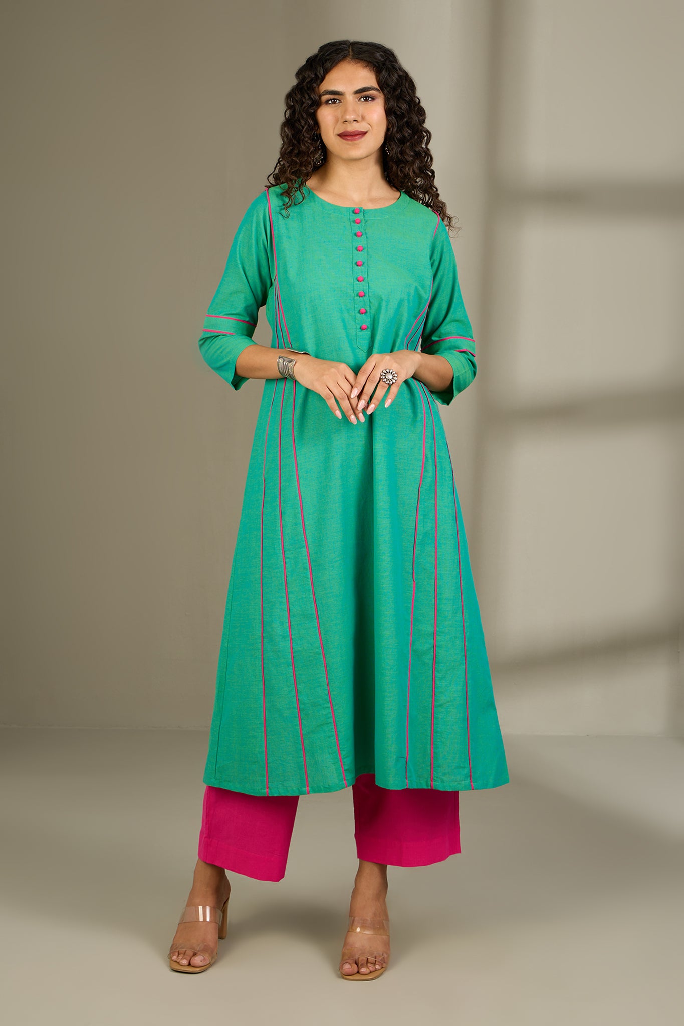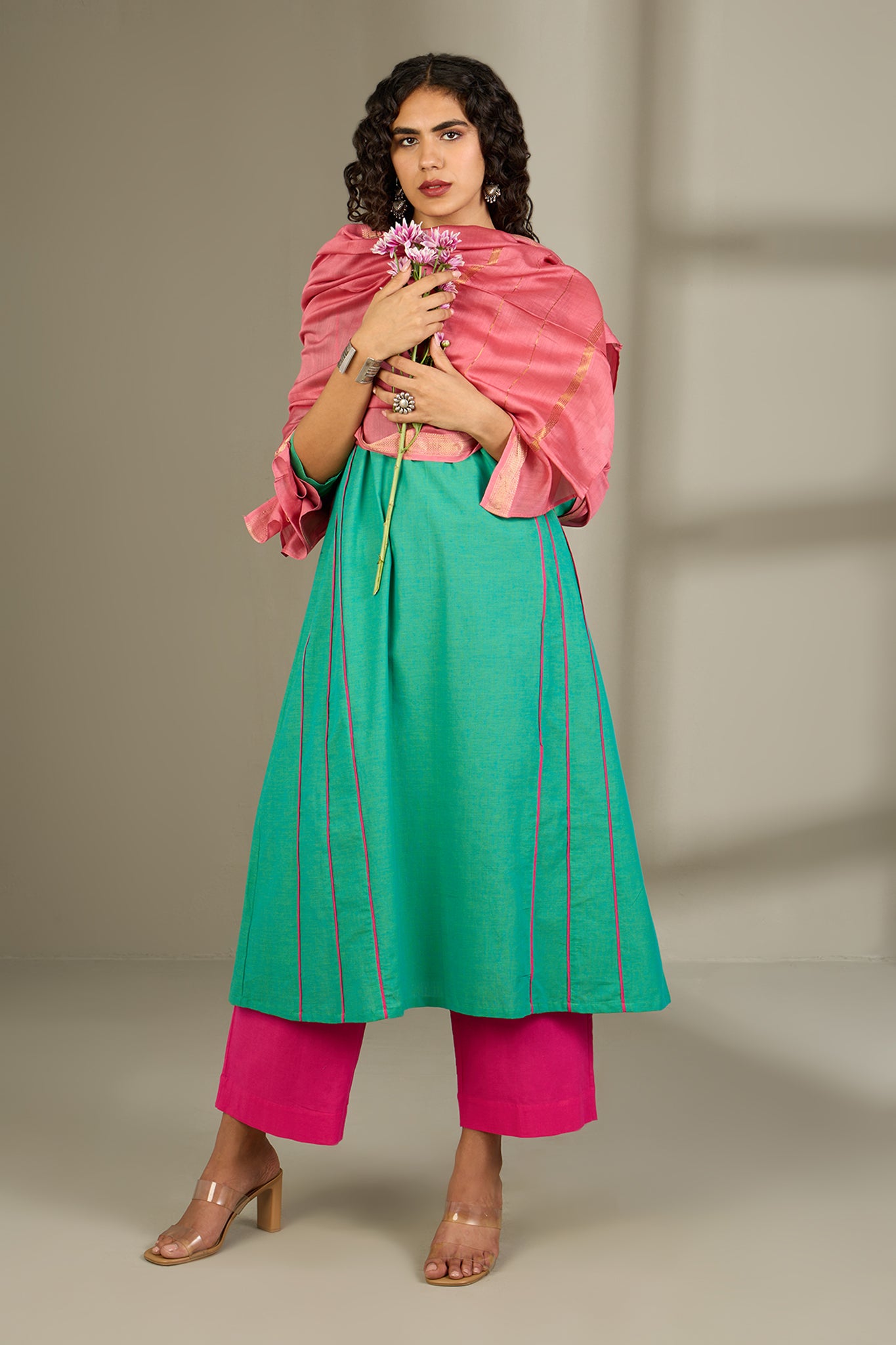 Experience timeless elegance with our Choga Kalidar Kurta, crafted in refreshing hues of sea green and pink. Designed as festive or pre-occasion wear, this piece is adorned with pink potli buttons, contrast piping, and delicate handcrafted details that highlight its charm. Made in soft cotton, the kurta draws inspiration from Mughal dressing while embracing modern ease. Its tailored kalidar fit flatters the silhouette, making it perfect for celebrations, soirées, or intimate gatherings. A seamless blend of tradition and contemporary style, this kurta is a sophisticated addition to your wardrobe. Luxury in every detail at Maati.