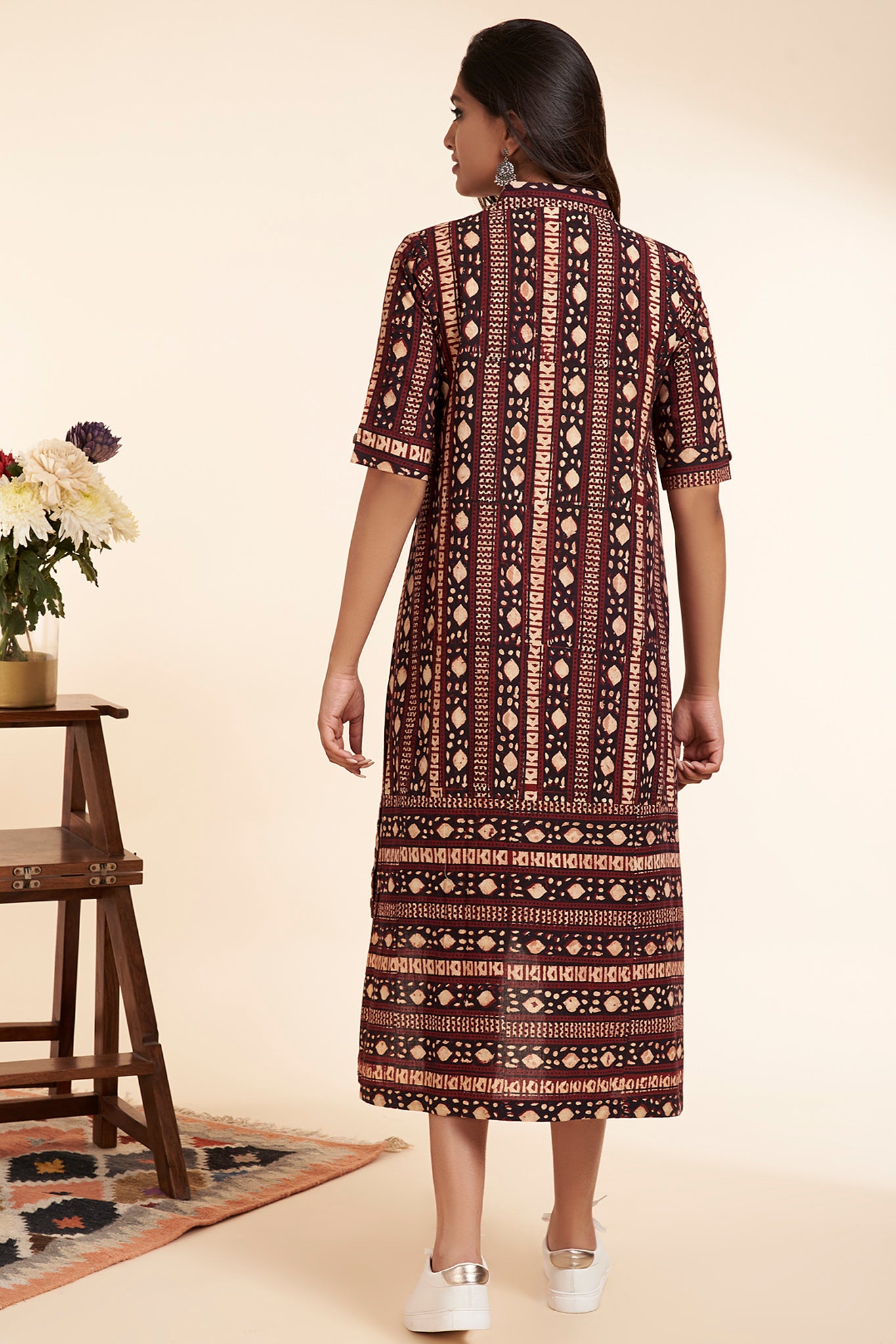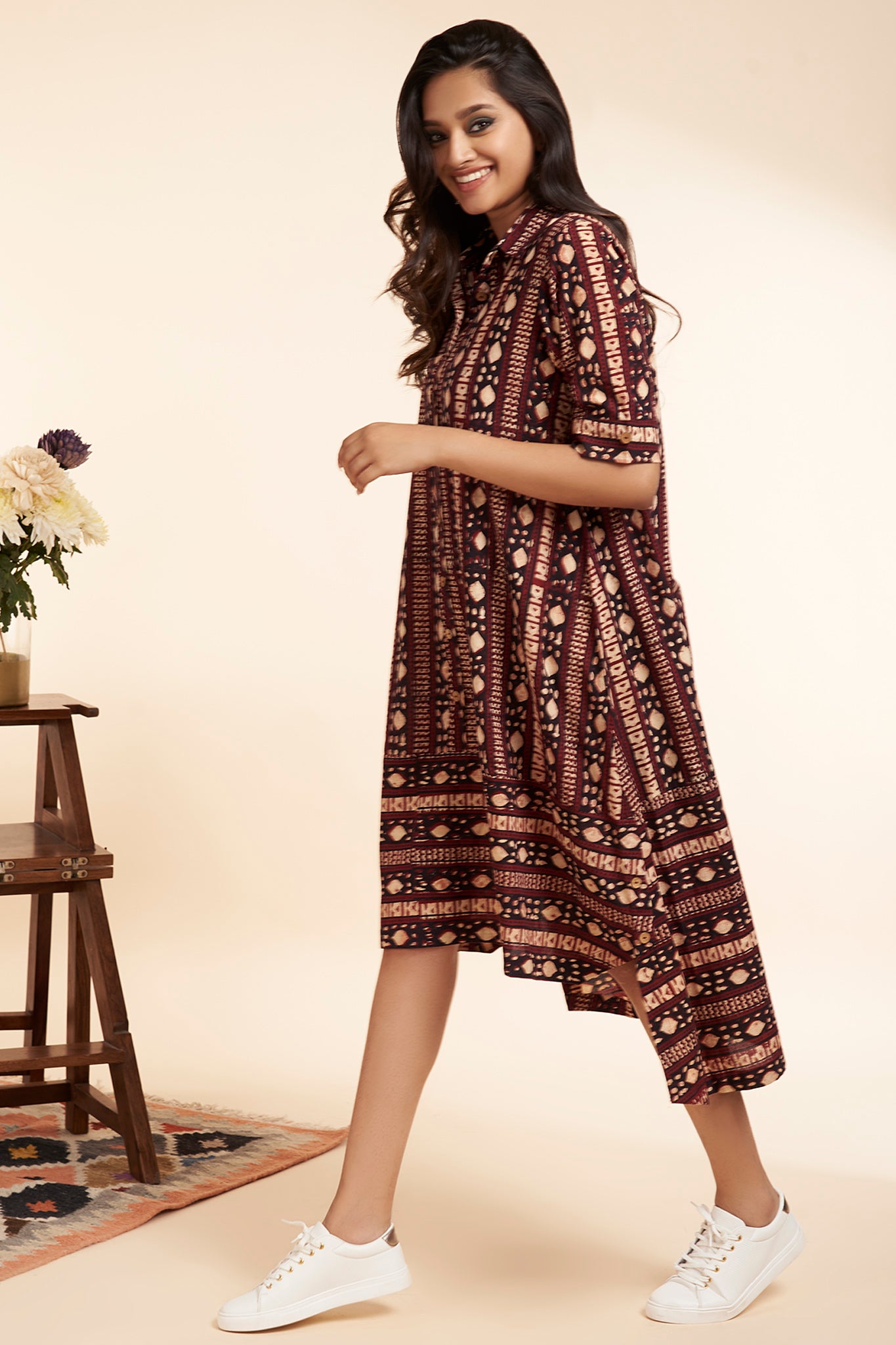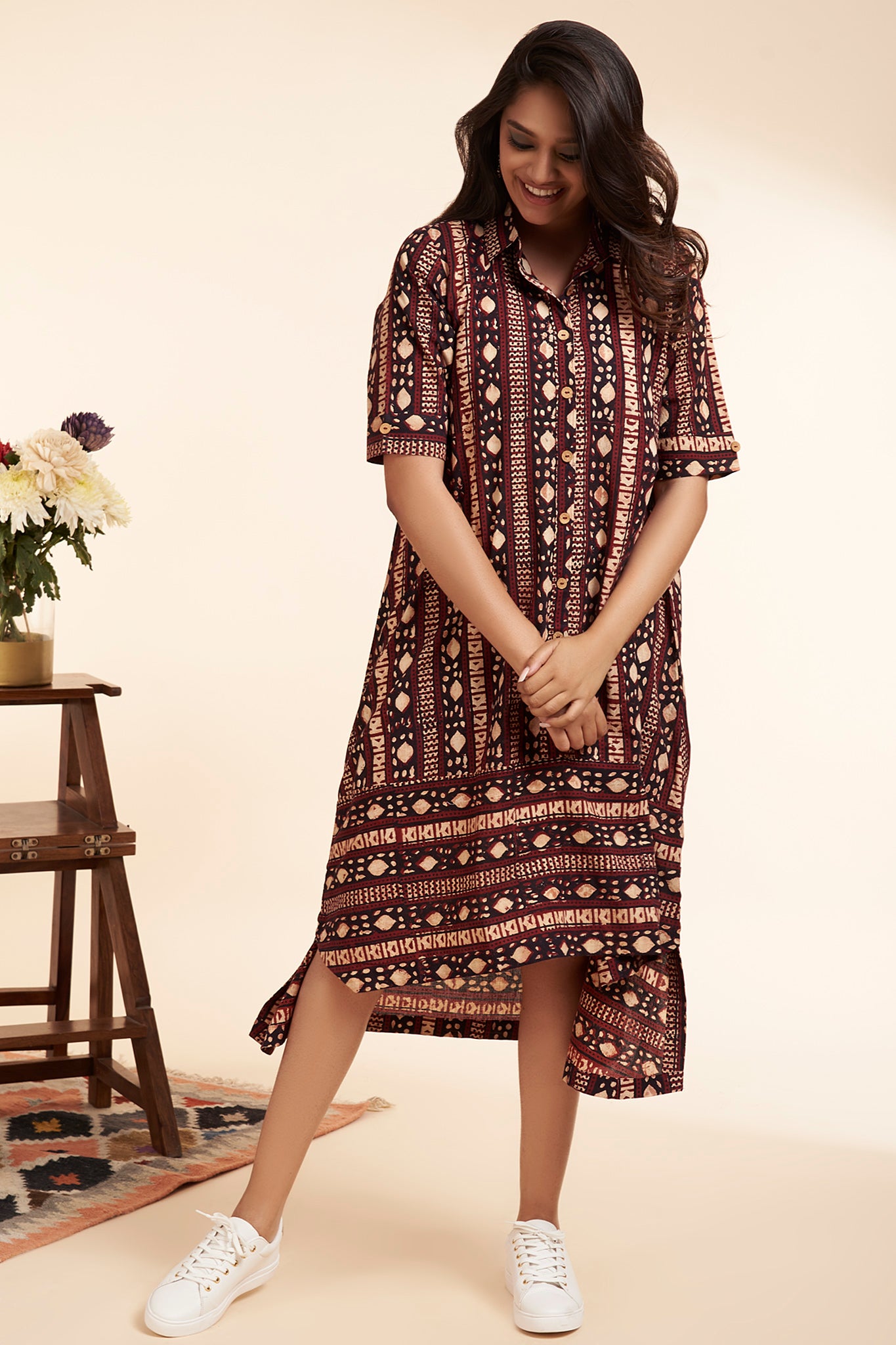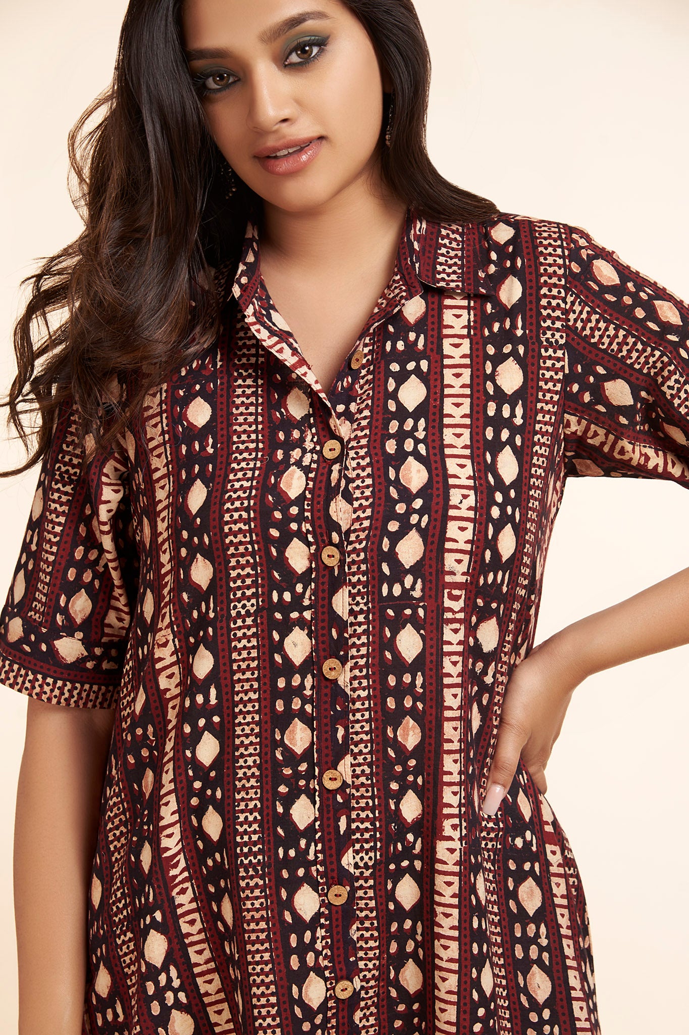 Handcrafted in soft hand black printed cotton, the silhouette is very functional & stylish! The monotones of black & red blend seamlessly overall and create an abstract pattern inspired by celestial sky. The dress is finished with delicate handmade buttons in front all over & on sides lending a perfected finish to the outfit. The asymmetrical hemline adds an edgy touch to the outfit. Style it with denim or wear it as a dress with brogues!Cotton is sourced and block printed in barmer, rajasthan and is hand-stitched at our atelier in Mumbai by our karigars & hand-finished by our in-house women artisans.The dress tunic is a wardrobe essential and we guarantee you will keep coming back to this versatile silhouette for all occasions.