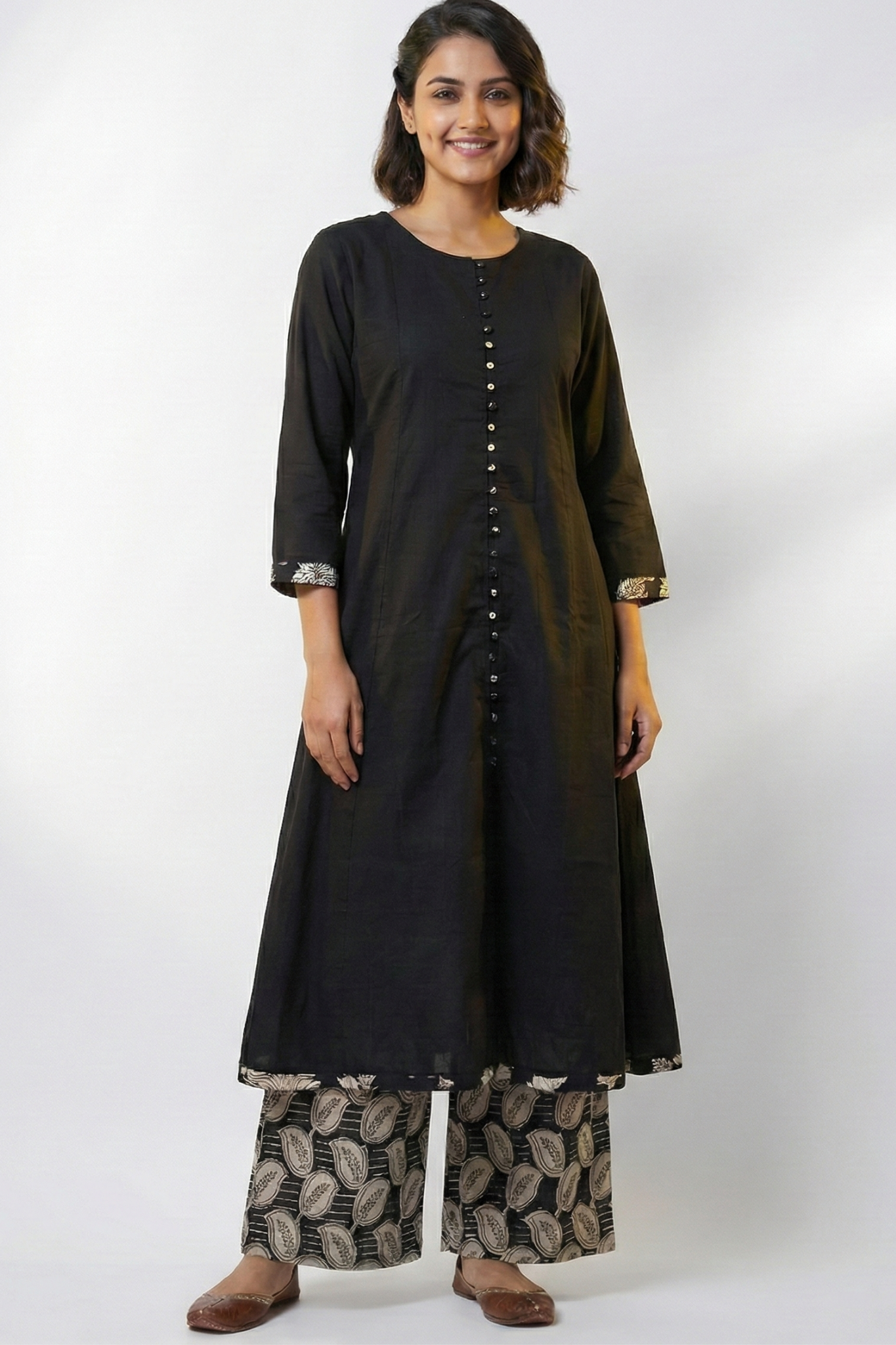 Effortlessly elegant, this black cotton cambric kurta is a timeless wardrobe essential. The button-down front gives it a structured, classic appeal, while the slightly A-line relaxed fit ensures easy comfort throughout the day. Subtle border detailing adds a handcrafted touch, elevating the look without overwhelming it. With 3/4th sleeves and 100% pure handcrafted cotton, this piece blends breathable comfort with everyday sophistication.Pair with pants,studs, and flats for a clean, minimal day look.