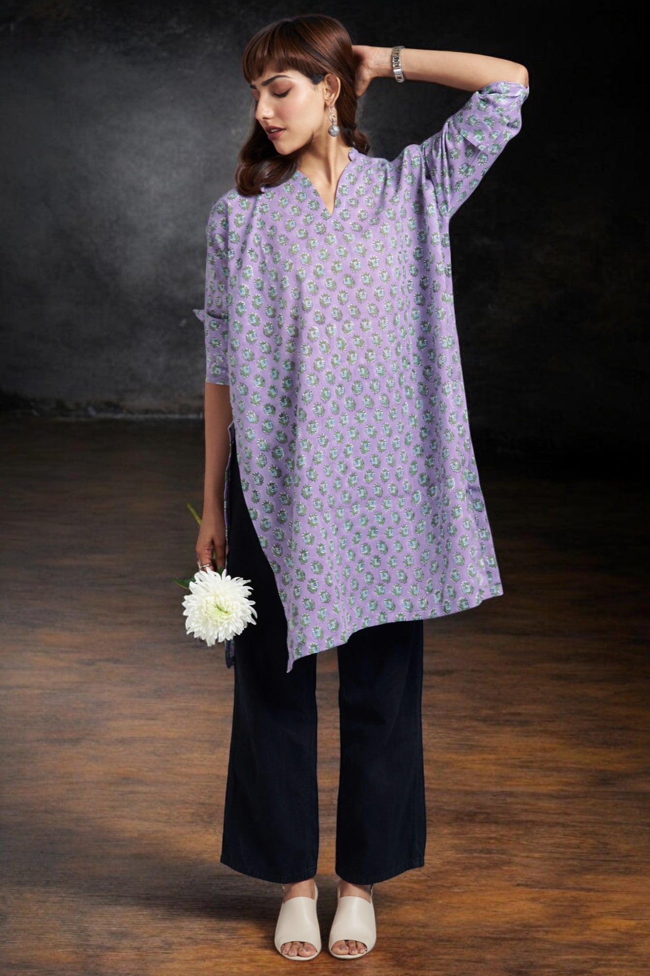 Handcrafted in slub cotton, the silhouette is very functional & stylish! Handcrafted in cool hues of lavender, in soft slub cotton sourced from Barmer, handblock printed with rapid technique. The tunic features a long side slit for an edgy look, delicate round collar on neckline, long sleeves with cuff detail & a button to style it, lending a perfected finish to the outfit. The hemline adds an edgy touch to the outfit. Style it with denim or pants with your favourite heels or sneakers!