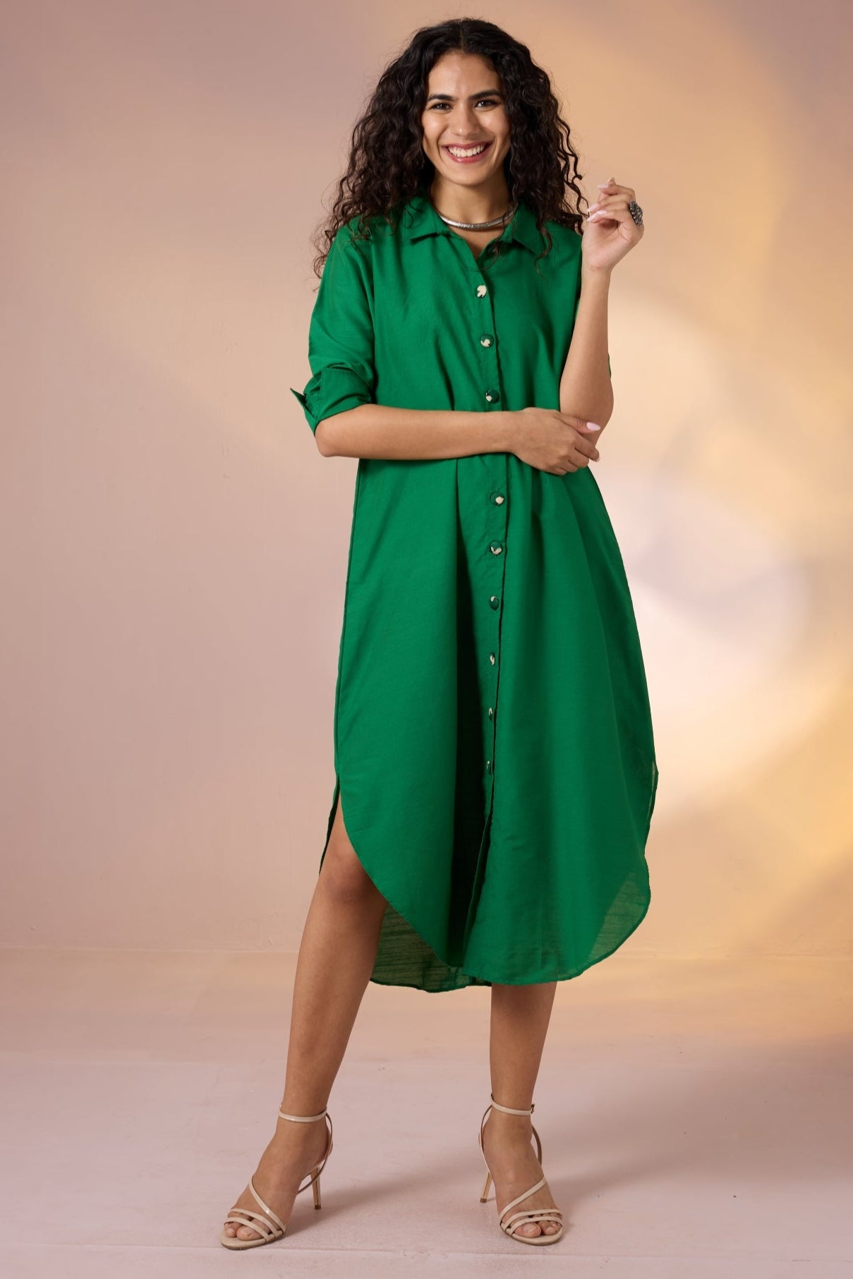 Crafted in earthy brown cotton, this shirt dress is a grounding piece with a hint of movement. The round hemline adds fluidity, while handmade contrast buttons bring artisanal charm. It’s structured yet soft—ideal for slow mornings and midweek café dates. A timeless neutral that pairs with everything, this dress feels like walking barefoot on warm soil. Style it with: tan sandals, gold studs, and a leather sling for understated ease on the go.