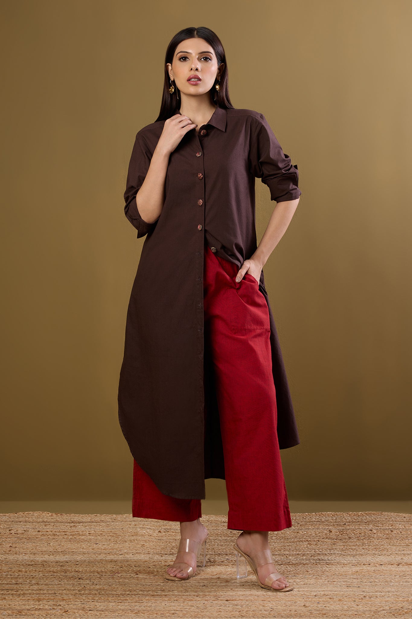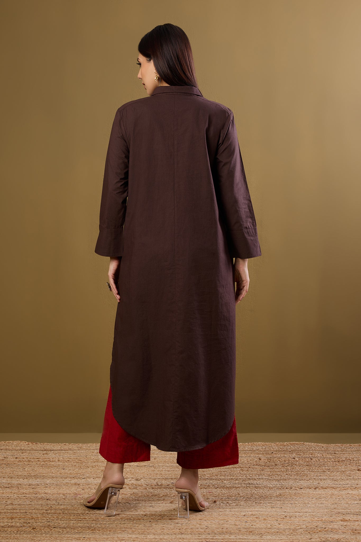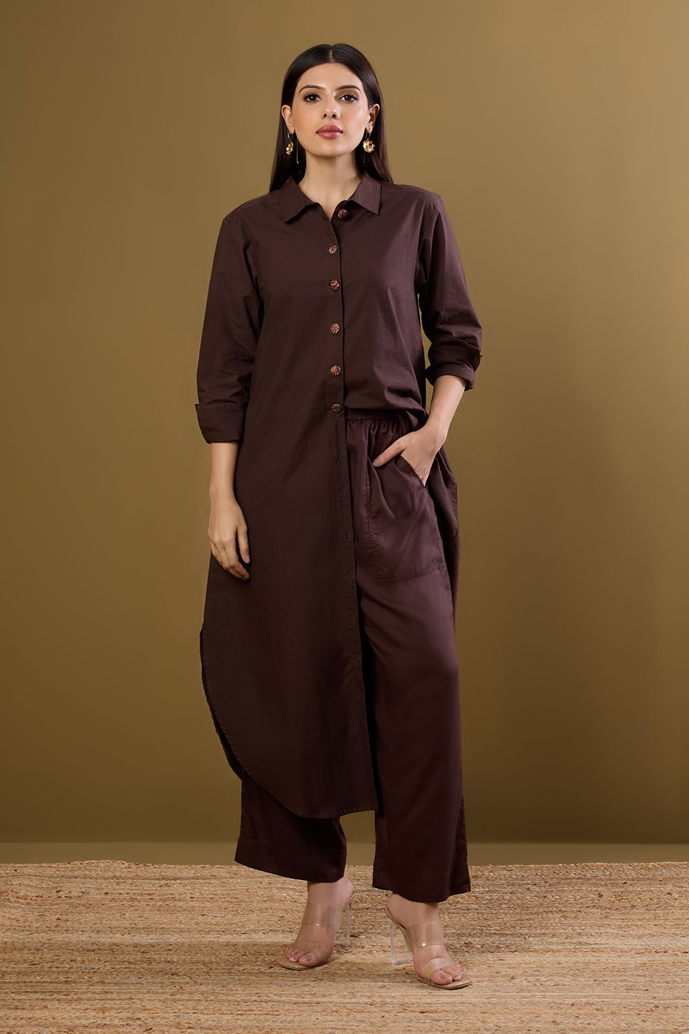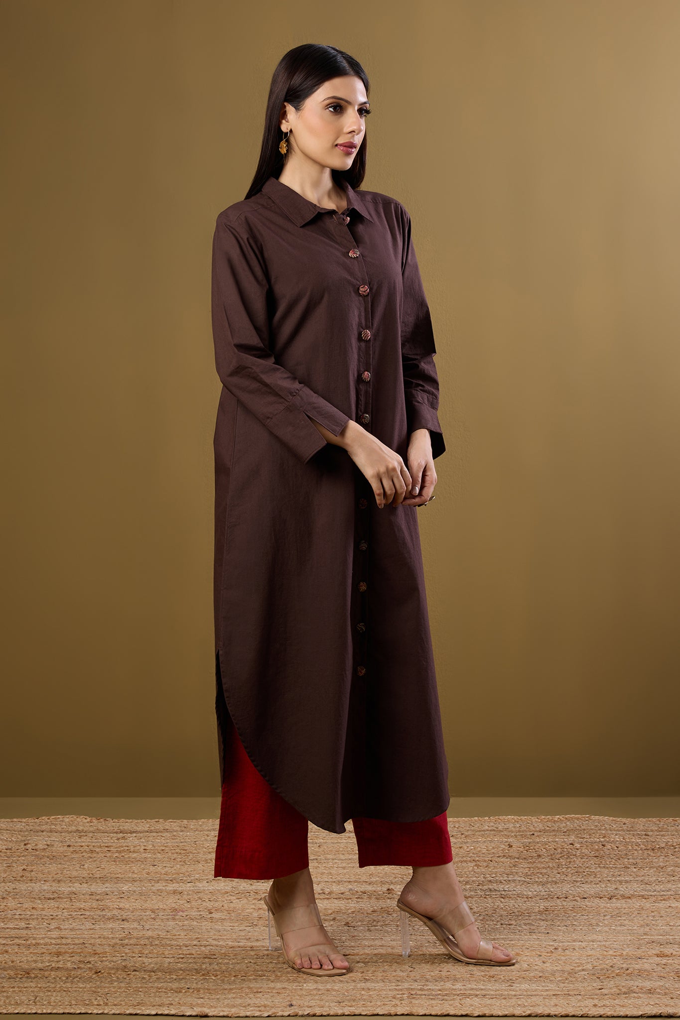 Long Shirtdress With Rounded Hem Coffee Brown Cotton  by Maati Crafts