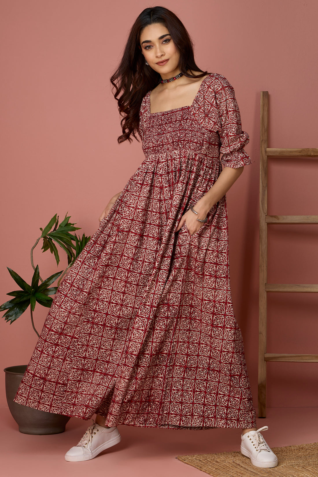 A stunning pintuck yoke anarkali in a celebratory hue of rich madder, hand block printed...