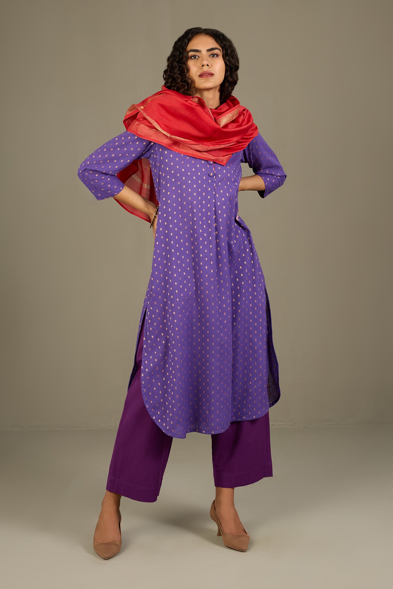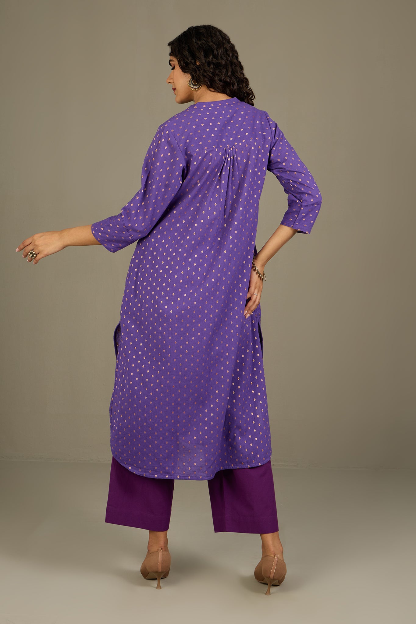 Fabric: Handcrafted in soft, breathable cotton for all-day comfort and ease. Handcrafted Elegance: Long kurta set in soft cotton with gold buttis, designed for modern workwear with a perfect blend of tradition and contemporary style.Features a stand collar neckline, front placket, and handmade buttons for a touch of artisanal craftsmanship. Impeccable finishing and attention to detail elevate the look for professional settings. Versatile Styling: Pair with bold heels and minimalist jewelry for a chic, polished look. Style with flats for a casual yet sophisticated vibe. Complete the ensemble with purple pants for a striking finish.