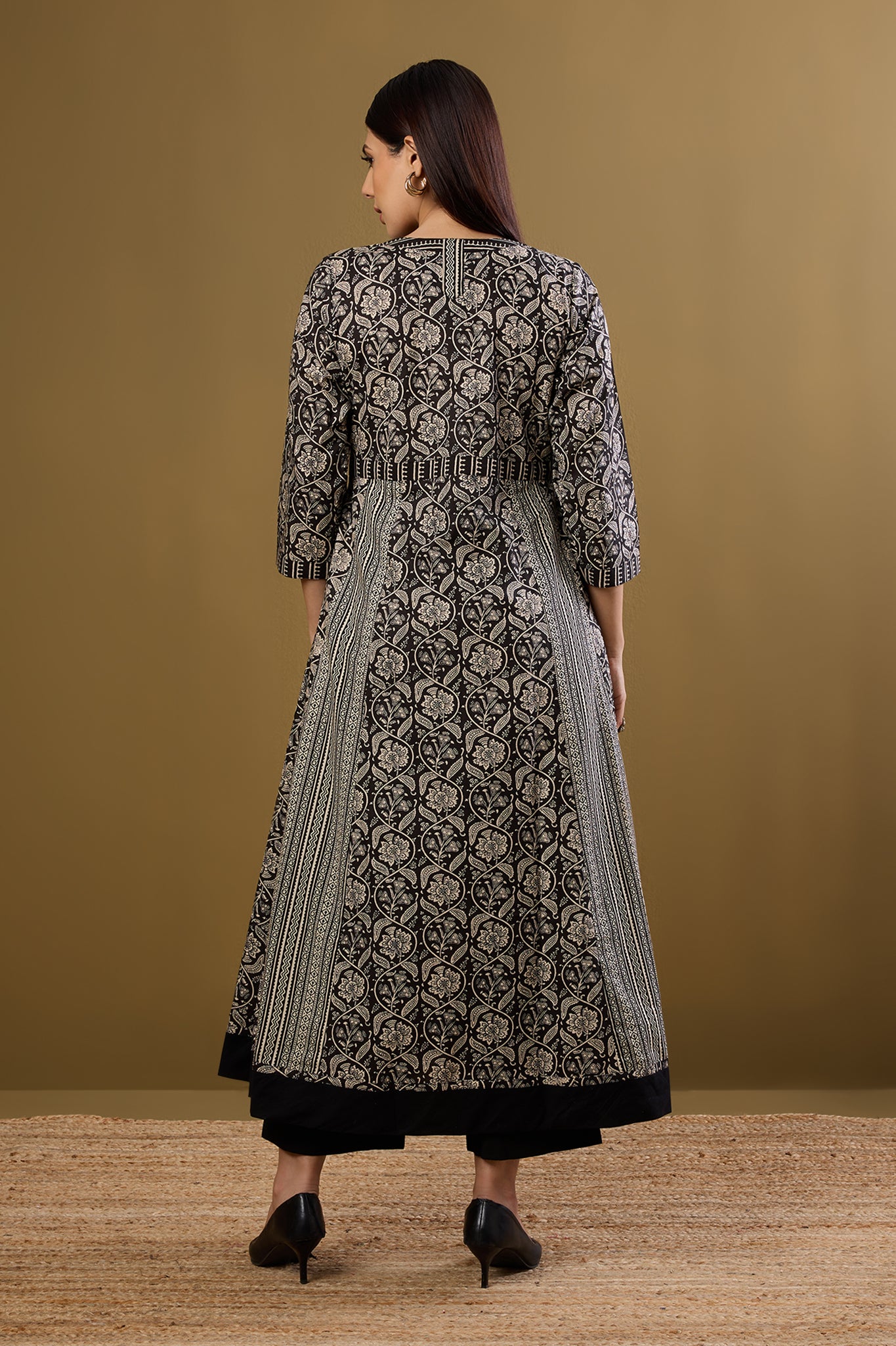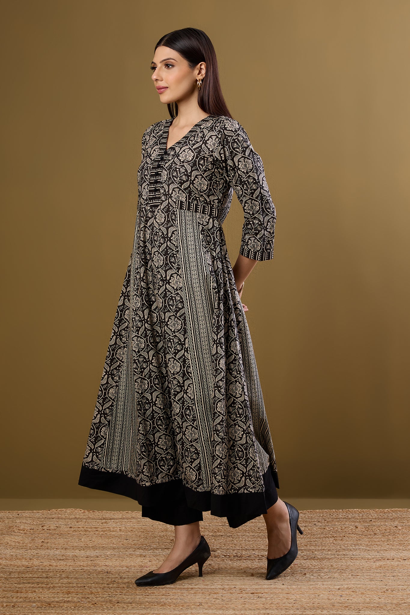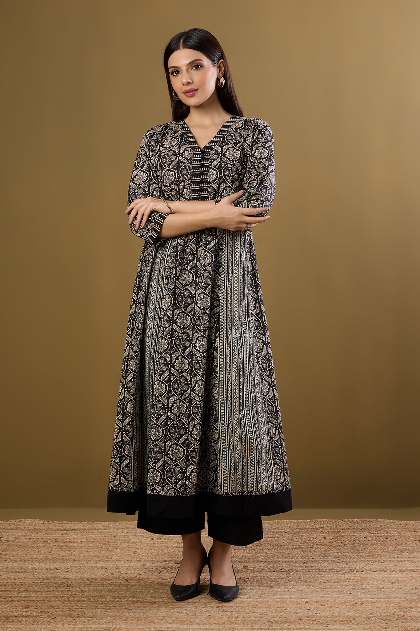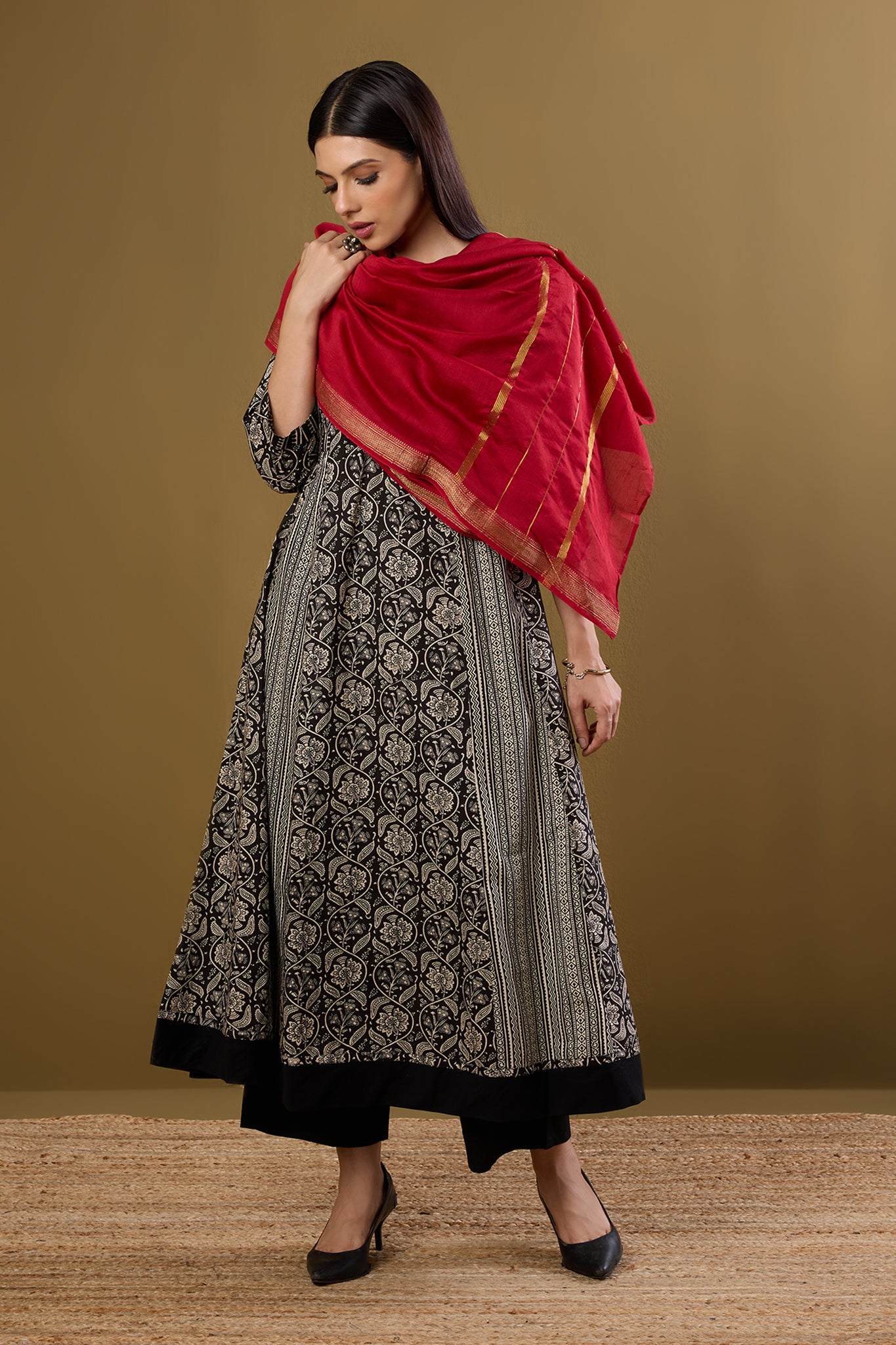 A soulful ode to tradition, this Ikat Anarkali blends the classic contrast of mustard and maroon with a serene, sufi-inspired charm. Handcrafted in breathable cotton, it features delicate green floral embroidery on the placket, adding a refined touch of detail. The silhouette is designed for both elegance and ease—complete with a cinched waist, soft flare, and 3/4th sleeves for a flattering, everyday fit. Whether you're dressing up for a gathering with a Chanderi dupatta or keeping it minimal with Kolhapuris, this versatile piece transitions effortlessly from work to celebration. Rooted in craft, elevated in comfort—this Anarkali is a Maati essential.