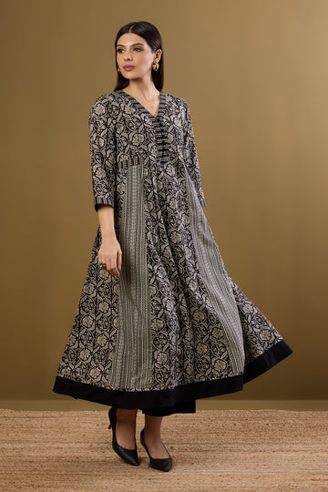 Sufi Style Fit And Flared Anarkaliin Mono White Black Print by Maati Crafts