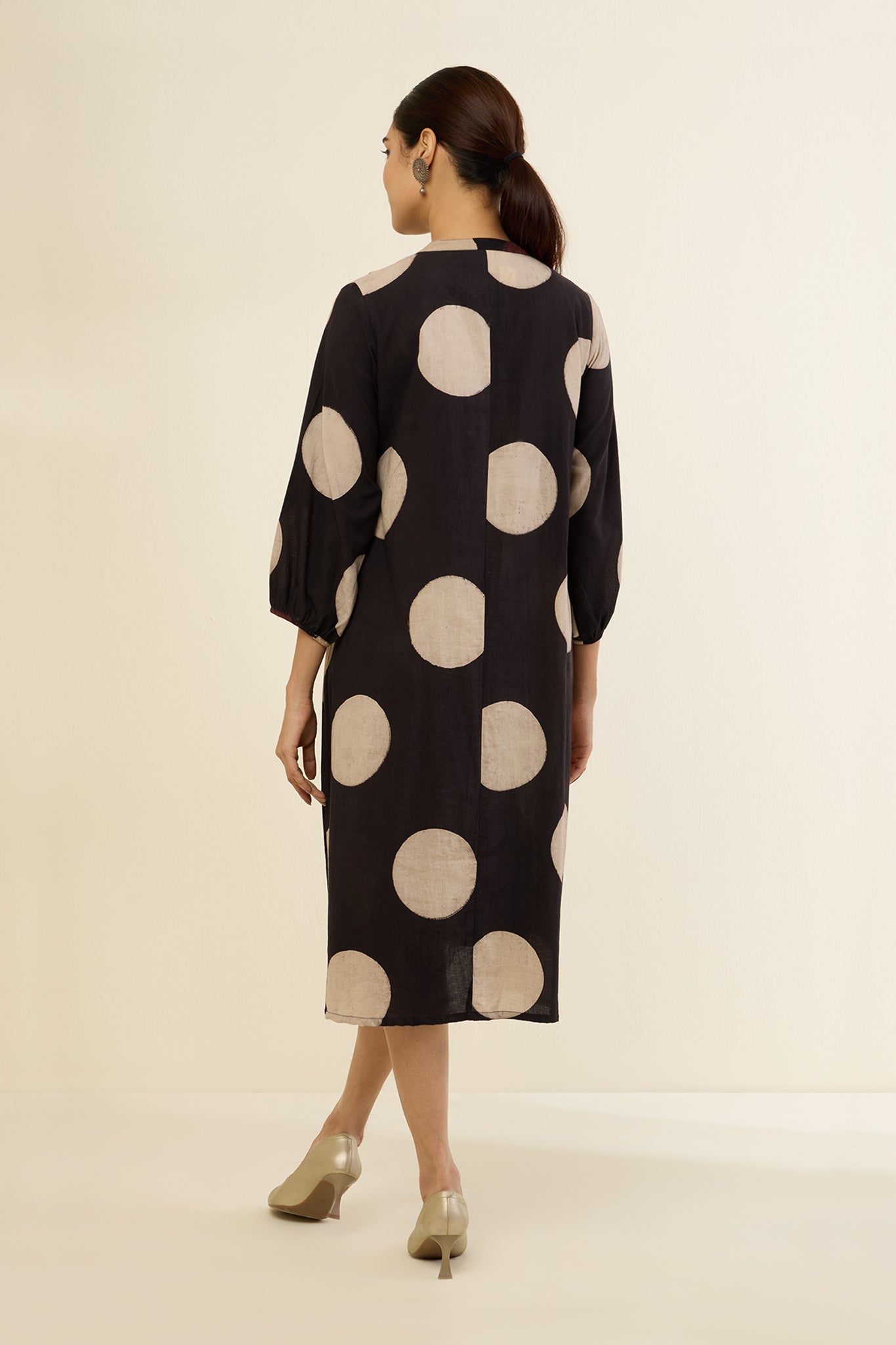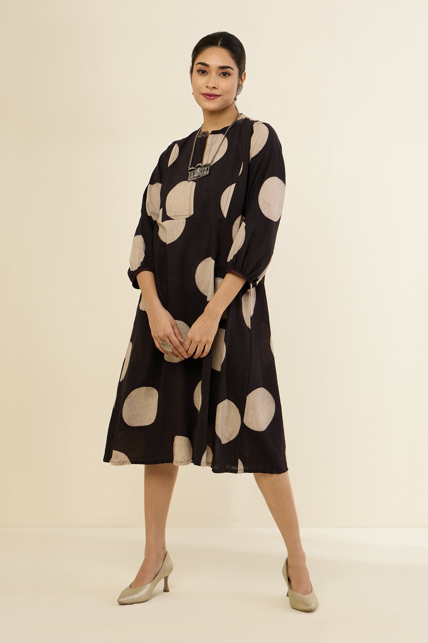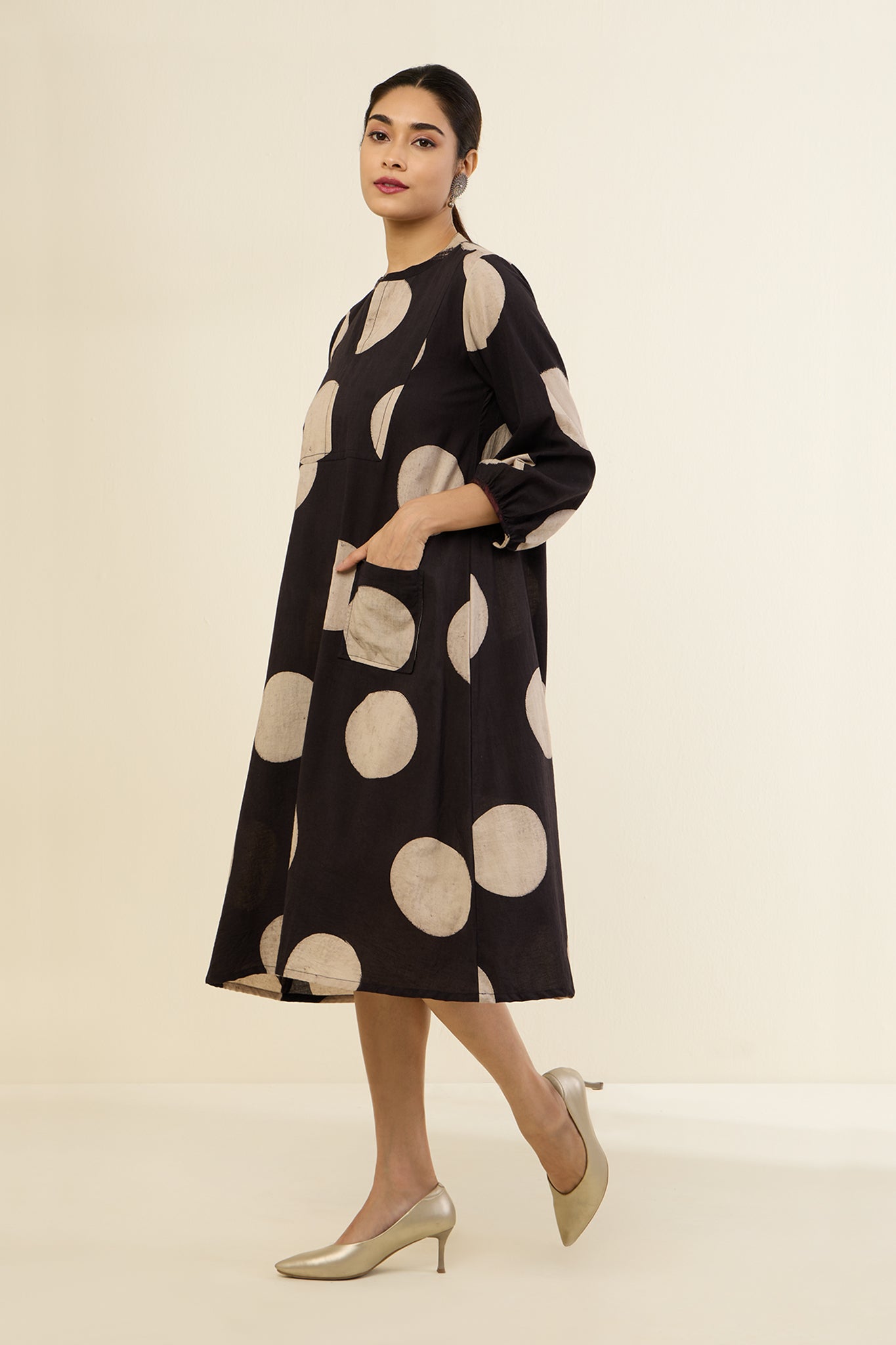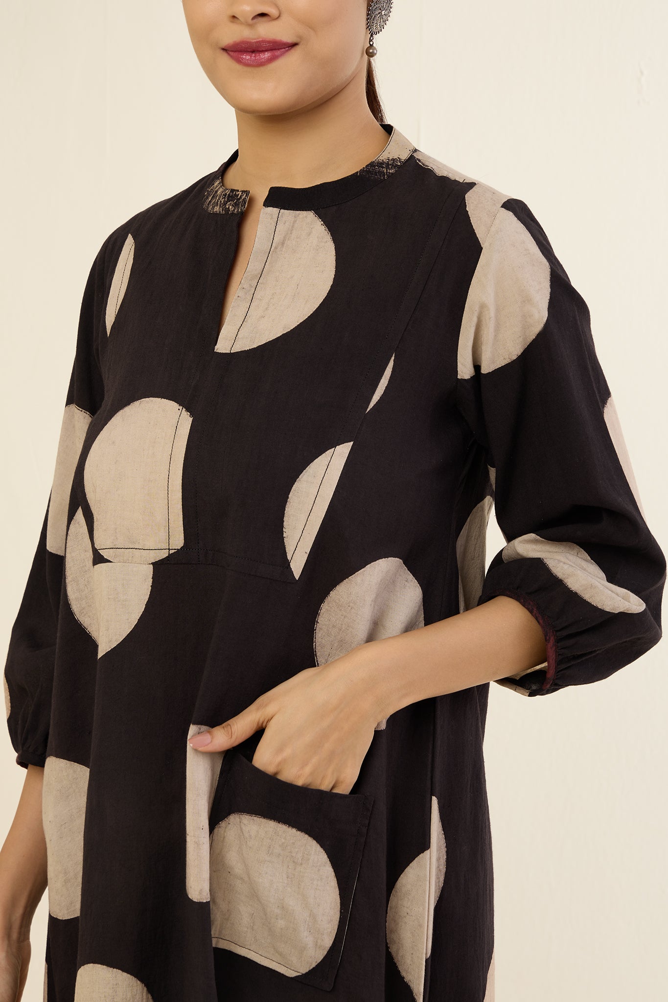 Introducing our 100% Cotton Dress, hand block-printed with the intricate Ajrakh technique. Hues of brownish-black with bold circles create a unique pattern that embodies traditional artistry. This dress features yoke details, sleeves with delicate gather accents, and practical patch pockets, blending structured yet relaxed elegance for everyday comfort. With a flattering round neckline and a well-tailored fit, it effortlessly transitions from day to evening. Style it solo or pair with black pants for a polished workwear ensemble, ideal for those who appreciate minimalist elegance and cultural heritage. Styling Tips: Casual Chic: Pair the dress with tan or brown leather sandals and a wide-brimmed straw hat for a relaxed and stylish look perfect for a day out or casual gatherings. Add a woven tote bag and sunglasses to complete the ensemble. Office Ready: Layer the dress with a tailored blazer in a complementary color such as navy or charcoal gray. Opt for closed-toe pumps or loafers and accessorize with minimal jewelry and a structured handbag for a professional yet elegant appearance. Evening Elegance: Transition to evening by accessorizing with statement earrings, a metallic clutch, and strappy heels in a matching tone. Style your hair in loose waves or an elegant updo to complement the sophisticated look, perfect for dinners or special occasions.