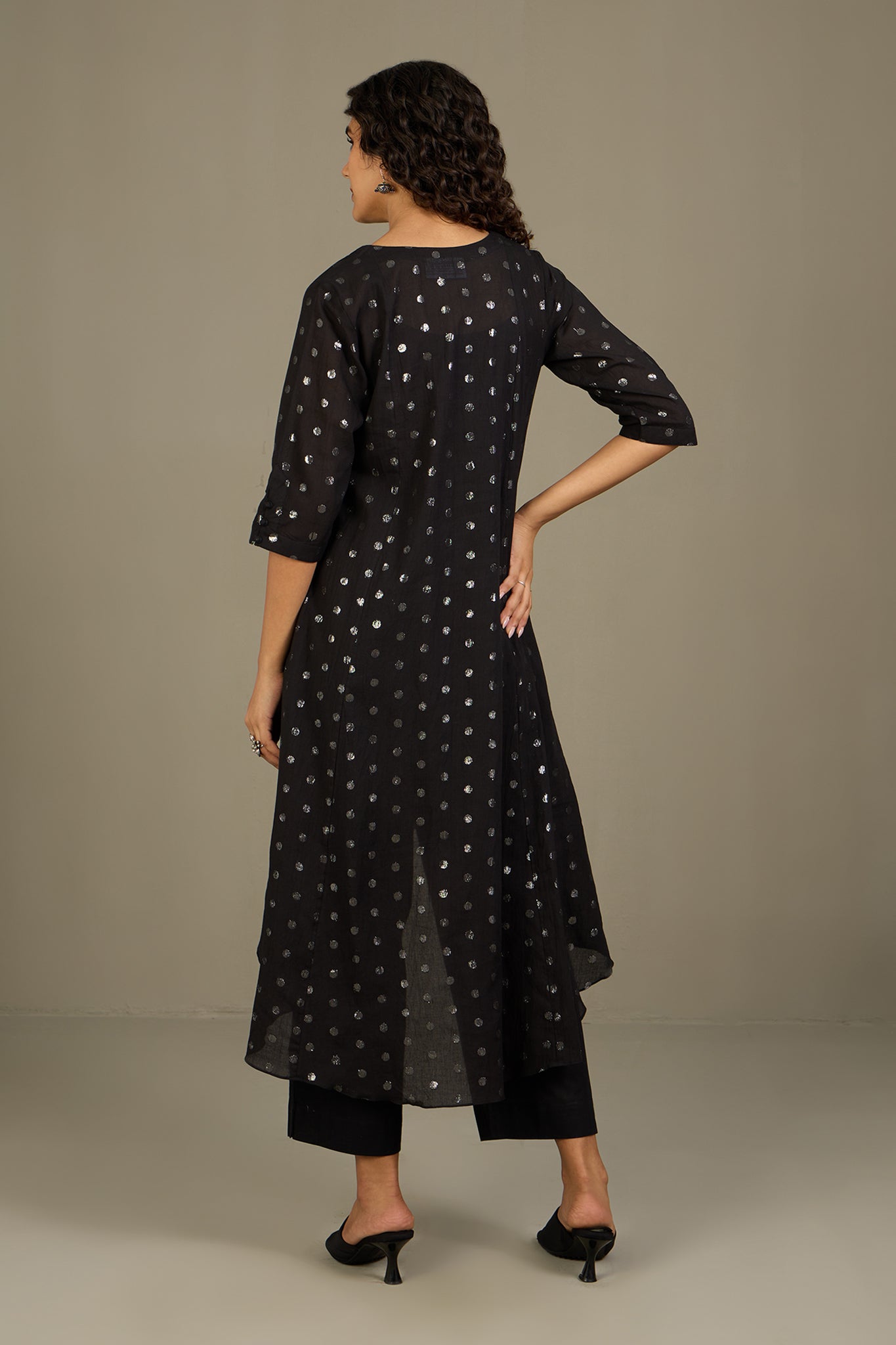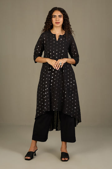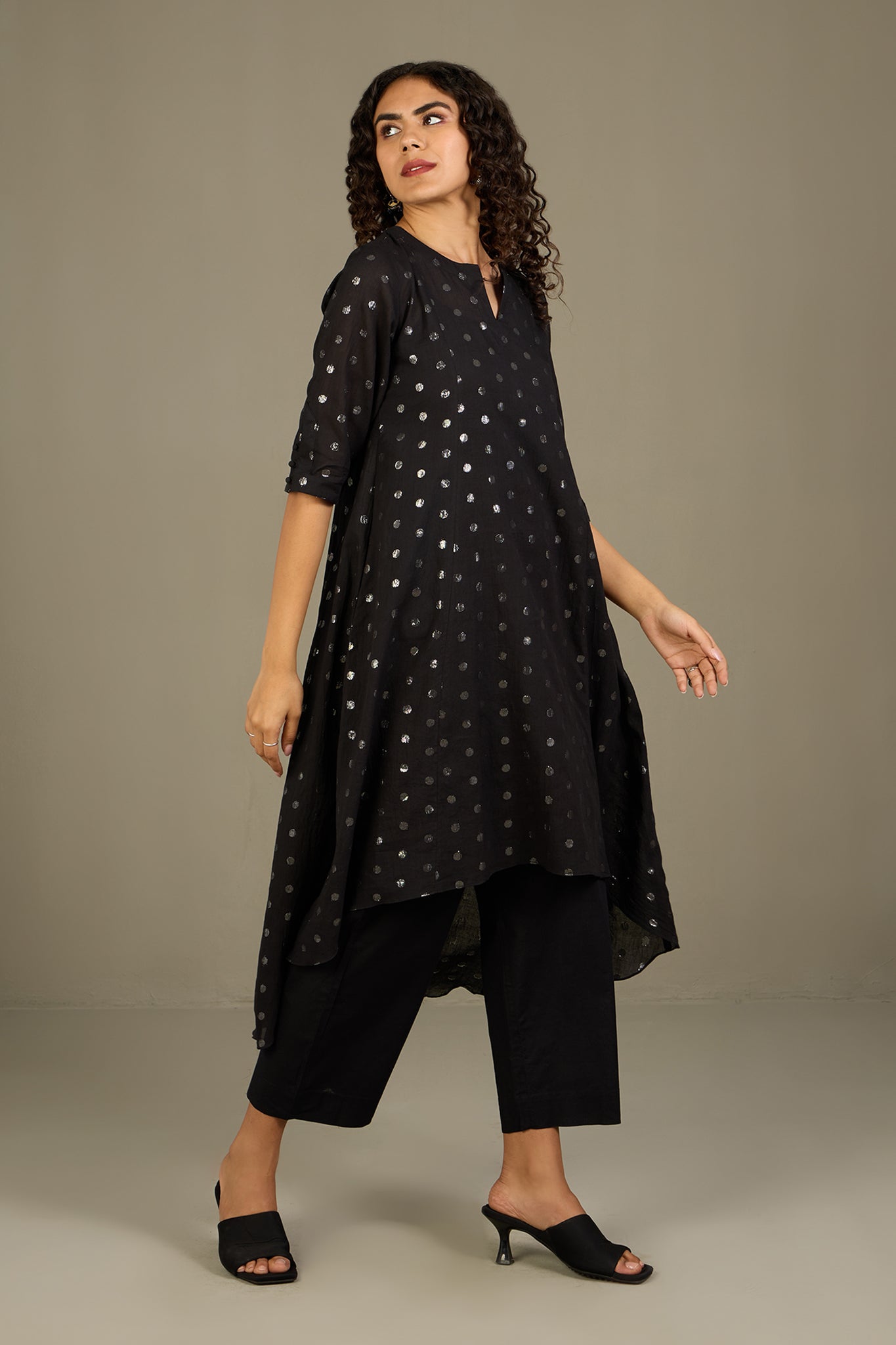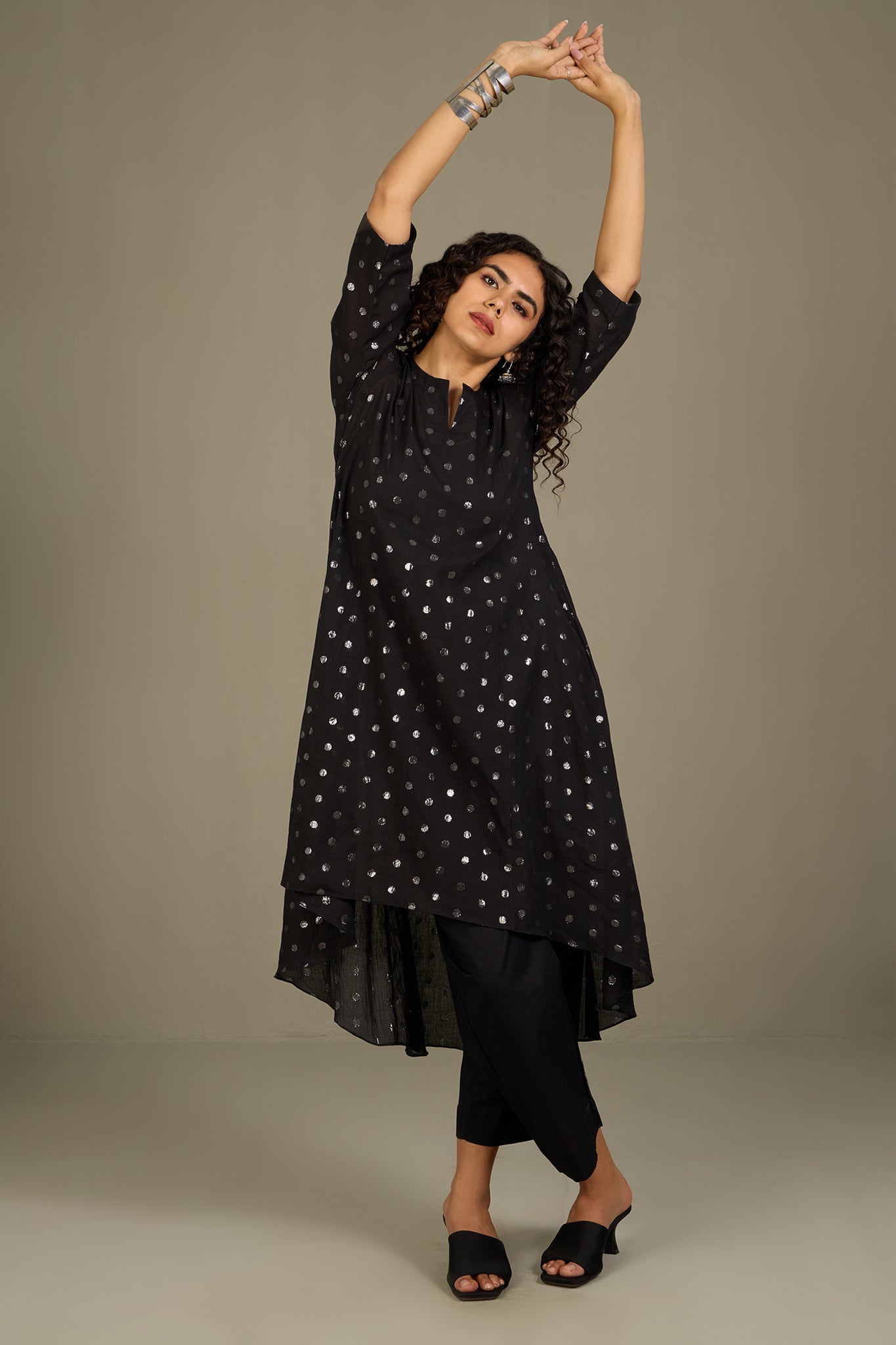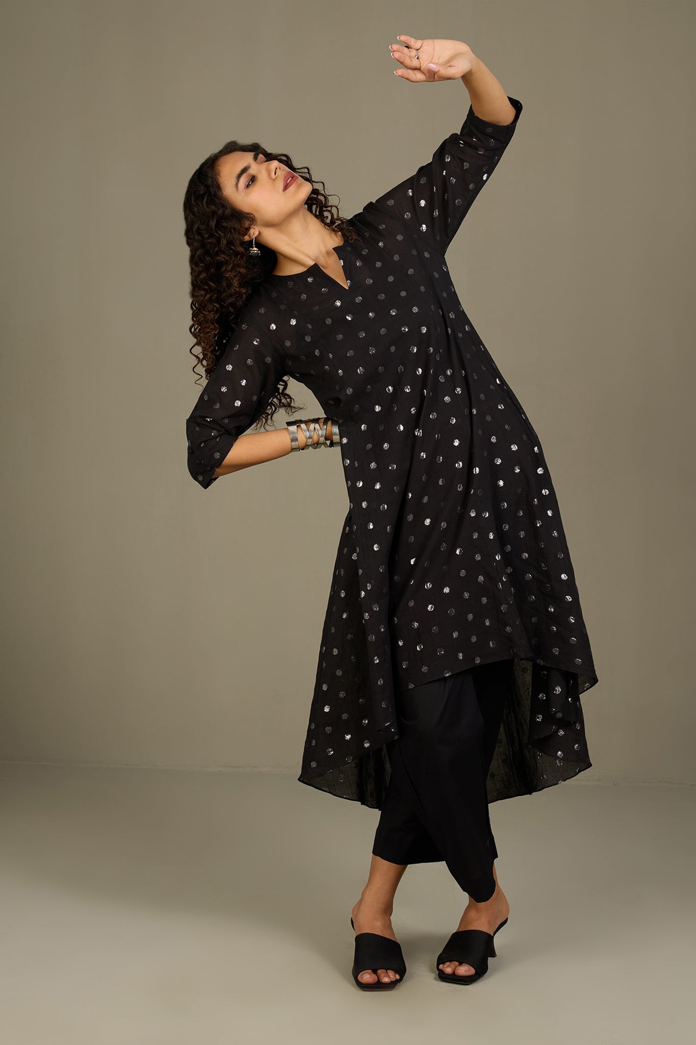 Elevate your casual daywear with our Waterfall Asymmetrical Kurta in rich hues of black and silver polka. Adorned with delicate polka dots, this kurta blends comfort with sophistication. Crafted from soft, luxurious cotton fabric, it features a tailored fit and a modern silhouette, perfect for pairing with pants or wearing alone as a stylish dress. The elegant neckline and 3/4th sleeves add a touch of refinement, making it ideal for effortless, everyday chic. Whether you're heading to a casual outing or seeking a refined look, this kurta offers both versatility and elegance in one exquisite piece.