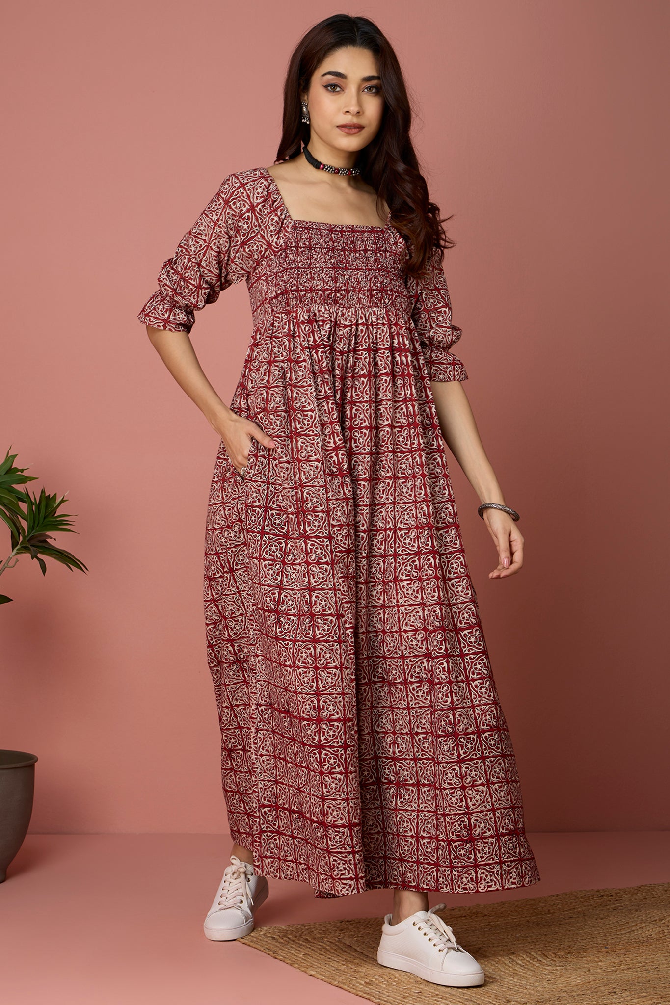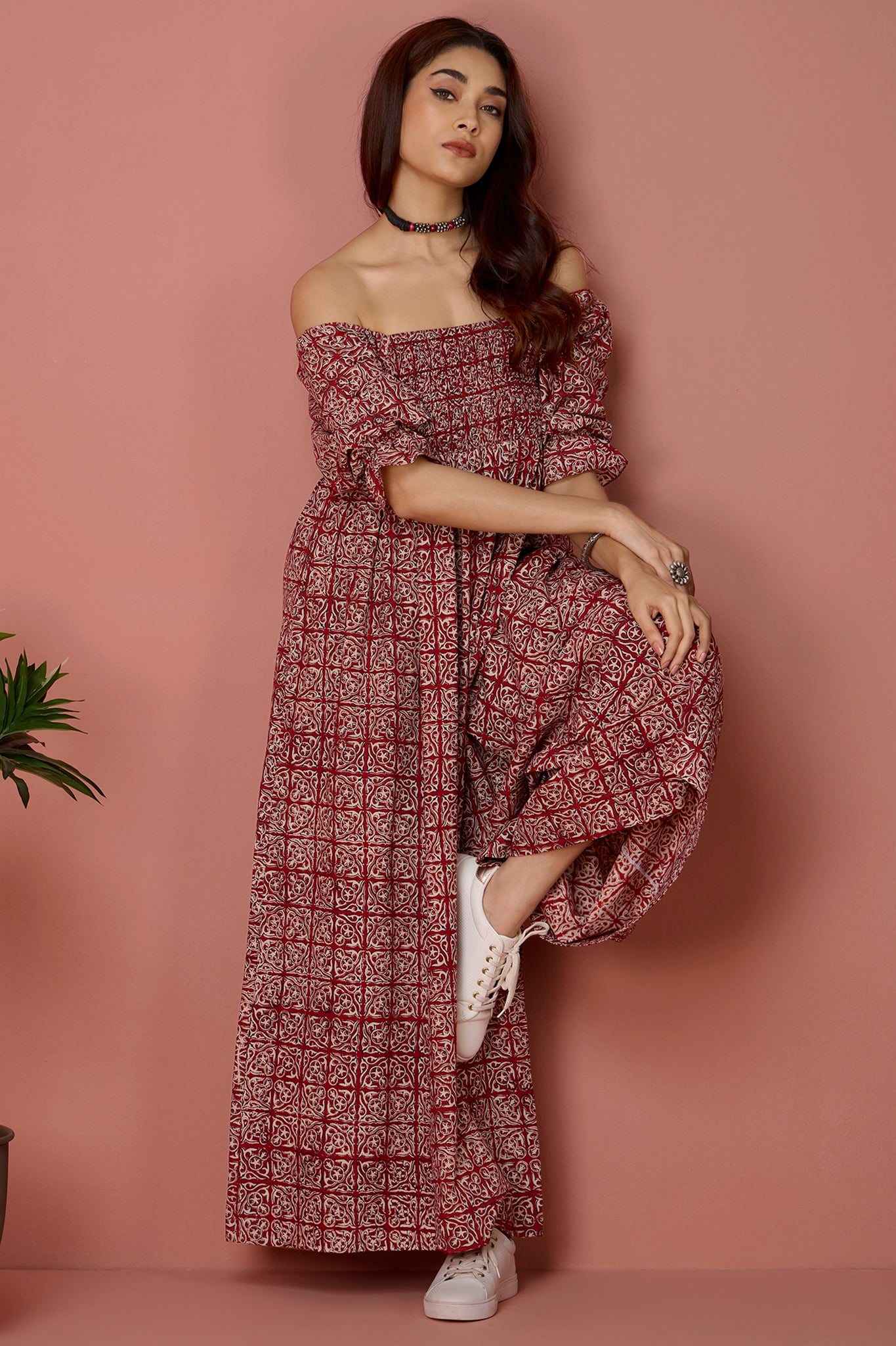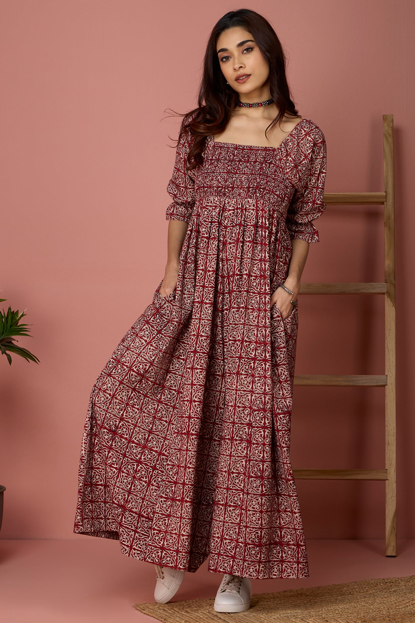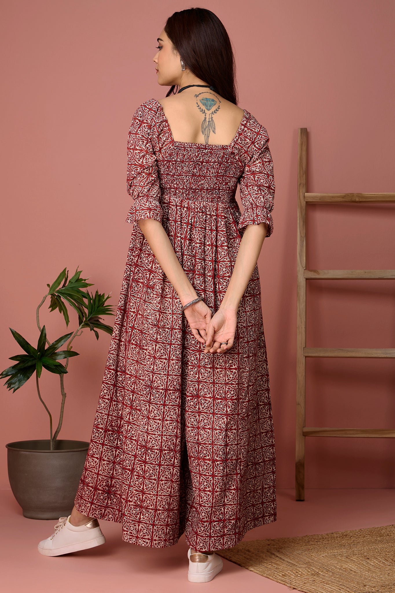 - Craftsmanship: Immerse yourself in the superior craftsmanship of this soft cotton jumpsuit, showcasing hues of madder red. Handblock printed with the traditional Bagh technique from Madhya Pradesh, each detail reflects meticulous artistry, making it a bestseller.