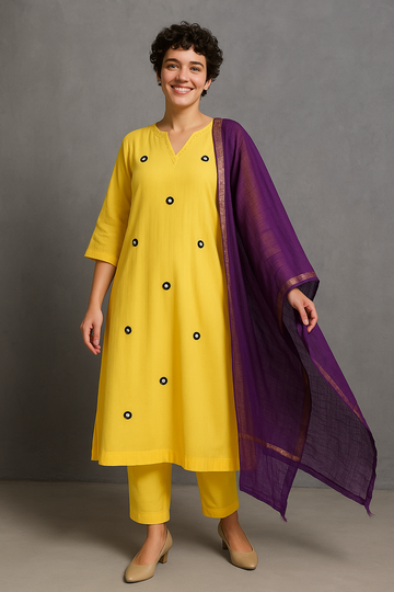 Introducing our captivating mellow yellow a-line kurta with side gathers, a modern interpretation of timeless elegance. Adorned with a charming neckline and intricate gather detail on the placket, it exudes sophistication. Accentuated by delicate hand mirrorwork embroidery in hues of purple , this ensemble emanates understated glamour. Pair it with monotone trousers, available separately, for a bold yet refined look. Elevate your ensemble with a stunning maheshwari purple dupatta, perfect for summery brunches or family gatherings. Crafted from soft modal, adorned with delicate work, it's gentle on the skin and boasts summery green hues. Inspired by modern Mughal aesthetics, this Anarkali embodies timeless elegance with a contemporary twist.
