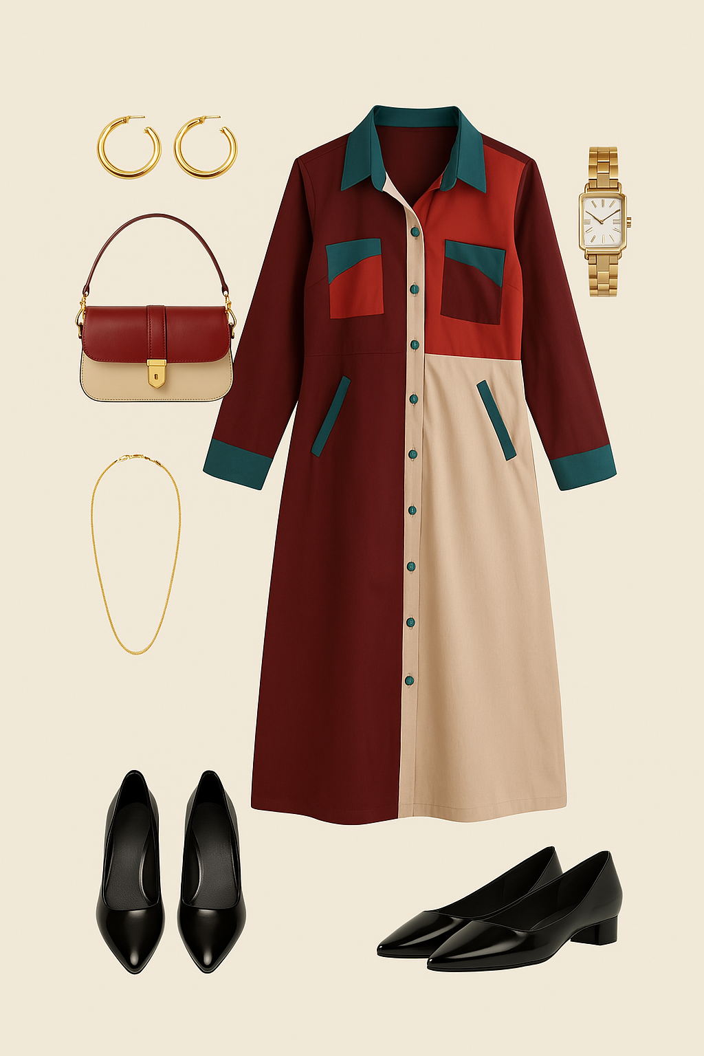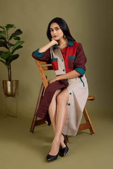 Step into understated elegance with our Earthy hues beige rust & teal colour block long Shirt Dress, a bold take on a classic design. Featuring a front button-down closure, collared neckline, a long sleeves with details, this dress offers a polished, tailored fit. The modern silhouette, it as versatile as it is chic. Crafted in earthy hues with bold combination, it’s perfect to wear as a standalone dress or styled over a trench and denim for a modern layered look. This piece blends timeless sophistication with everyday versatility. Styling Tips: As a dress: Pair with ankle boots and a hat for an elevated casual look. Layered: Style over a white shirt and slim-fit jeans, adding loafers for a chic, contemporary vibe. A wardrobe essential that adapts seamlessly to any occasion!