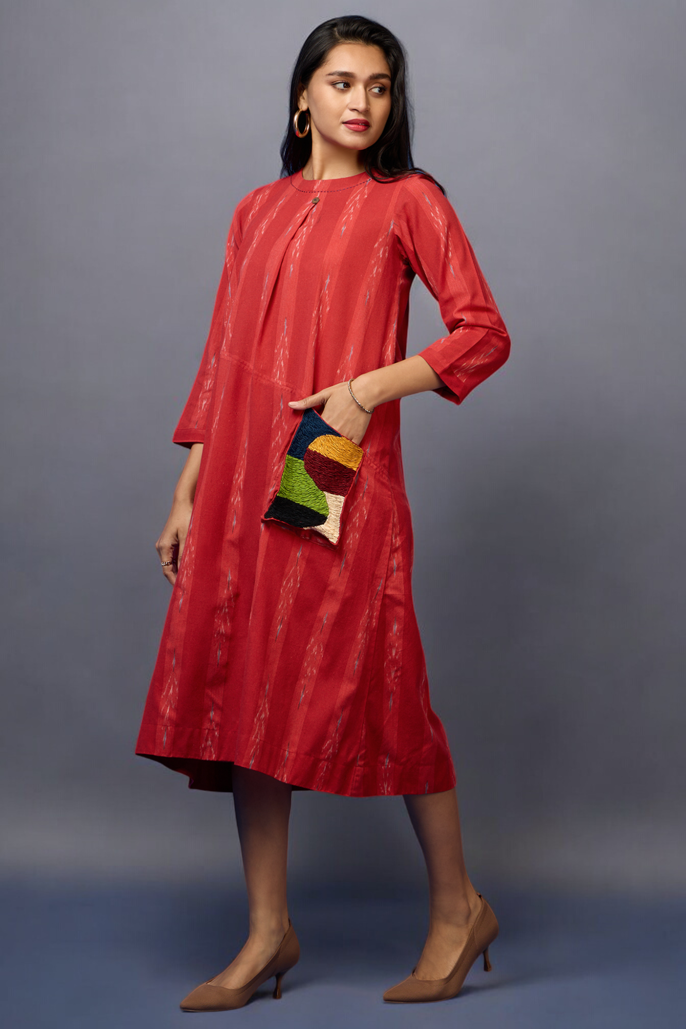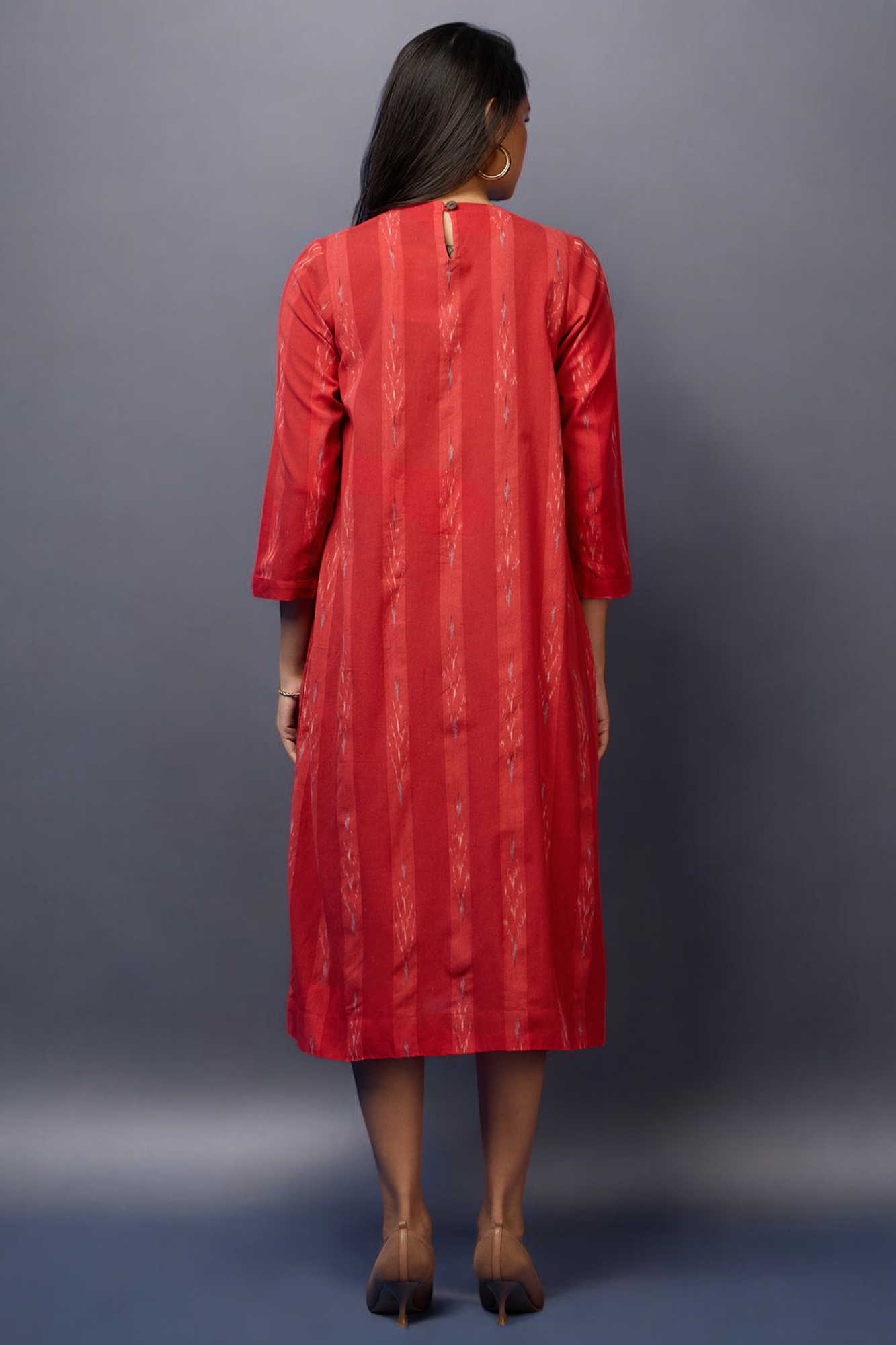 • CraftsmanshipThe orangish-red midi dress is a testament to meticulous craftsmanship, featuring a striking blend of colors.