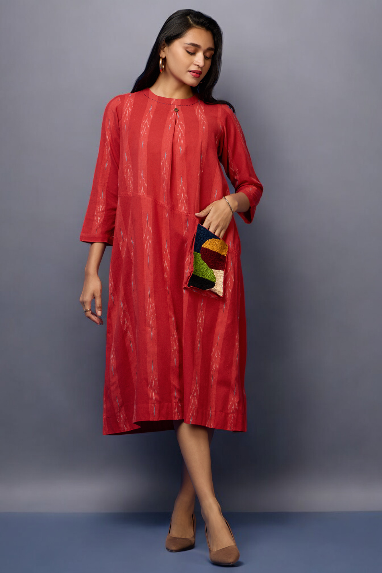 Styling Tip: Elevate your fashion game effortlessly with this orangish-red midi dress. For a laid-back holiday look, pair it with woven sandals, and oversized sunglasses. To seamlessly transition into a sophisticated work ensemble, slip into your favorite heels, add a statement belt, and carry a structured tote. Let your personal style shine by experimenting with accessories that complement the dress's vibrant hues. This bestseller from Maati promises not just comfort and style but endless possibilities for expressing your unique fashion sense.