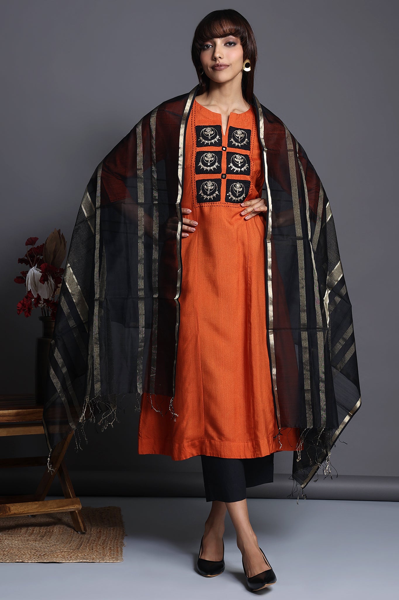 Introducing our Statement Kurta, the epitome of elegance and a must-have for the festive season. Crafted in vibrant hues of orange viscose silk, this kalidar kurta is a true fashion statement. The yoke is adorned with hand applique featuring intricate embroidered black gold patchwork inspired by the chandbalis, perfectly complemented by dainty black mirrorwork, adding a touch of glamour.