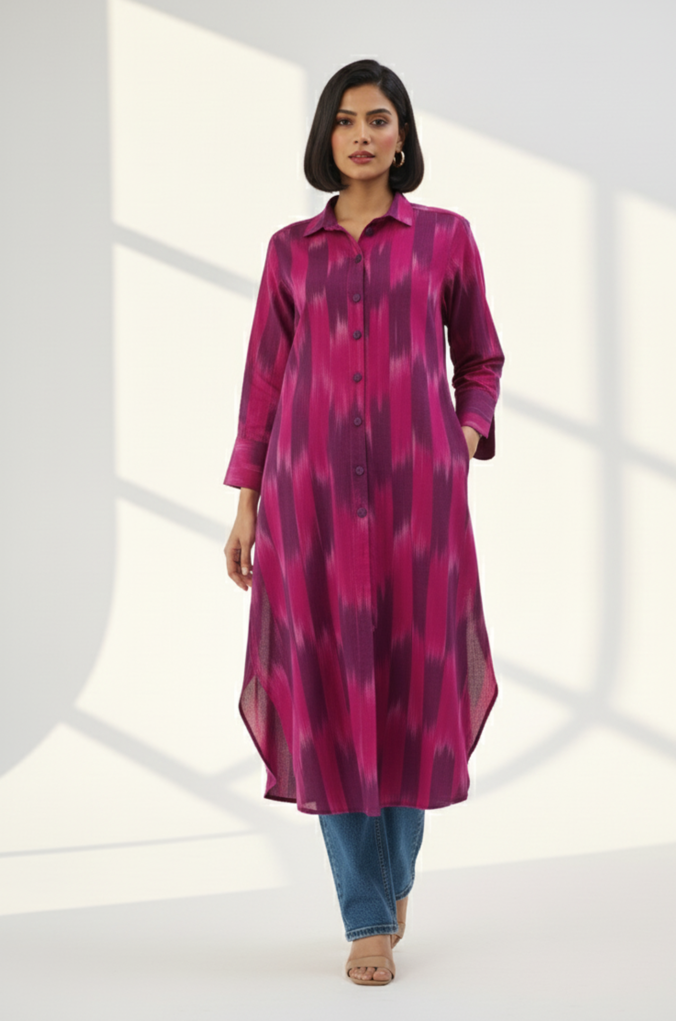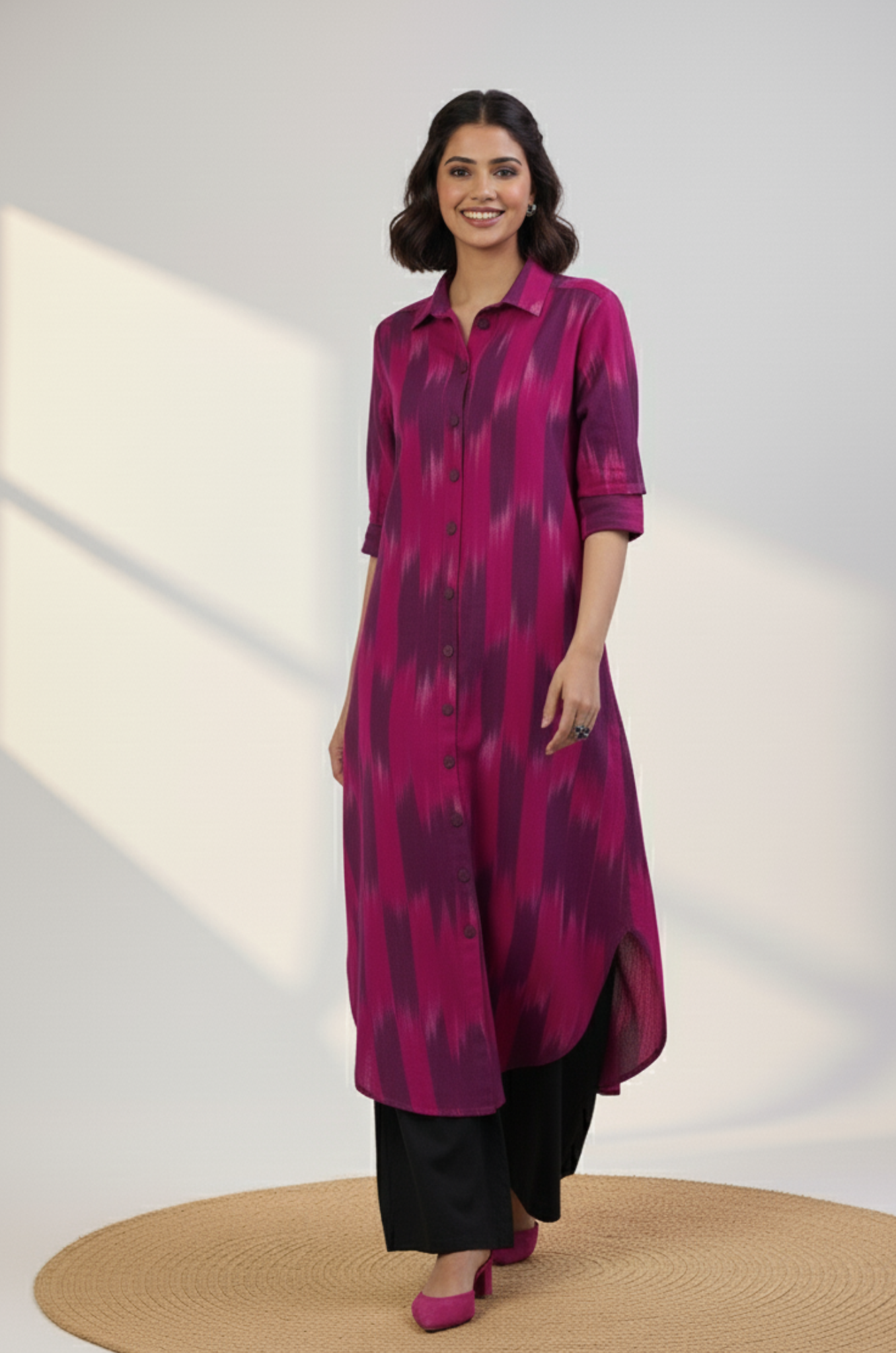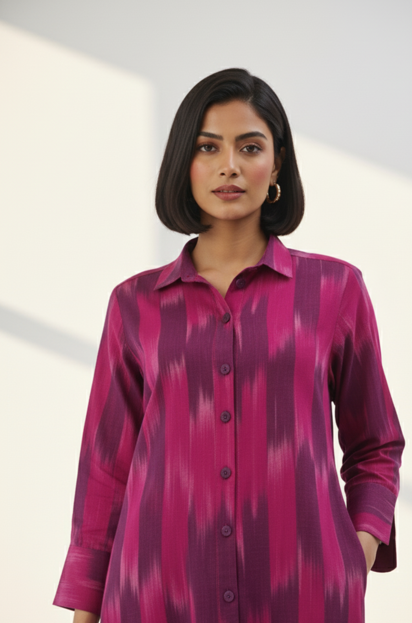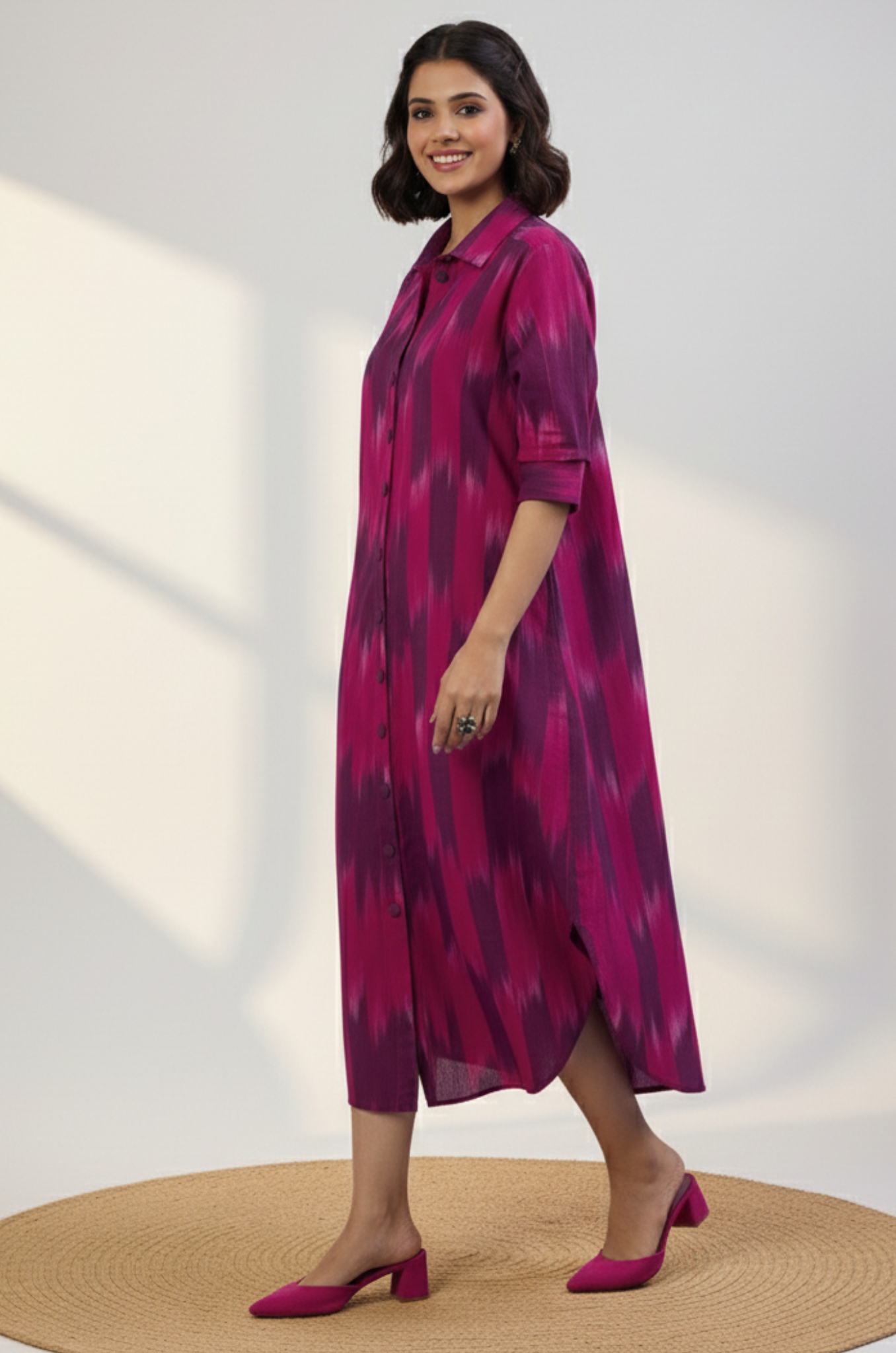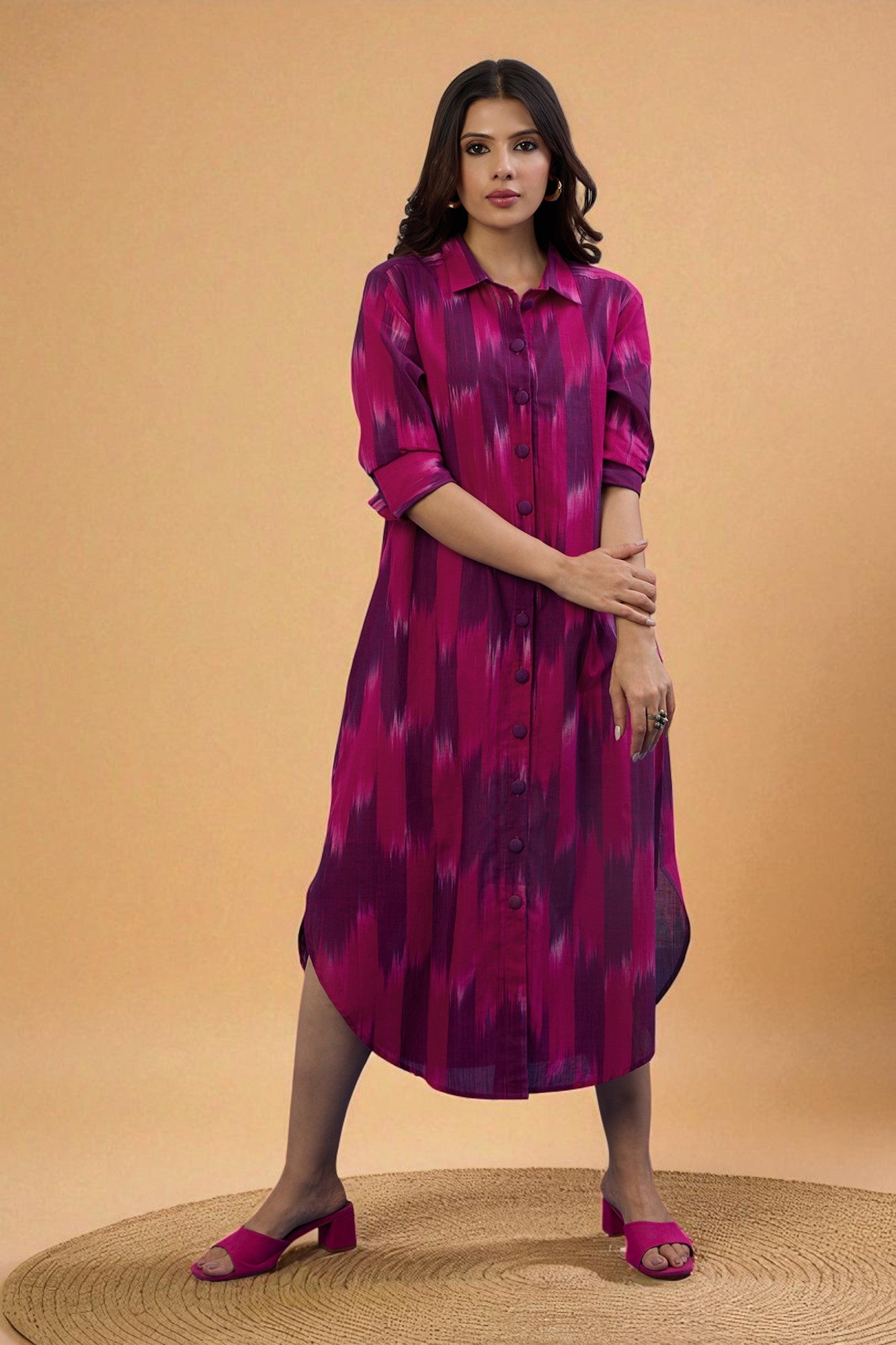 Bright, bold, and beautifully effortless, this Pink & Purple Ikat Shirt Dress is where tradition meets modern ease. Crafted in breathable 100% cotton, it flows with a button-down front and a graceful round hemline that flatters every move.Its vivid ikat hues bring a playful edge, while its versatility makes it a true wardrobe chameleon: wear it as a standalone dress for a polished finish, or style it open as a jacket to add instant flair.More than just a dress, t’s a mood, a statement, and a companion for every occasion.