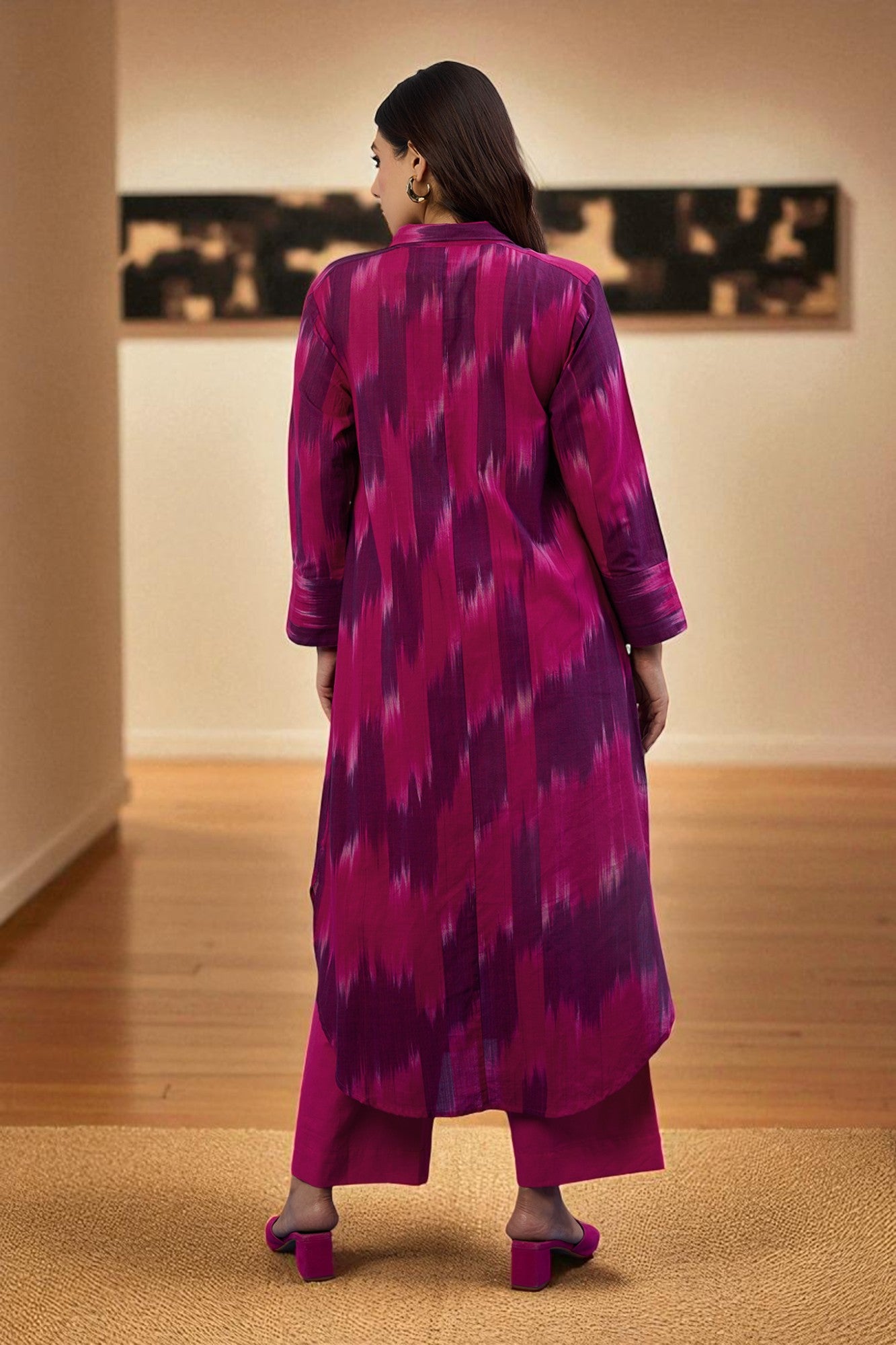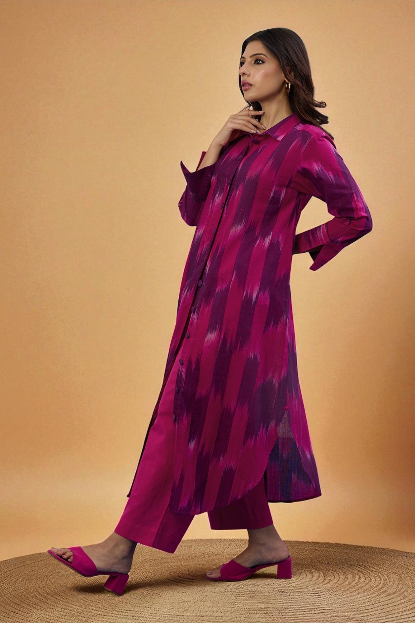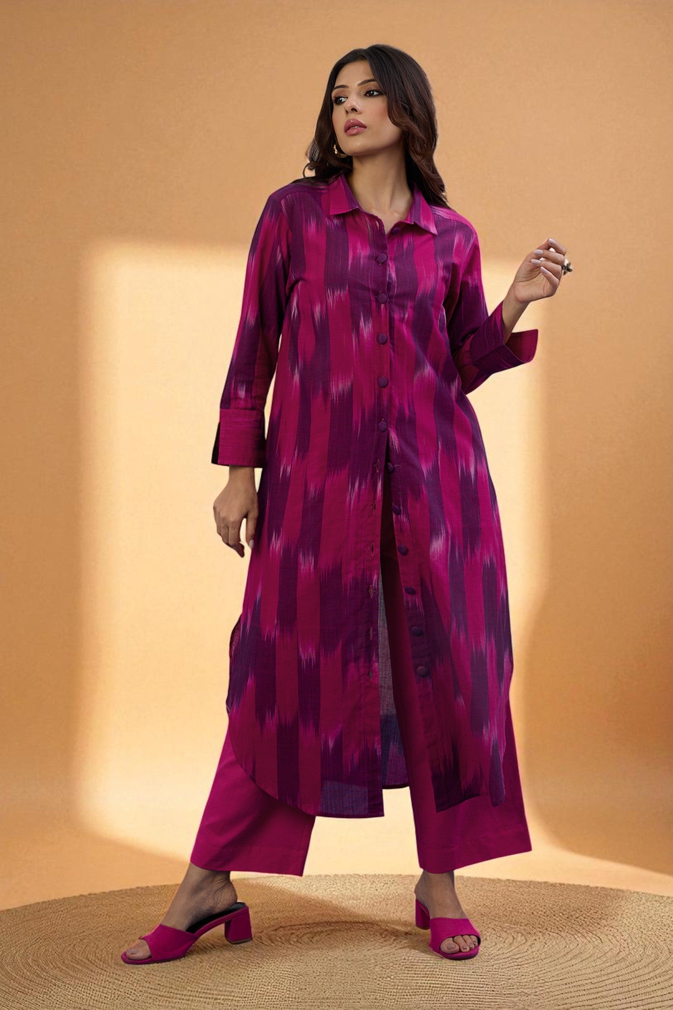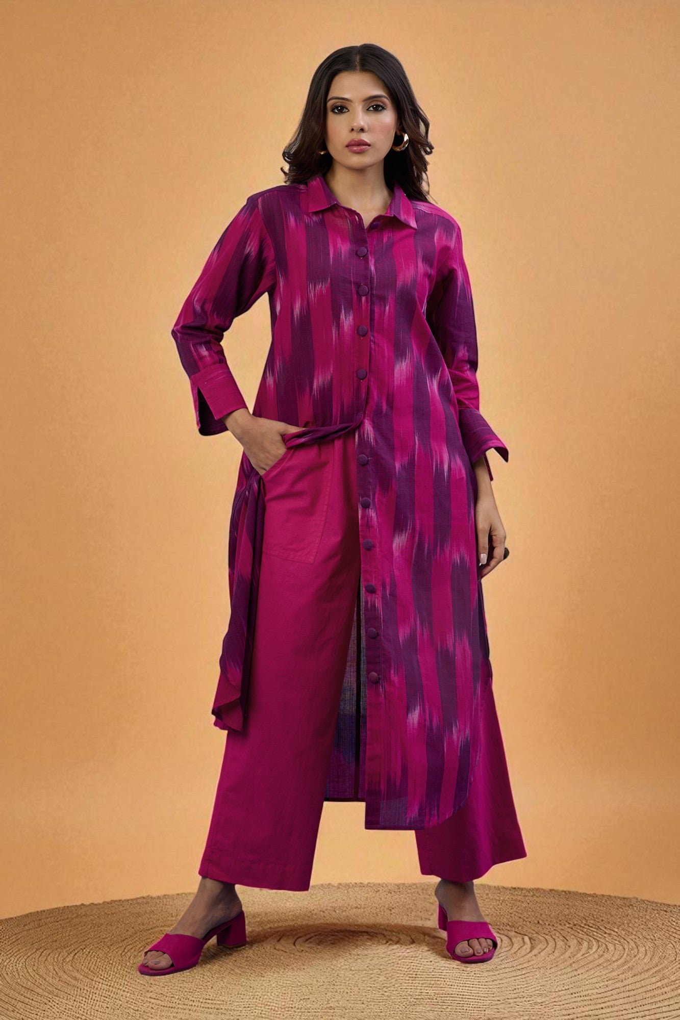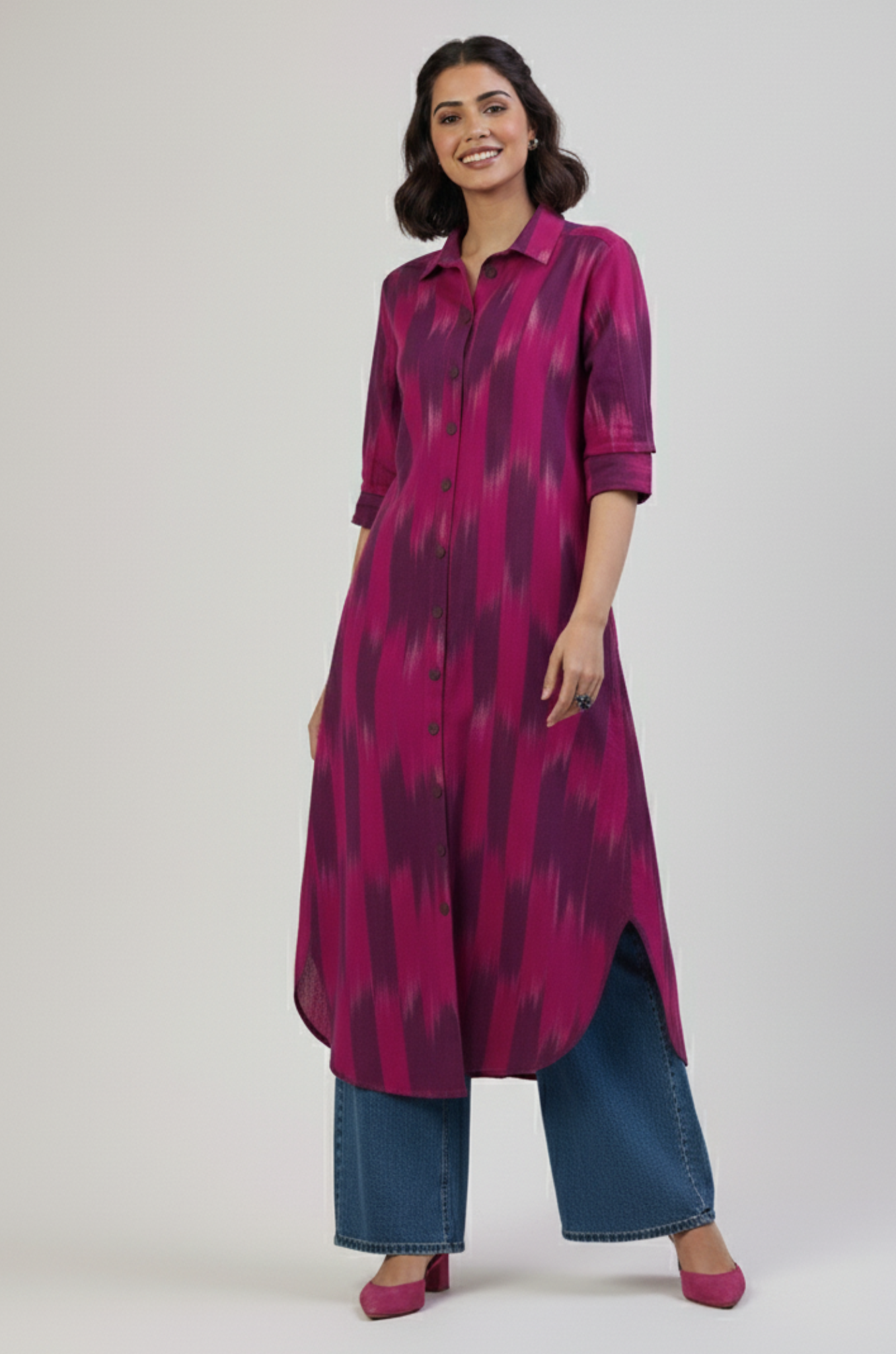 Bright, bold, and beautifully effortless, this Pink & Purple Ikat Shirt Dress is where tradition meets modern ease. Crafted in breathable 100% cotton, it flows with a button-down front and a graceful round hemline that flatters every move.Its vivid ikat hues bring a playful edge, while its versatility makes it a true wardrobe chameleon: wear it as a standalone dress for a polished finish, or style it open as a jacket to add instant flair.More than just a dress, t’s a mood, a statement, and a companion for every occasion.