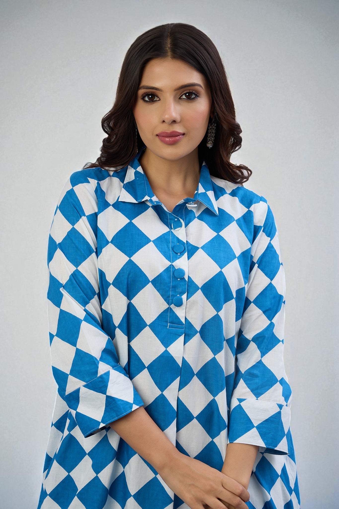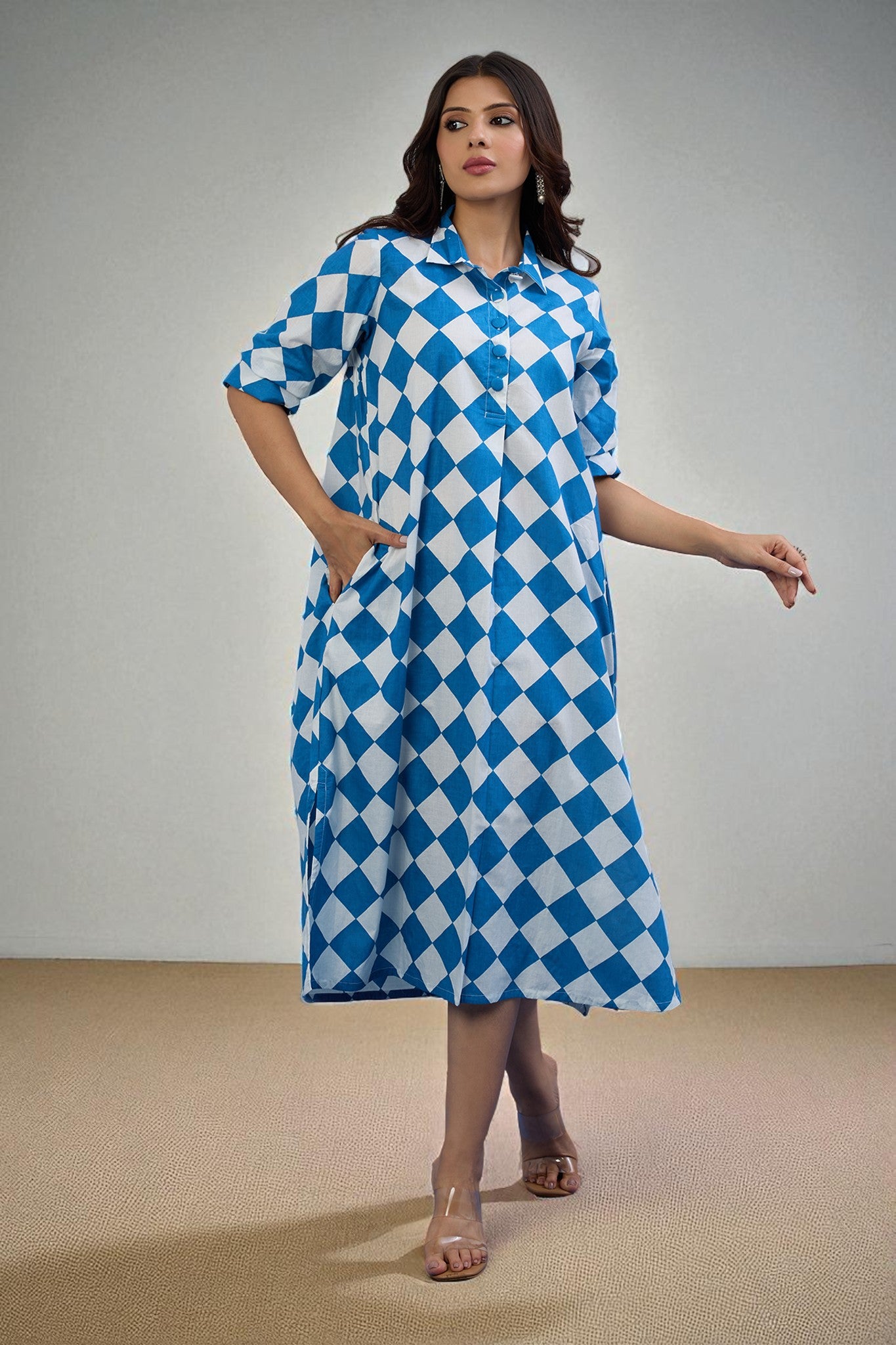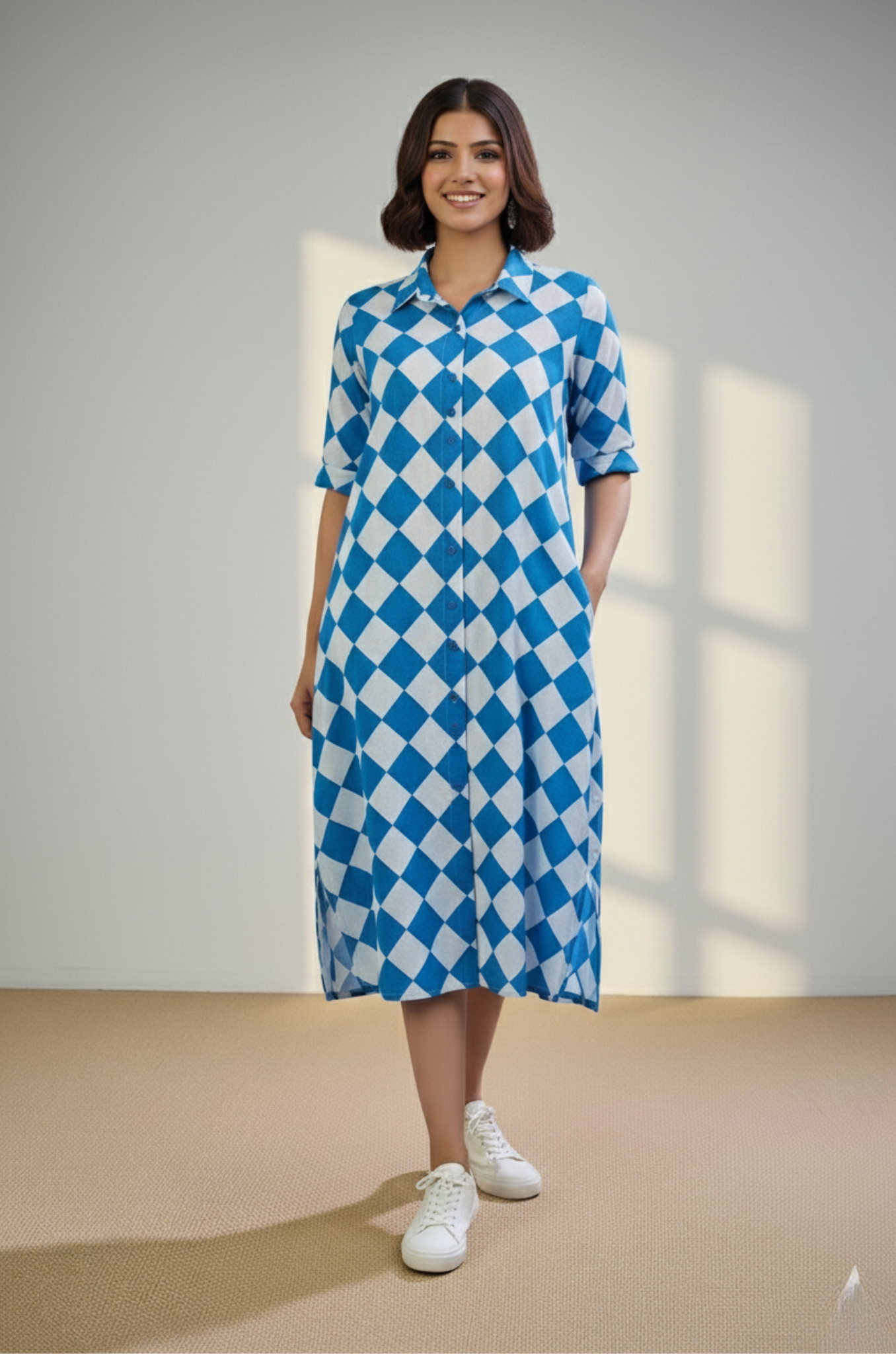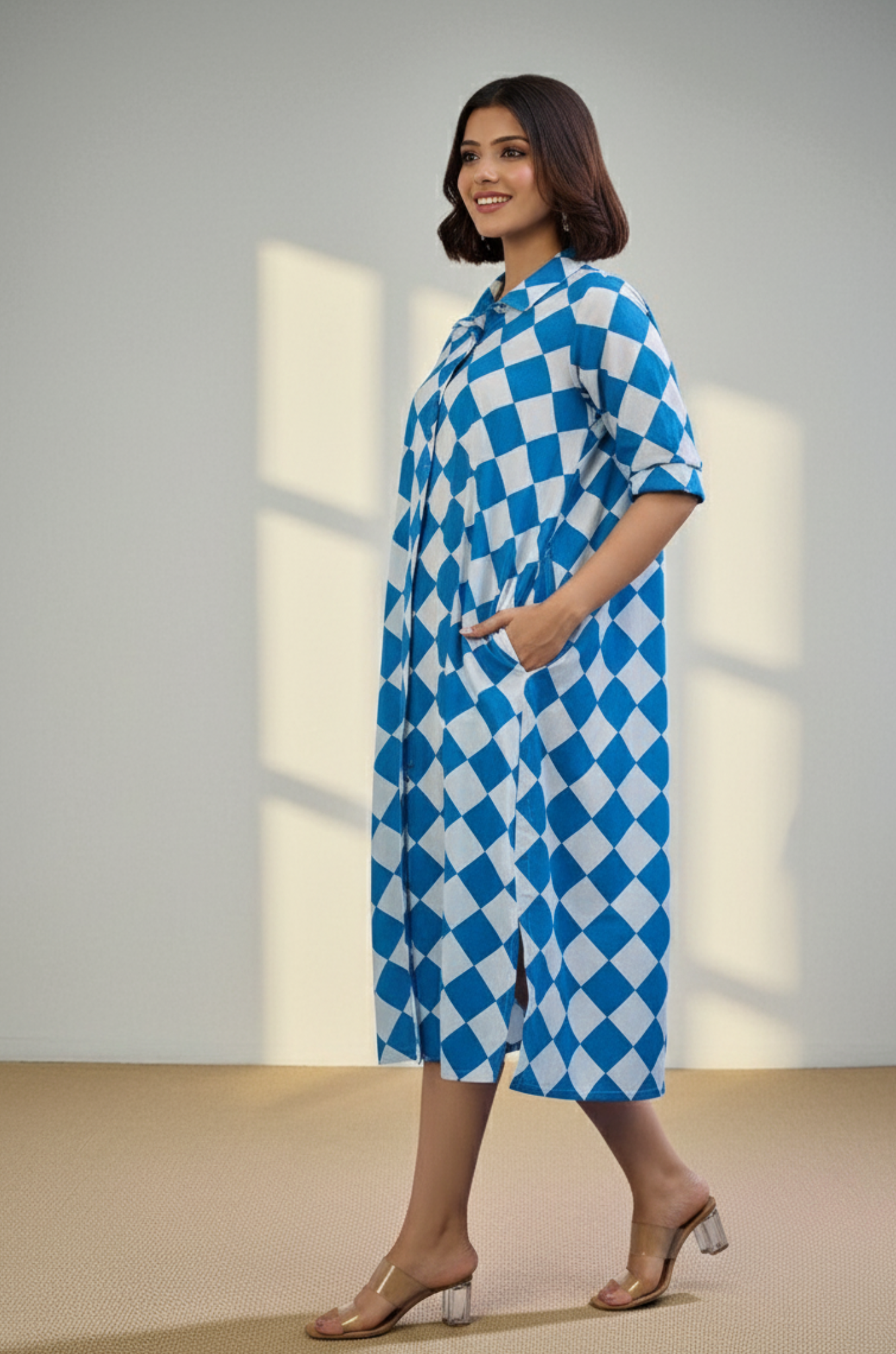 Elevate your wardrobe with our Cotton Shirt Dress, meticulously handcrafted in 100% breathable cotton and adorned with a bold blue diamond-inspired print. Designed as a statement piece, it blends artisanal craft with modern ease. The classic shirt-dress silhouette is elevated with artisanal handmade buttons along the front placket and sleeves, while elegant side slits and functional pockets marry practicality with style. Tailored to perfection, it offers a flattering fit that can be worn solo as a striking dress or layered over denims for a more contemporary vibe. Bold yet versatile, this piece redefines everyday dressing with a touch of statement-making artistry—perfect for holidays, casual evenings, or effortless seasonal styling.