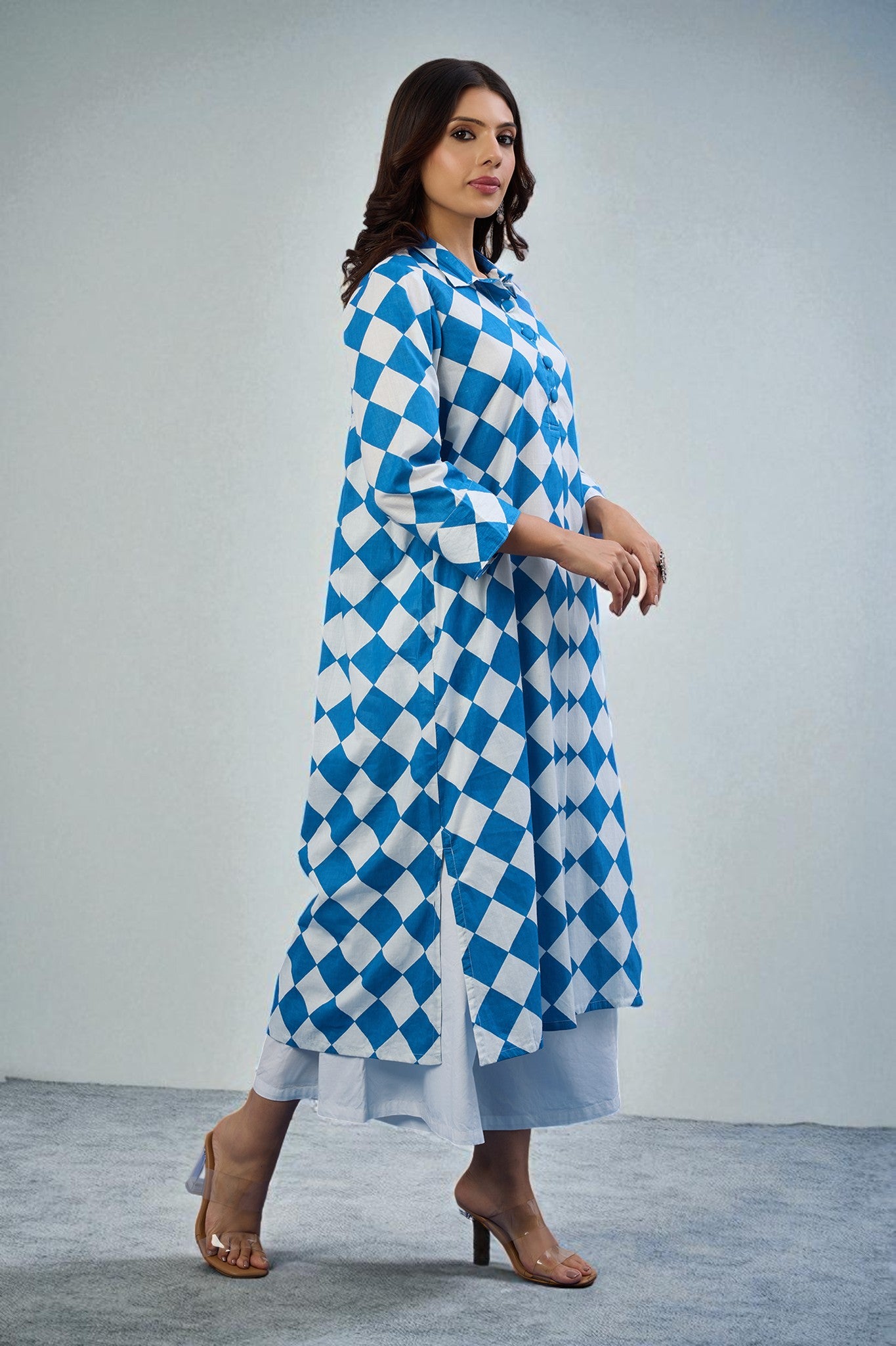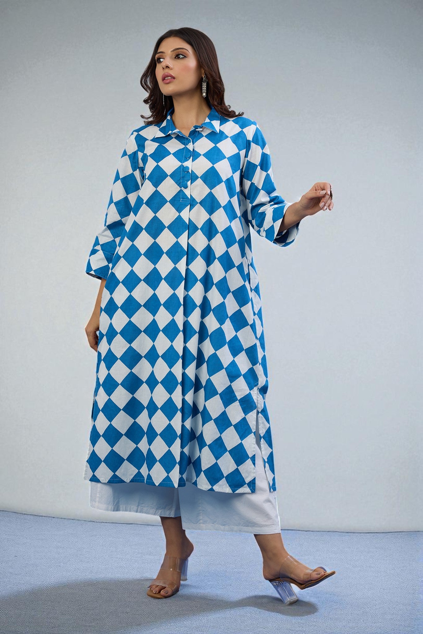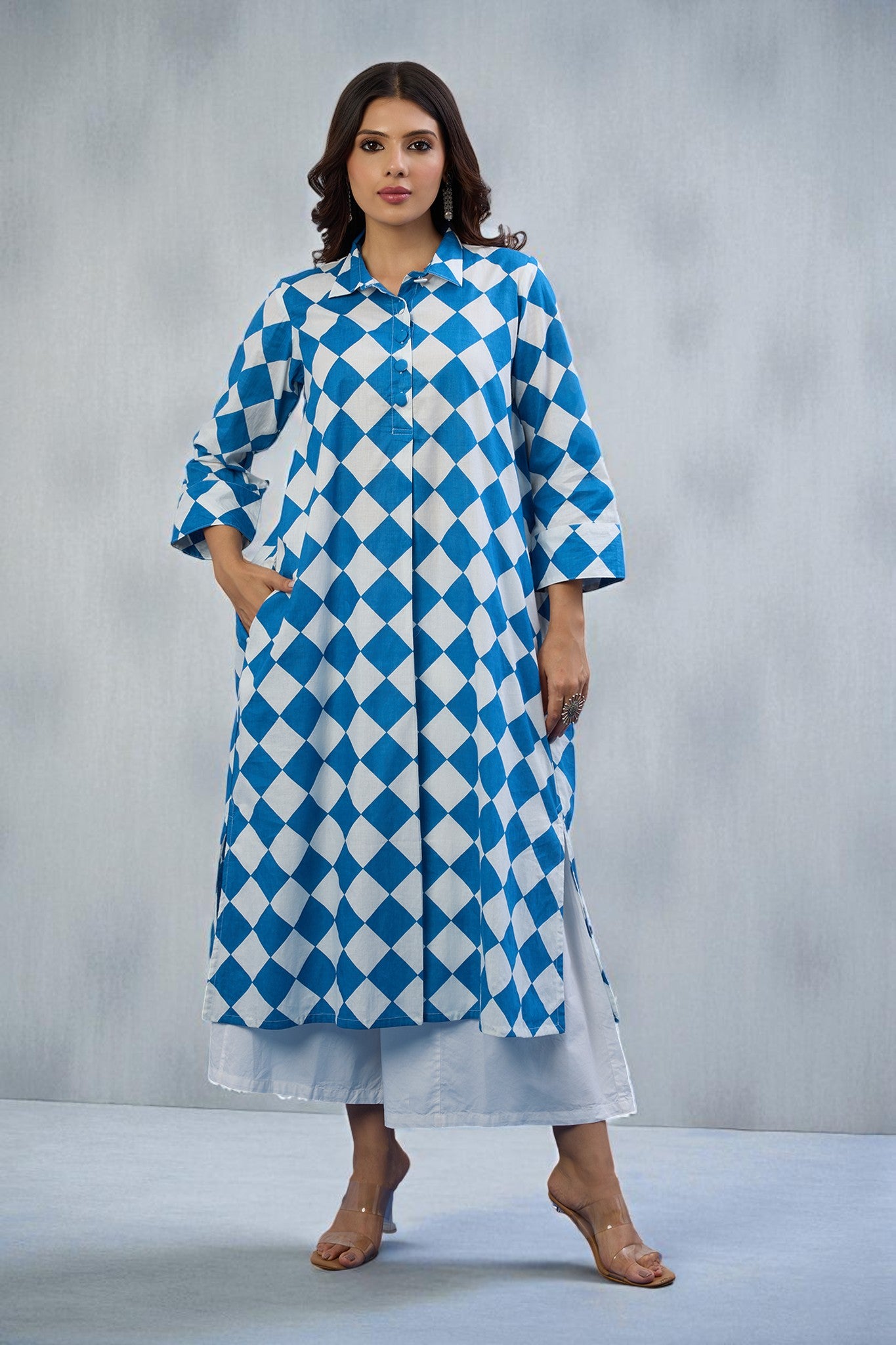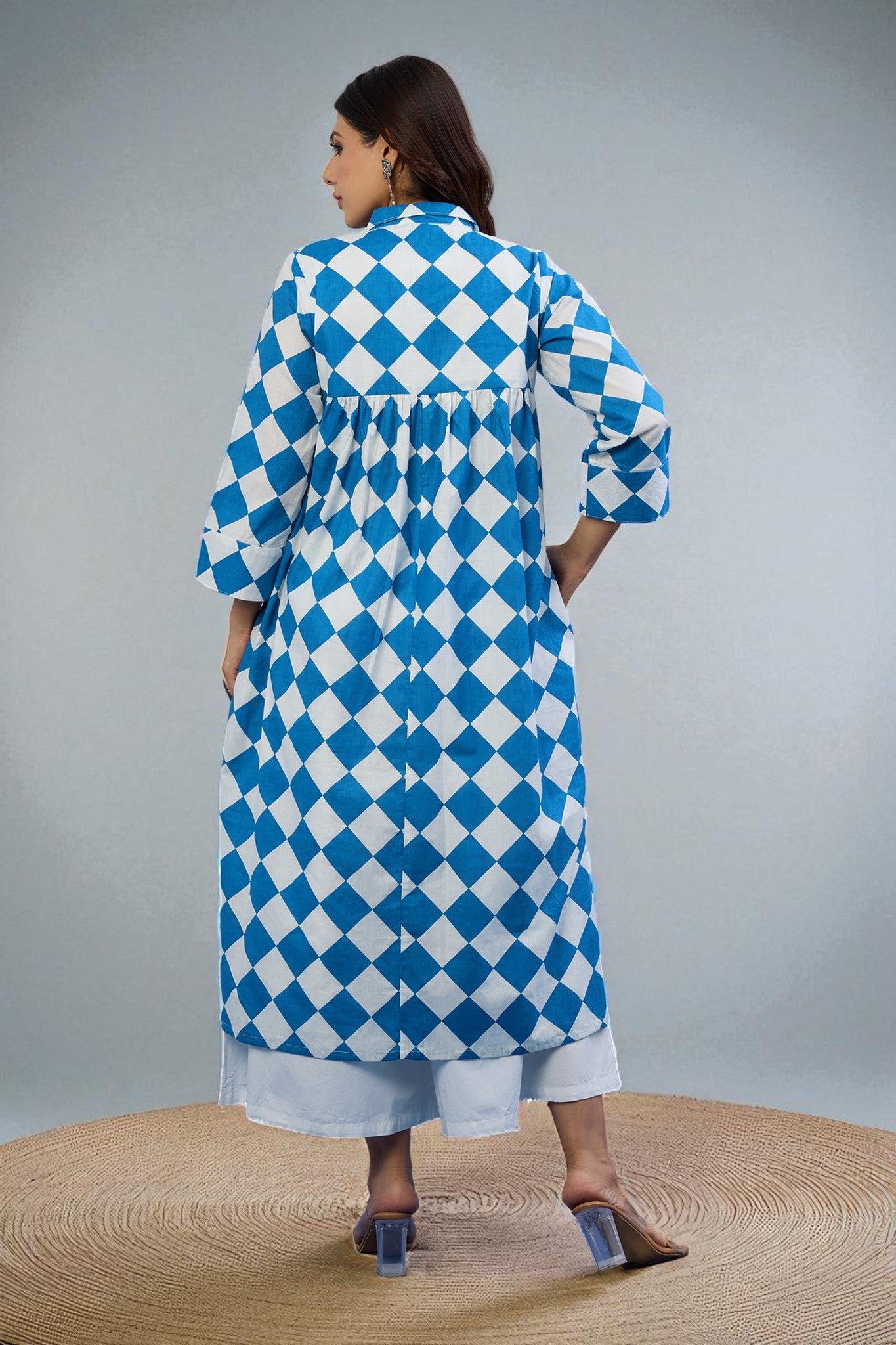 Elevate your wardrobe with our Cotton Shirt Dress, meticulously handcrafted in 100% breathable cotton and adorned with a bold blue diamond-inspired print. Designed as a statement piece, it blends artisanal craft with modern ease. The classic shirt-dress silhouette is elevated with artisanal handmade buttons along the front placket and sleeves, while elegant side slits and functional pockets marry practicality with style. Tailored to perfection, it offers a flattering fit that can be worn solo as a striking dress or layered over denims for a more contemporary vibe. Bold yet versatile, this piece redefines everyday dressing with a touch of statement-making artistry—perfect for holidays, casual evenings, or effortless seasonal styling.