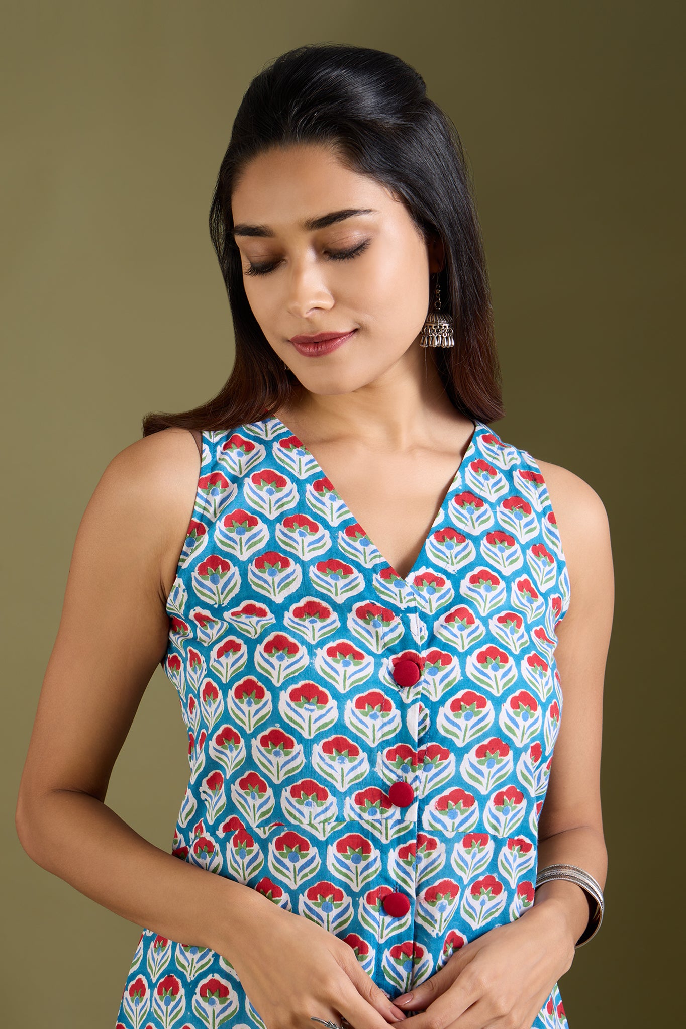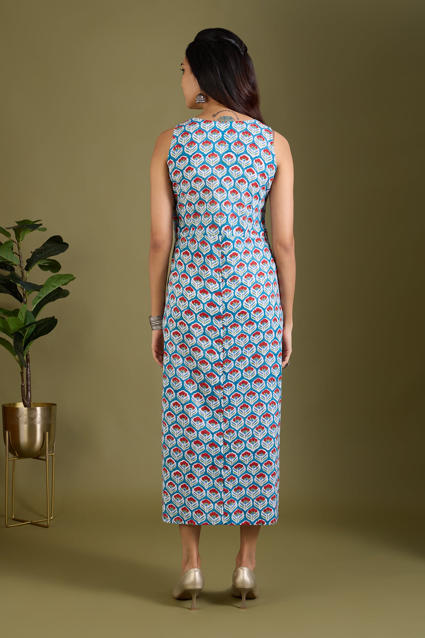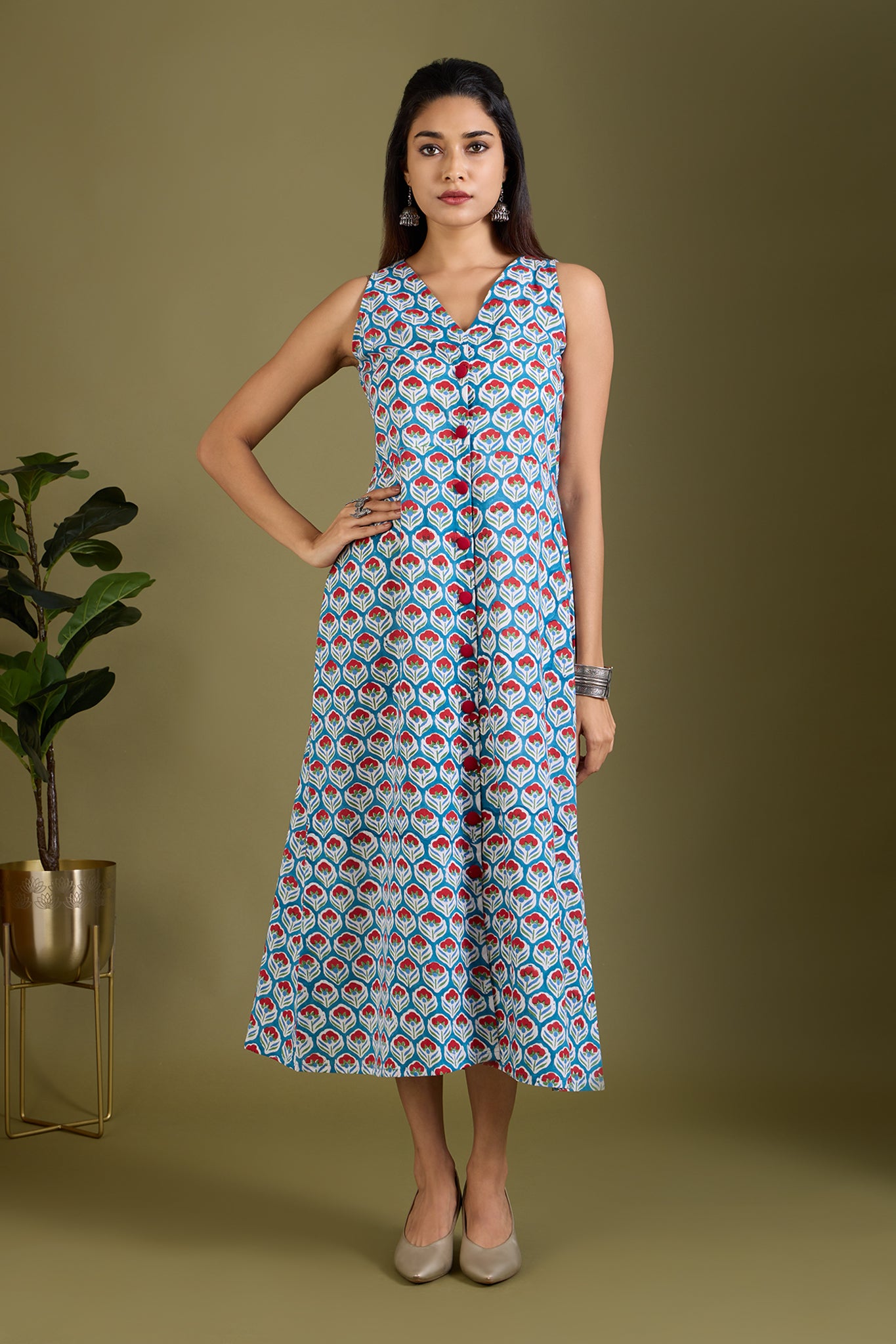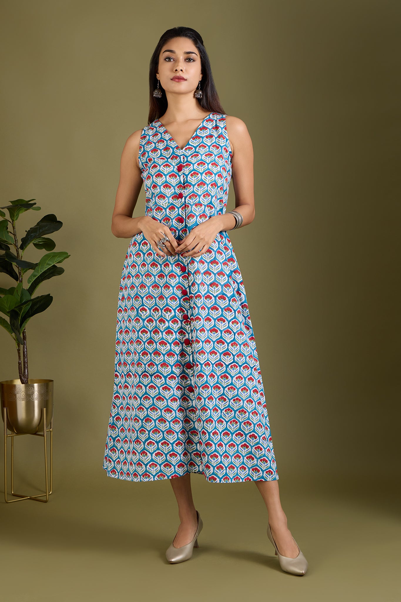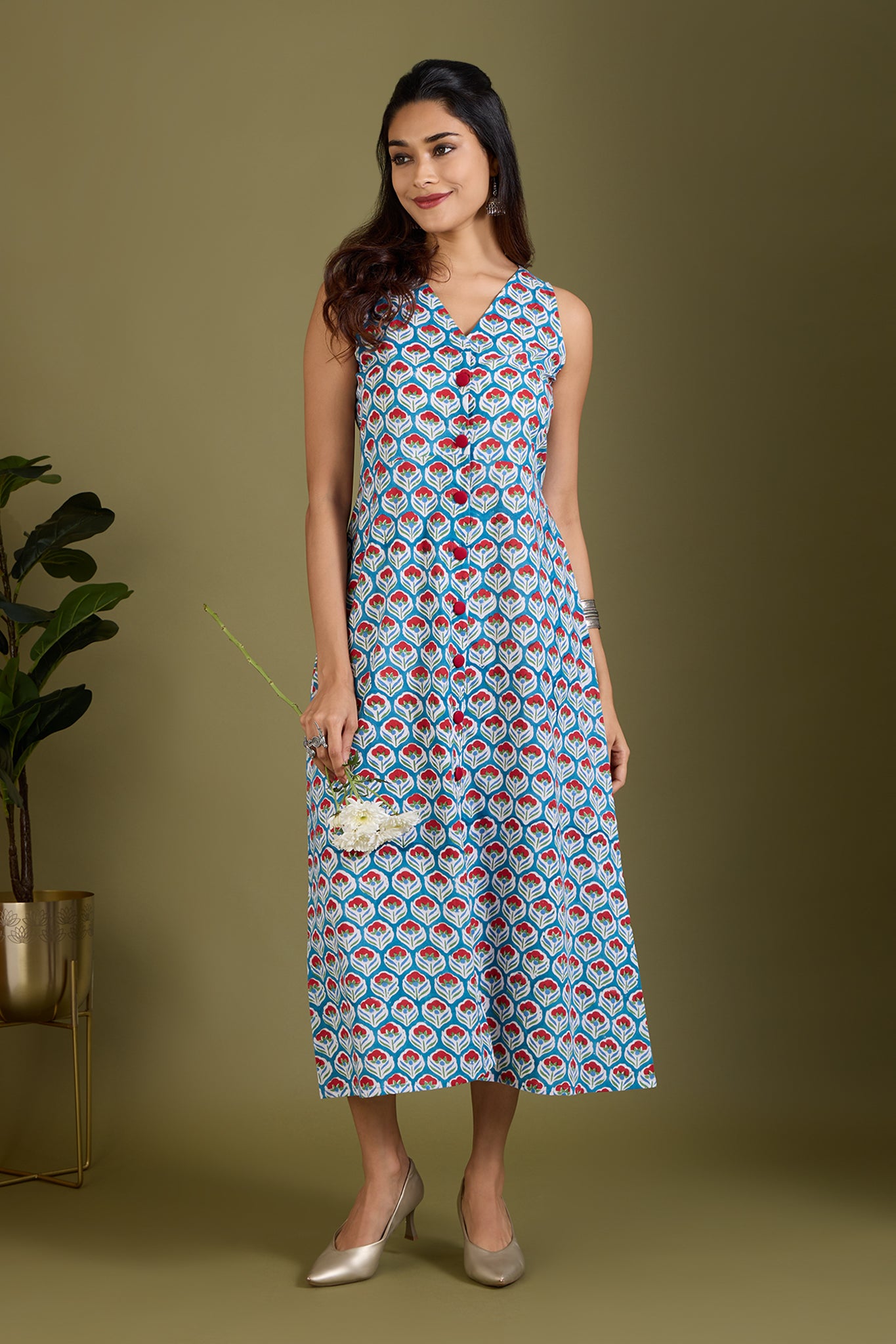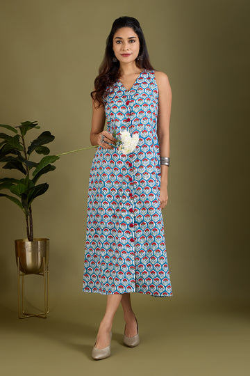 Introducing our Sleeveless Dress, a vibrant fusion of summer charm and timeless elegance. Adorned with bold hues of teal & orange butti , this button-down ensemble is the epitome of laid-back sophistication. Crafted from lightweight cotton, it promises comfort and breathability for those sun-drenched brunches, romantic date nights, or adventurous travels. The flattering fit and tailored perfection ensure you radiate confidence with every step. Handcrafted buttons in matching hues add a touch of artisanal embellishment, while the chic V neckline adds a hint of allure. Whether you're exploring new horizons or simply enjoying the warmth of summer, this dress is your go-to choice for effortless style and undeniable grace.