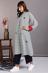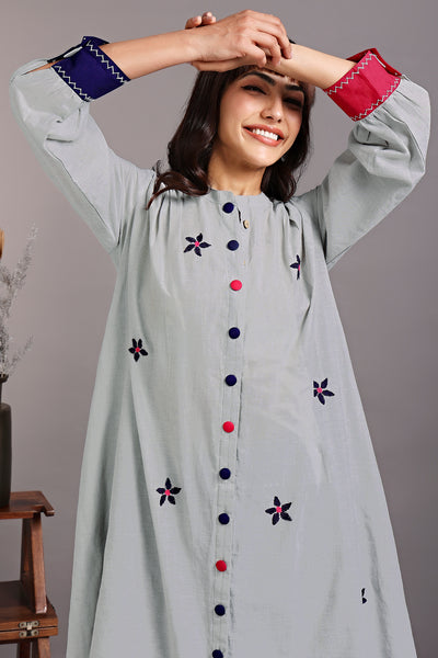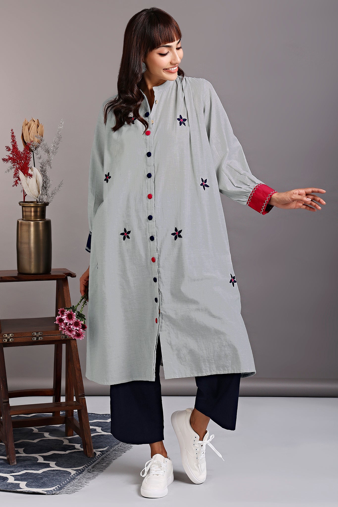 Introducing our timeless Button Down Tunic, a classic piece designed to elevate your style with its effortless charm. Made from soft cotton in a soothing grey hue, this tunic is both comfortable and stylish. The tunic features long puffed sleeves with cuff details, creating a feminine and playful look. Gathers on the shoulders ensure an easy and relaxed fit, adding a touch of casual elegance. The fabric is adorned with hand embroidery all over, featuring a floral pattern in vibrant pop pink and purple hues. This exquisite embroidery creates a strong festive contrast, making the tunic truly eye-catching.