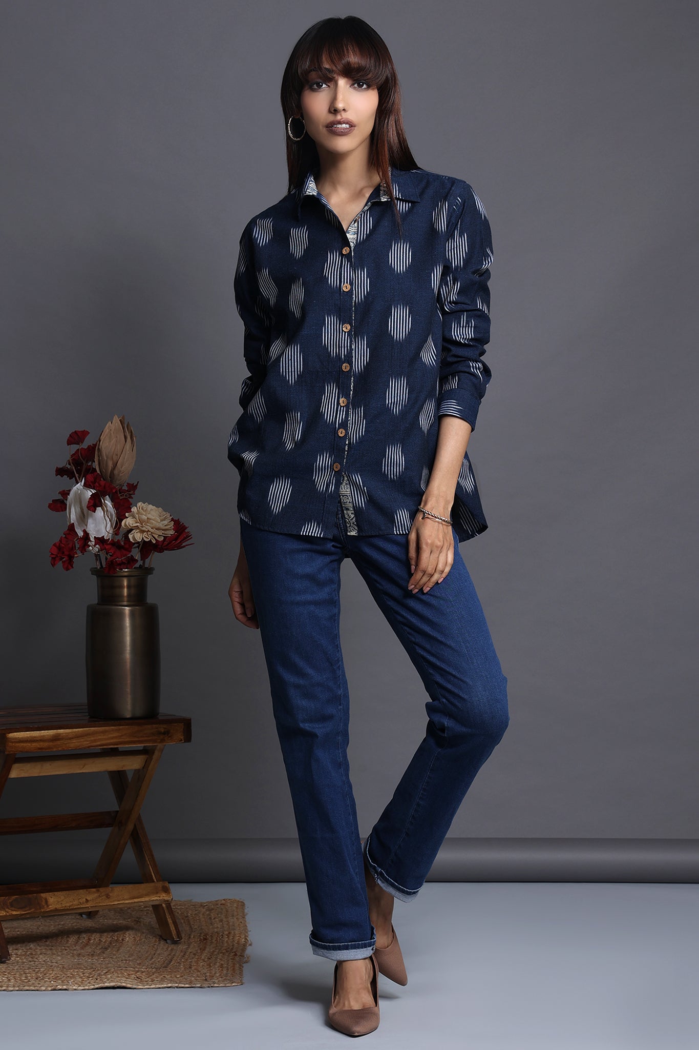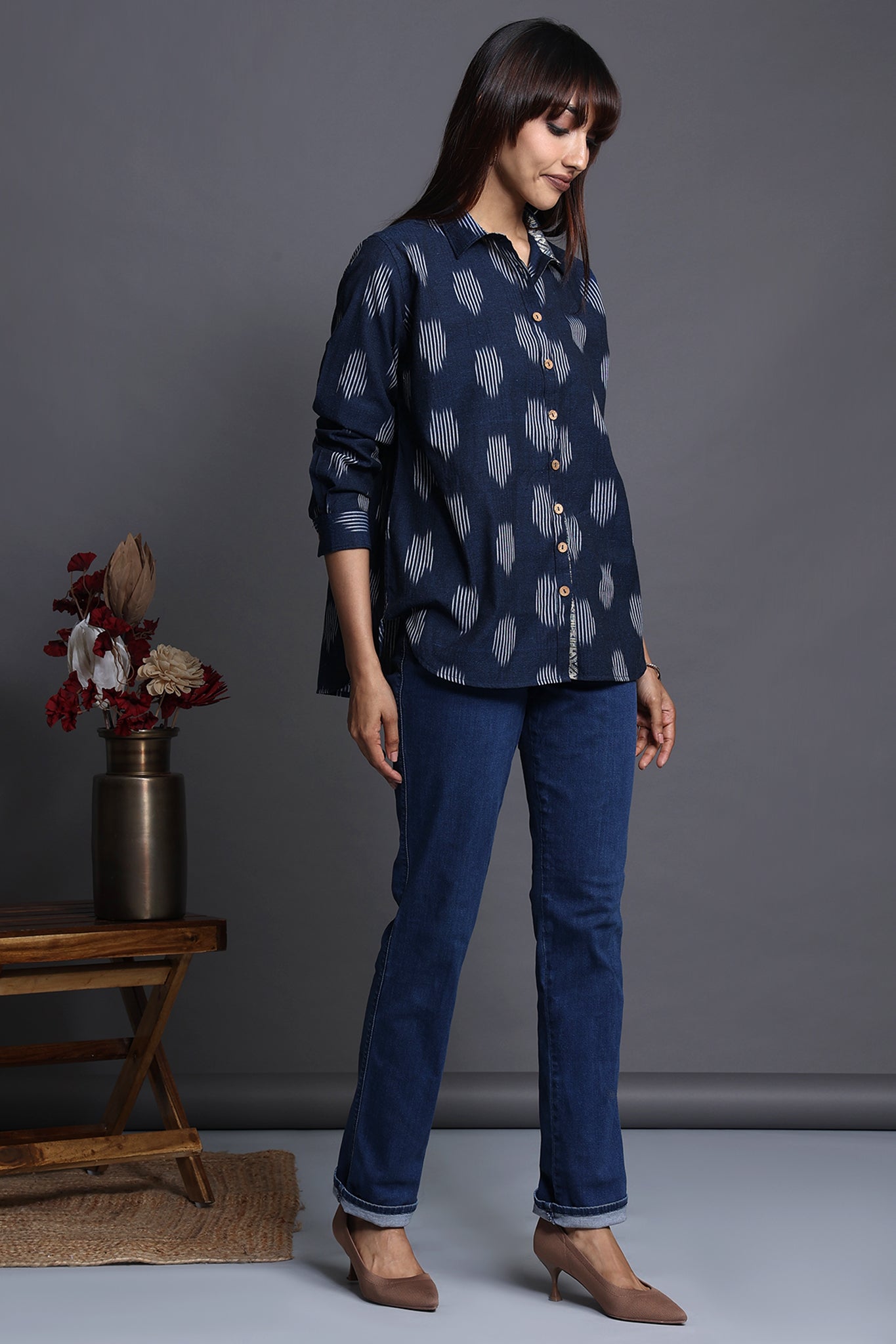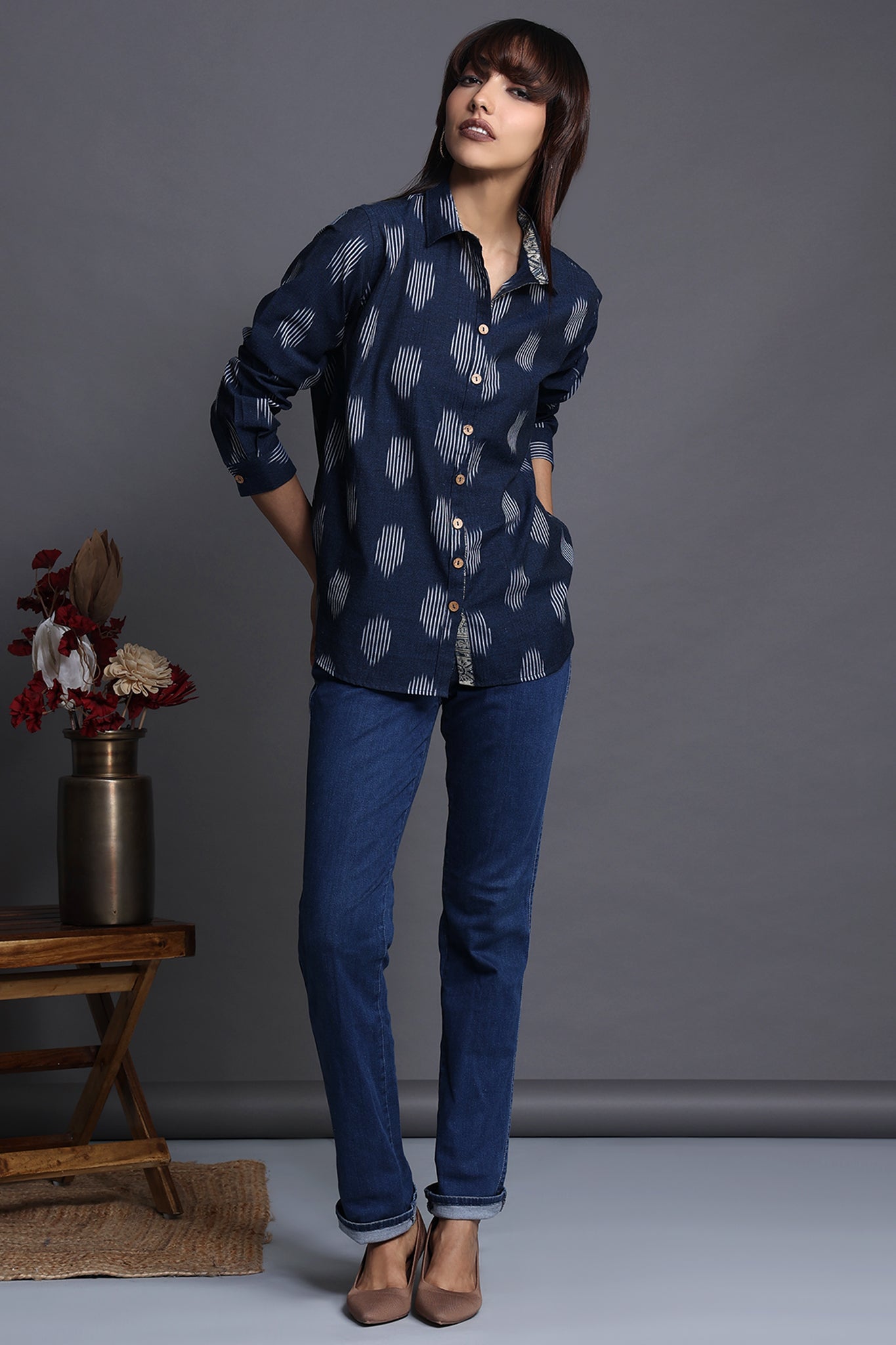 Discover the allure of our handcrafted indigo-hued cotton ikat shirt, a perfect blend of functionality and style. The breezy shirt, adorned with delicate wooden buttons and a thoughtful patch pocket, exudes a unique charm.