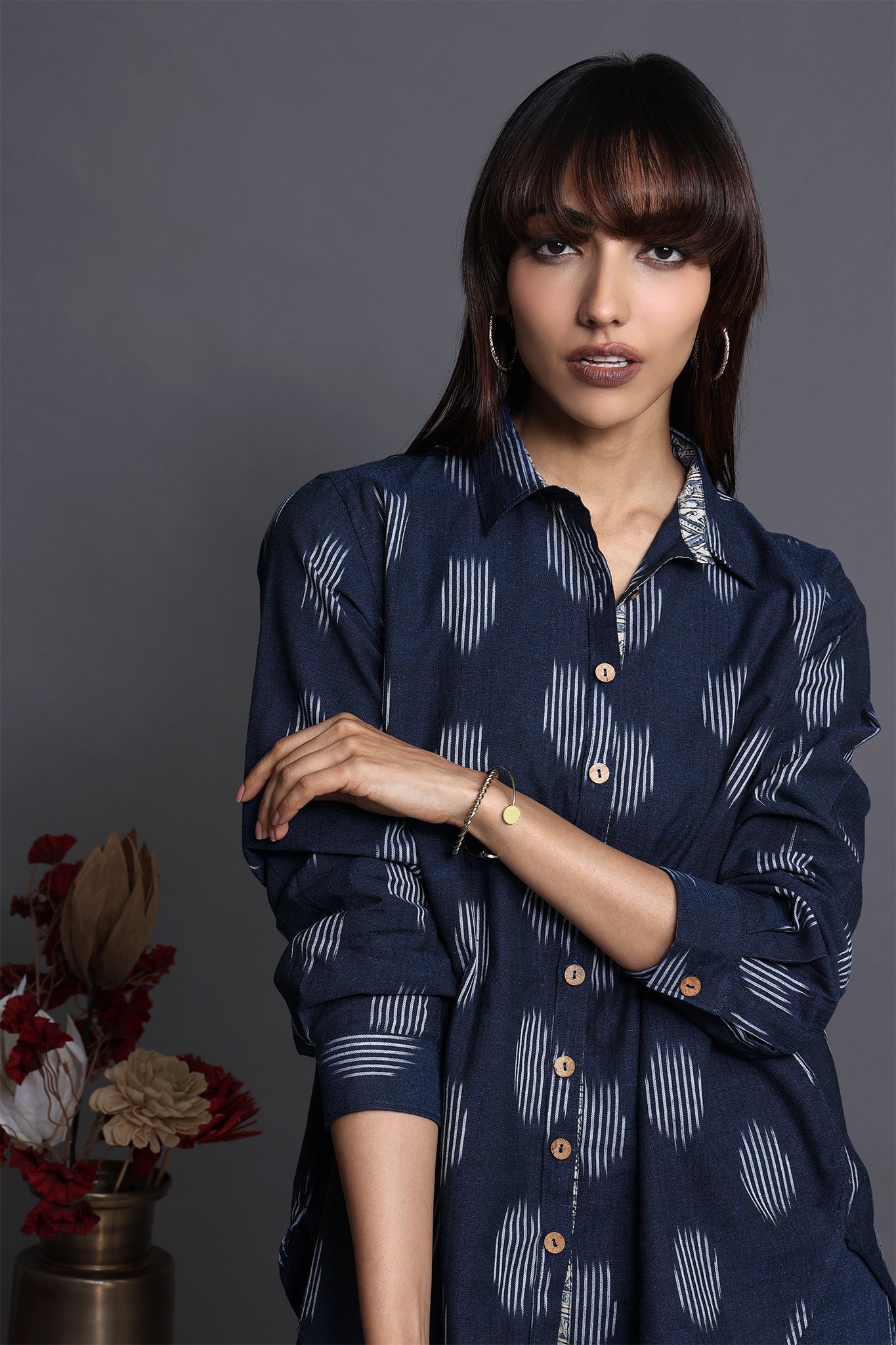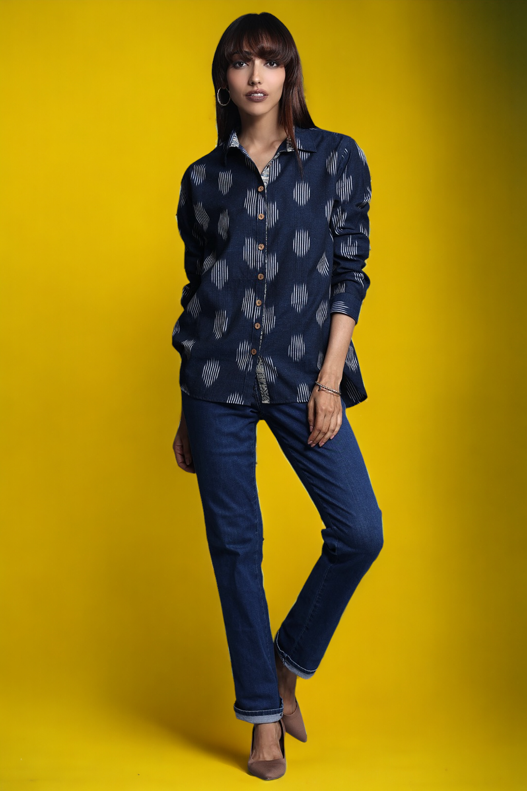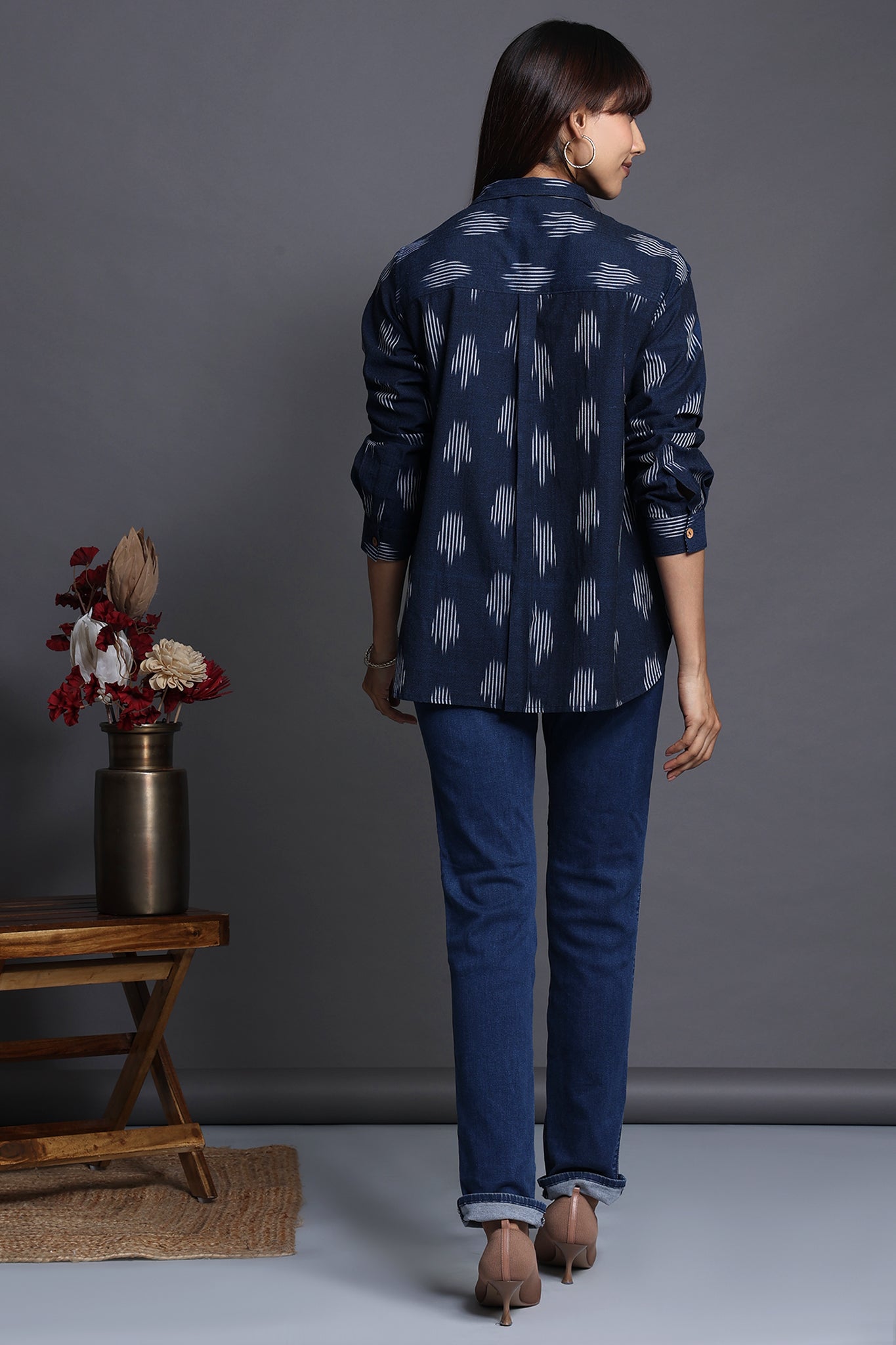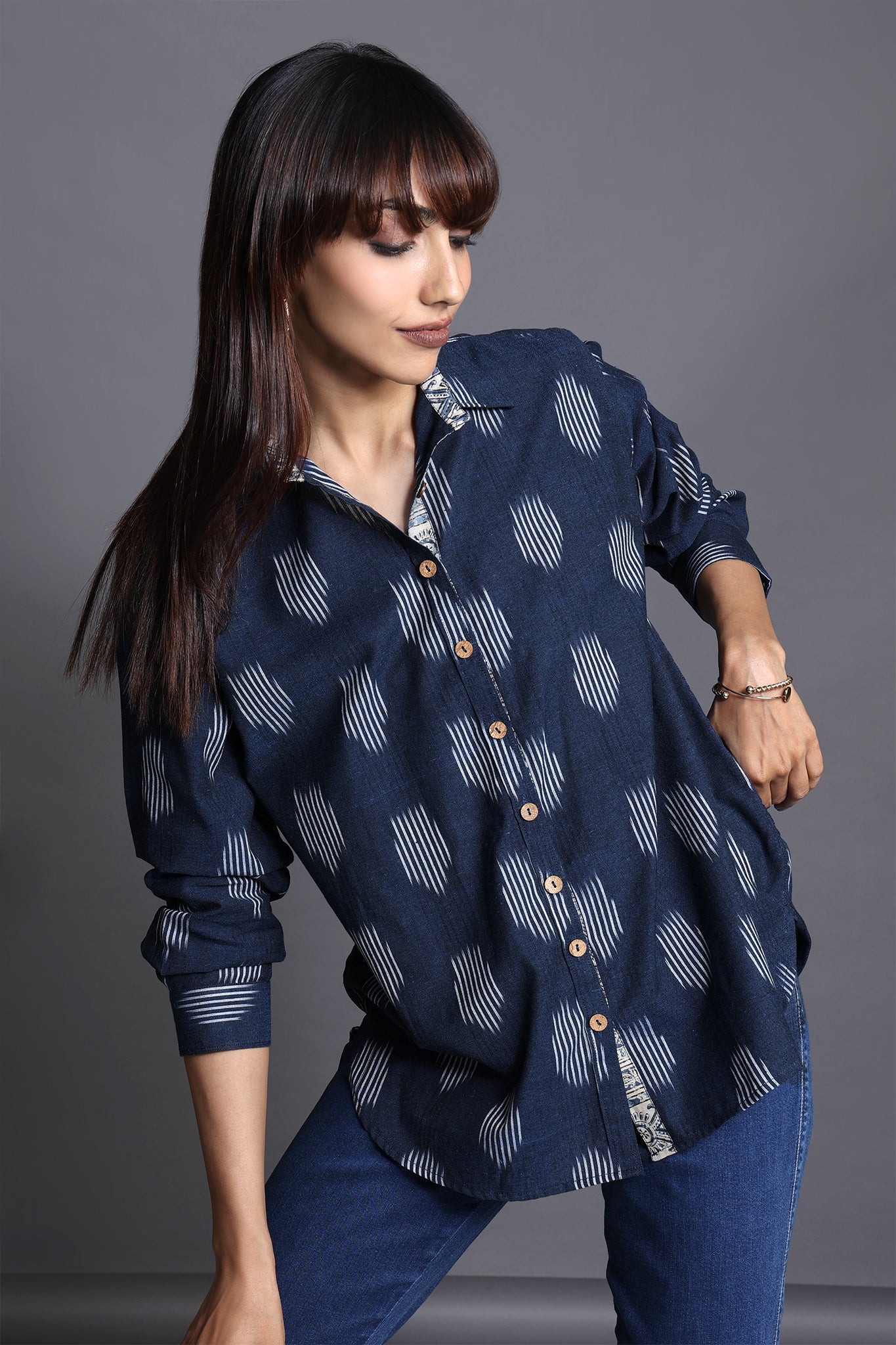 Discover the allure of our handcrafted indigo-hued cotton ikat shirt, a perfect blend of functionality and style. The breezy shirt, adorned with delicate wooden buttons and a thoughtful patch pocket, exudes a unique charm.