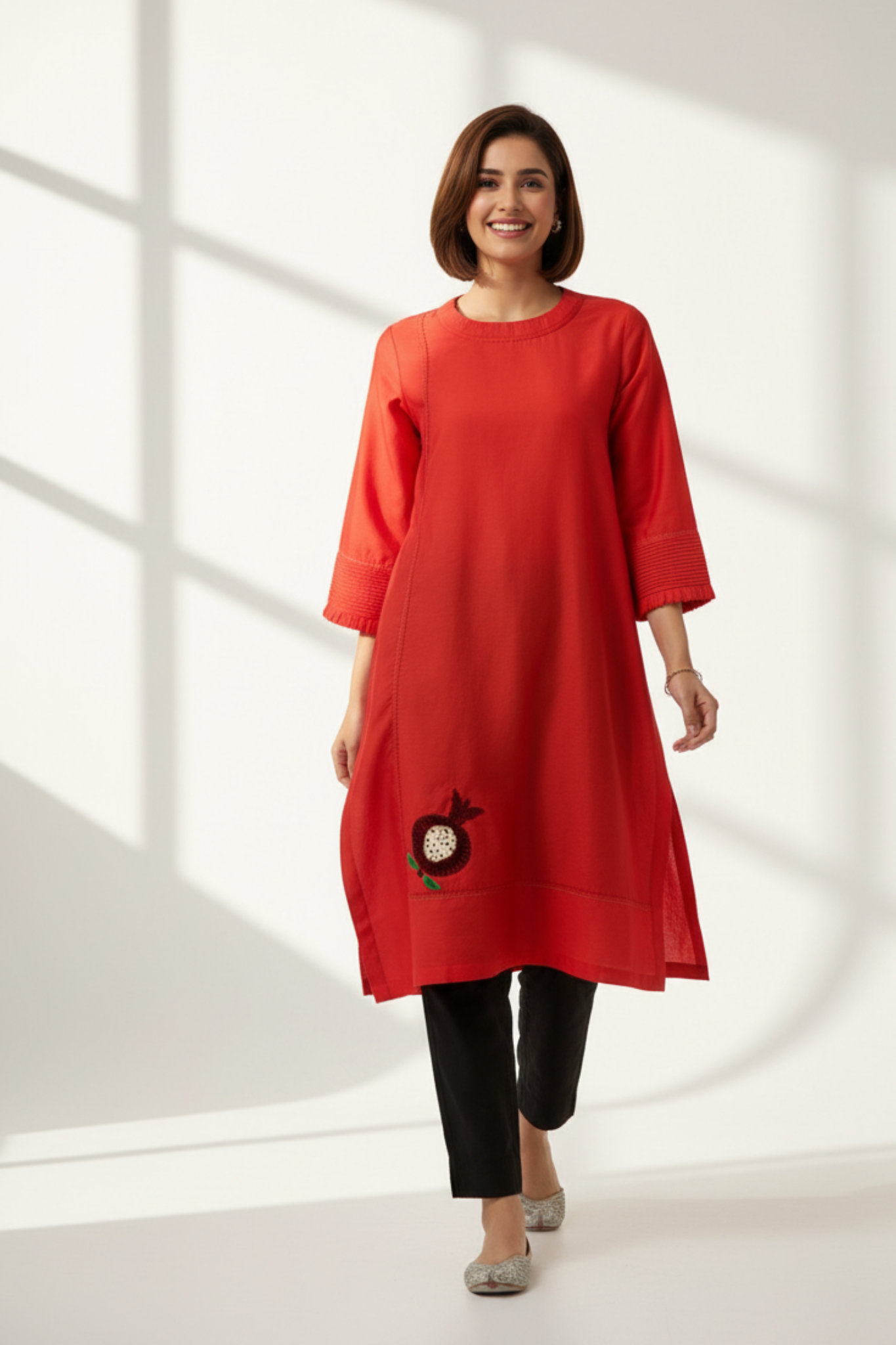 Handmade at our Mumbai atelier, each piece is meticulously finished by our skilled women artisans, reflecting our commitment to the theme of versatility and everyday luxury that defines Maati Clothing. Elevate your wardrobe with the "Ruby Red & Pomegranate Poetry" ensemble—a poetic fusion of artistry, craftsmanship, and timeless elegance.