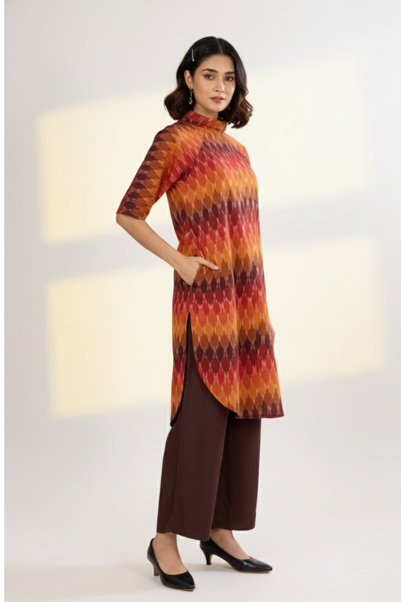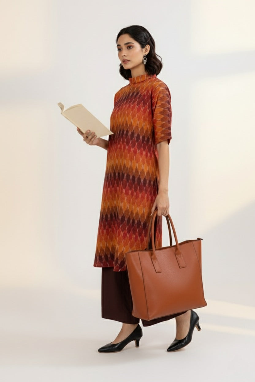Fabric: Soft, breathable cotton for all-day comfort Pattern: Multi-color ikat with sunset hues in a modern chevron pattern Design: Short tunic kurta with a cowl neck and apple cut silhouette Sleeves: Short sleeves with pockets for added functionality Fit: Flattering, relaxed fit perfect for smart-casual occasions Versatility: Can be worn as a chic dress or paired with pants for a polished look Style: Blends traditional workwear with contemporary elegance Styling Idea: Pair this kurta with brown modal pants and minimalist sandals for a sharp office look, or wear it as a dress with ankle boots for a modern, relaxed vibe