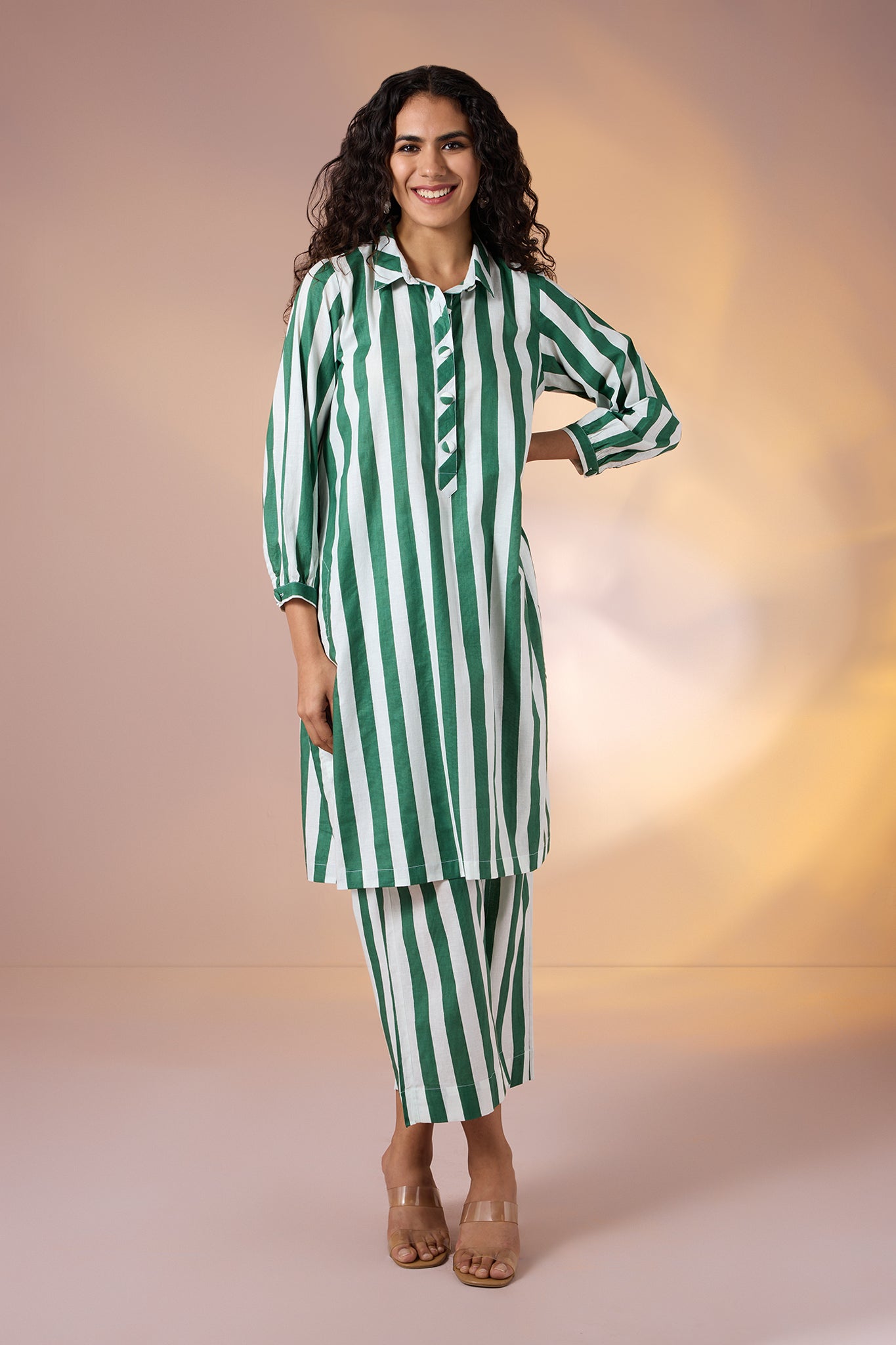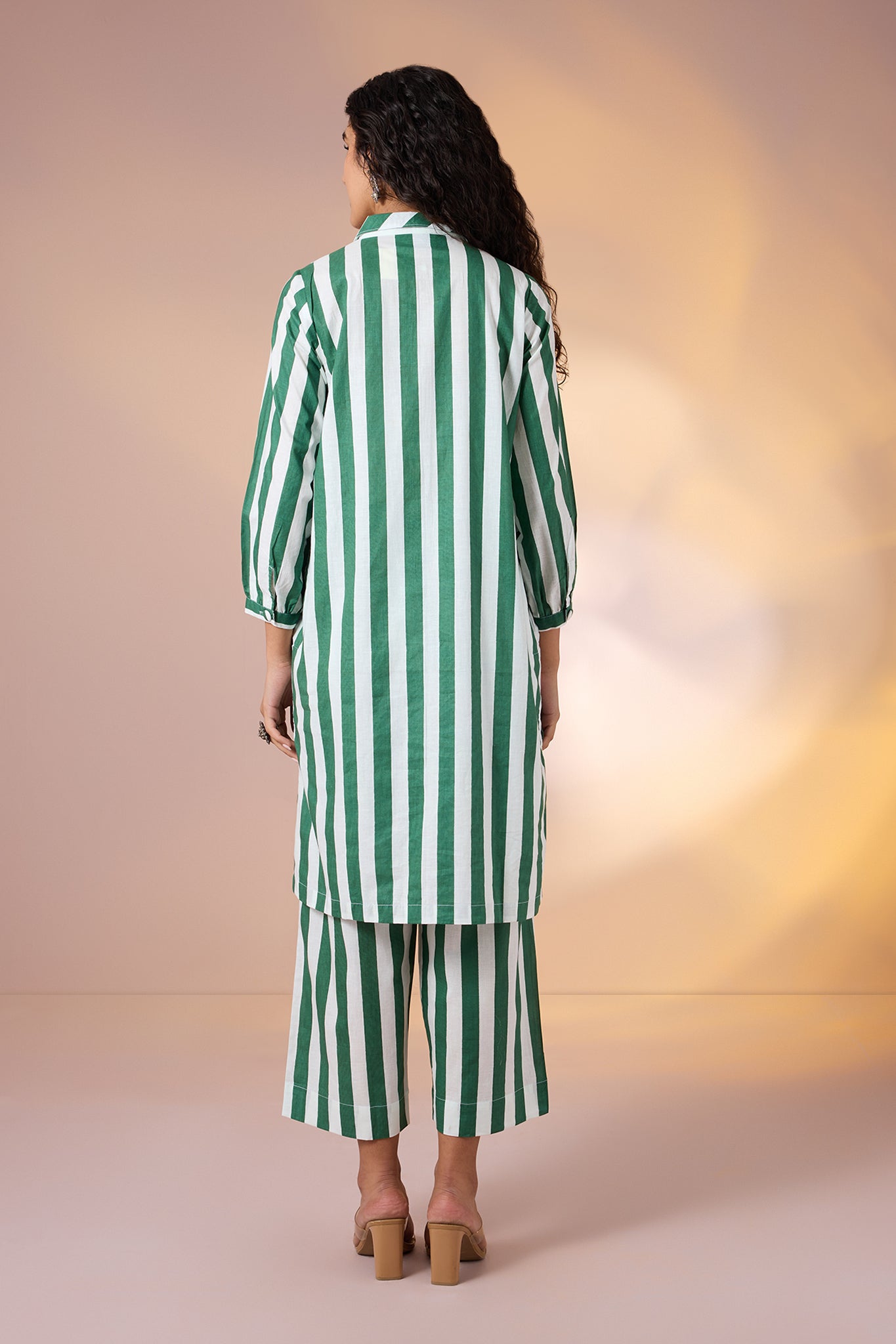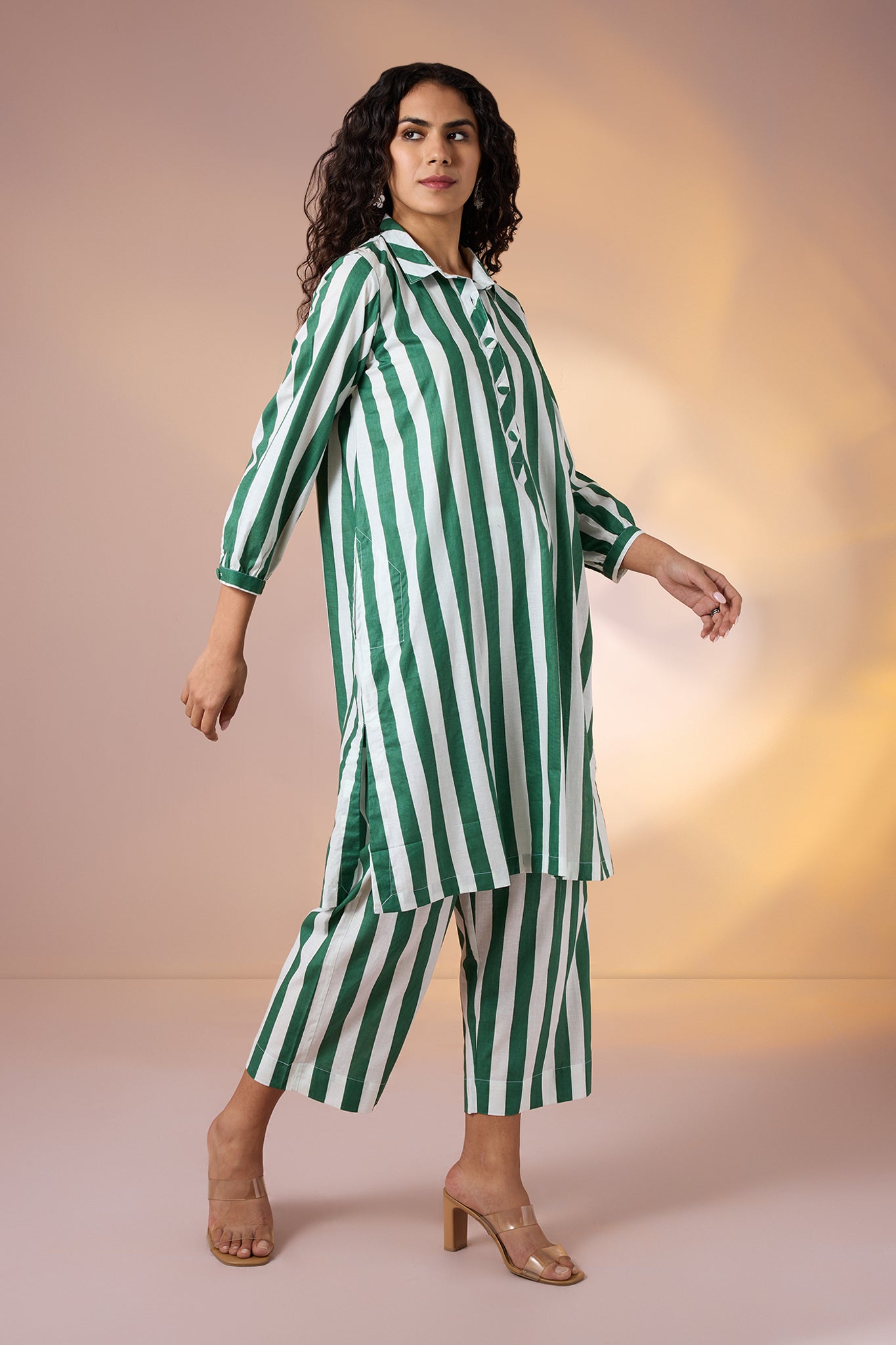 Crafted in 100% cotton, this kurta set is designed in bold green stripes against a crisp white base, making it a striking yet timeless wardrobe staple. The collared kurta features a front placket with handcrafted buttons, 3/4th sleeves finished with smart cuff detailing, and a relaxed cut that flows effortlessly. Paired with easy cotton trousers, it’s tailored for comfort without compromising on elegance. Perfect for travel, work, or leisurely outings, this set balances versatility with style, ensuring you look polished wherever you go.Pair with tan flats and a crossbody bag for travel-ready ease, or elevate with block heels and minimal jewellery for a refined work look.