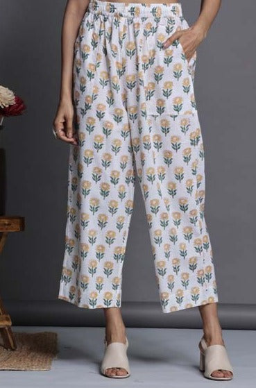 comfort fit cotton printed pants - white yellow sunflower buttis