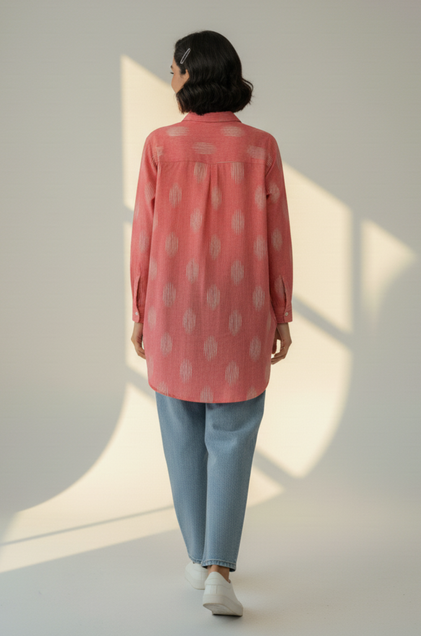 Handcrafted in 100% cotton, this coral pink Ikat shirt brings a touch of warmth and craft to your everyday style. The collared neck, button-down front, and full sleeves lend it a timeless silhouette that’s both smart and comfortable.Pair it with pants and flats for laid-back sophistication, or tuck it into jeans with bold earrings for a modern, handcrafted twist.