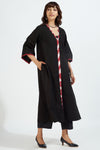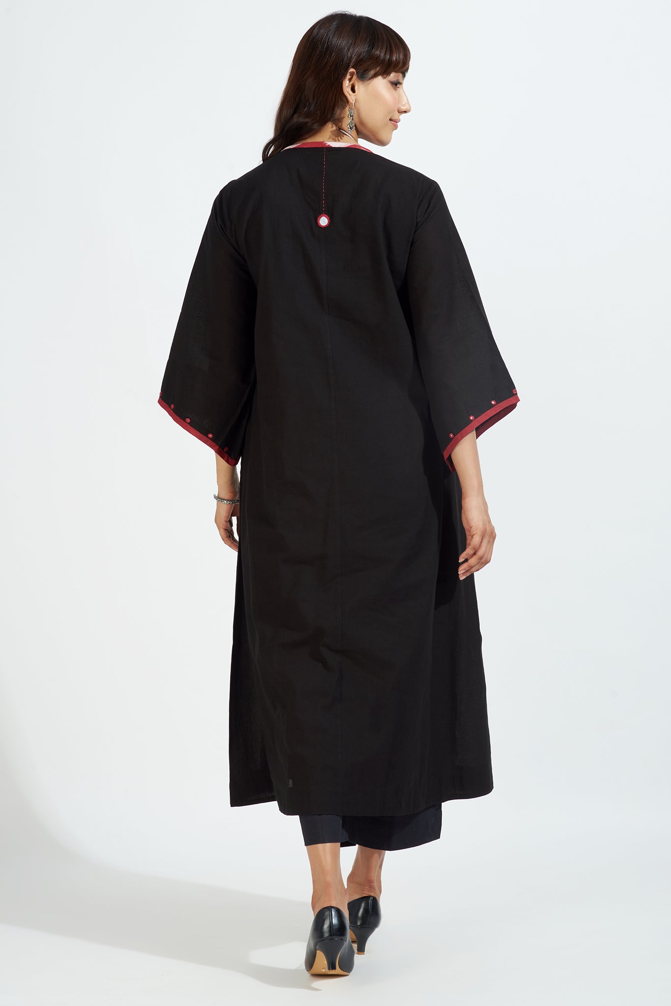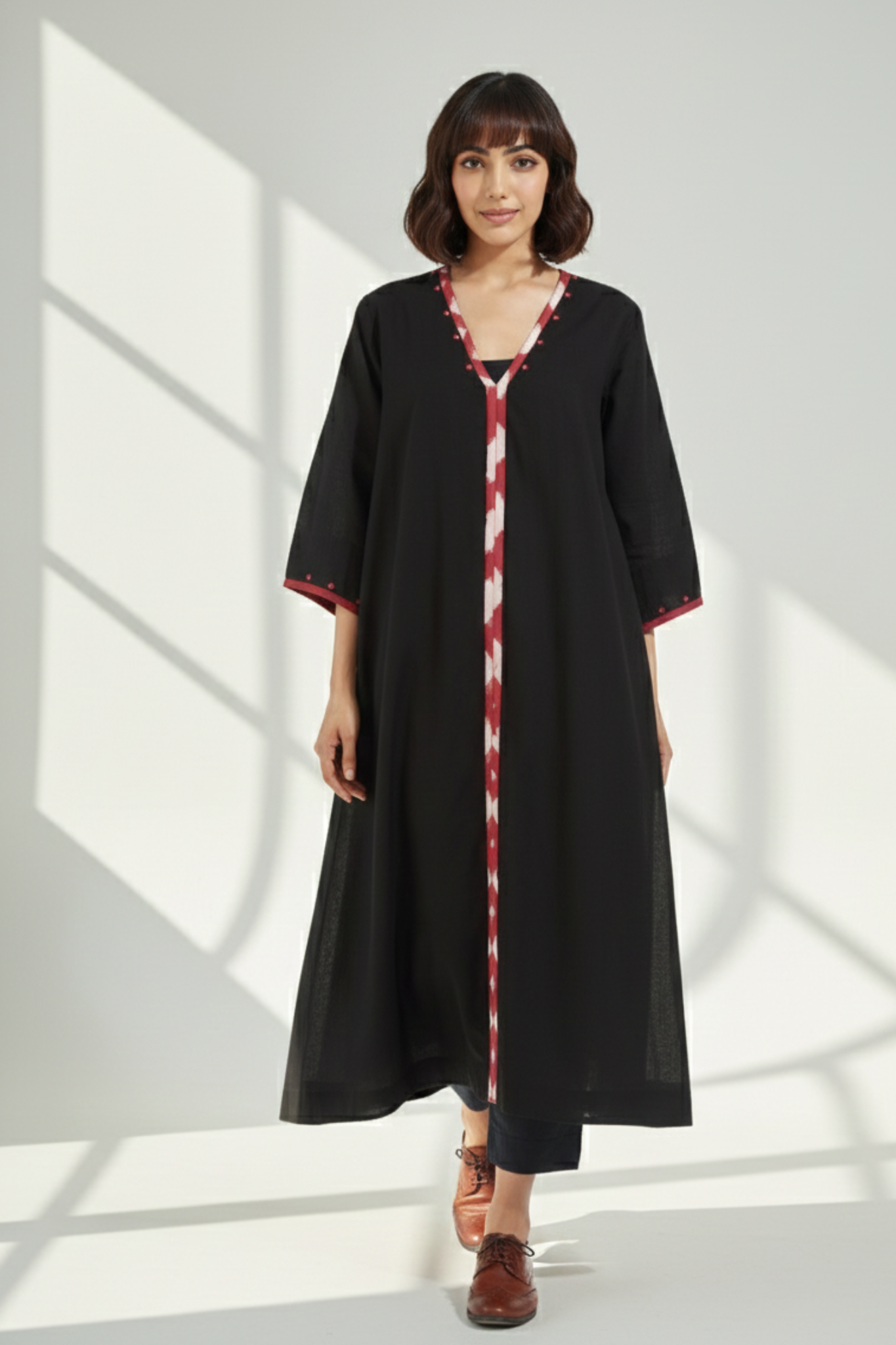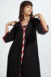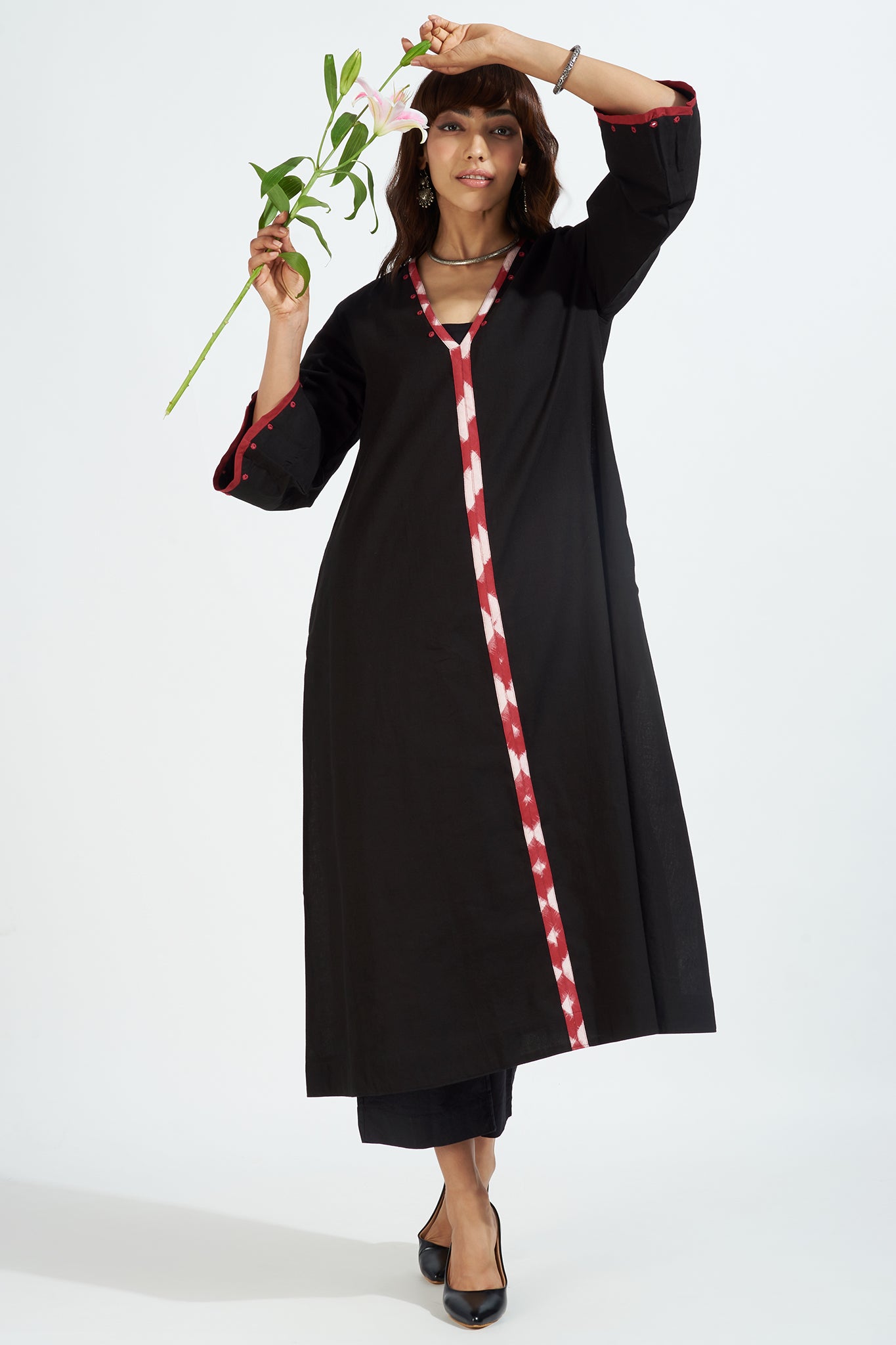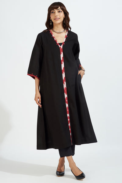 Introducing our chic resort dress-kurta, designed to capture the essence of a relaxed holiday getaway. This stunning kurta features accentuated bell sleeves and a captivating combination of black and red ikat trims. The delicate mirrorwork detail on the front placket and sleeves adds a touch of glamour and drama to the overall design.