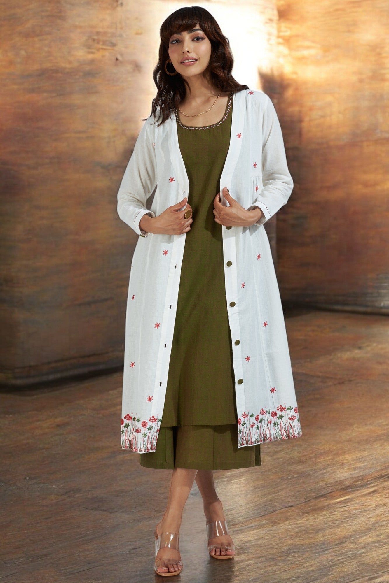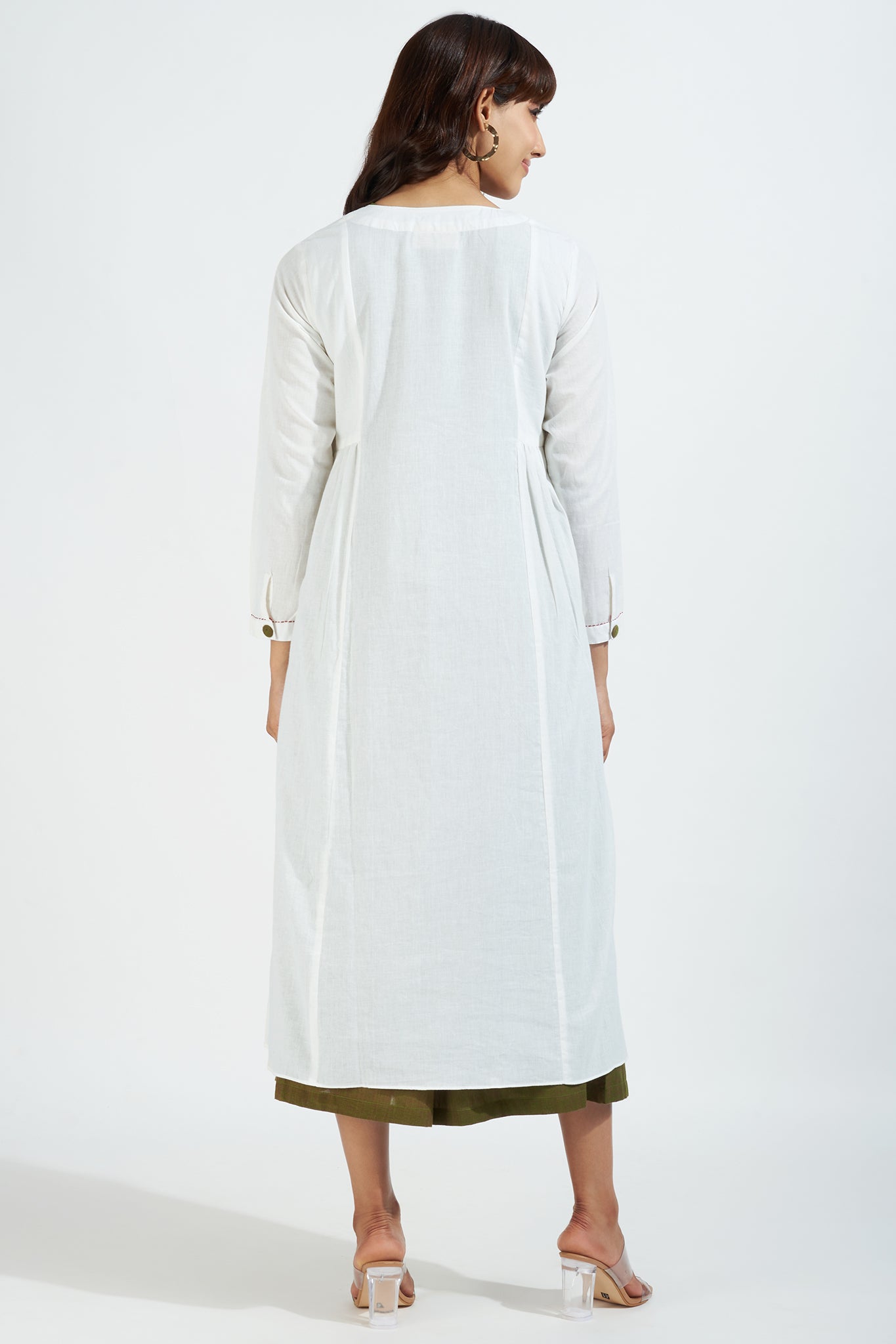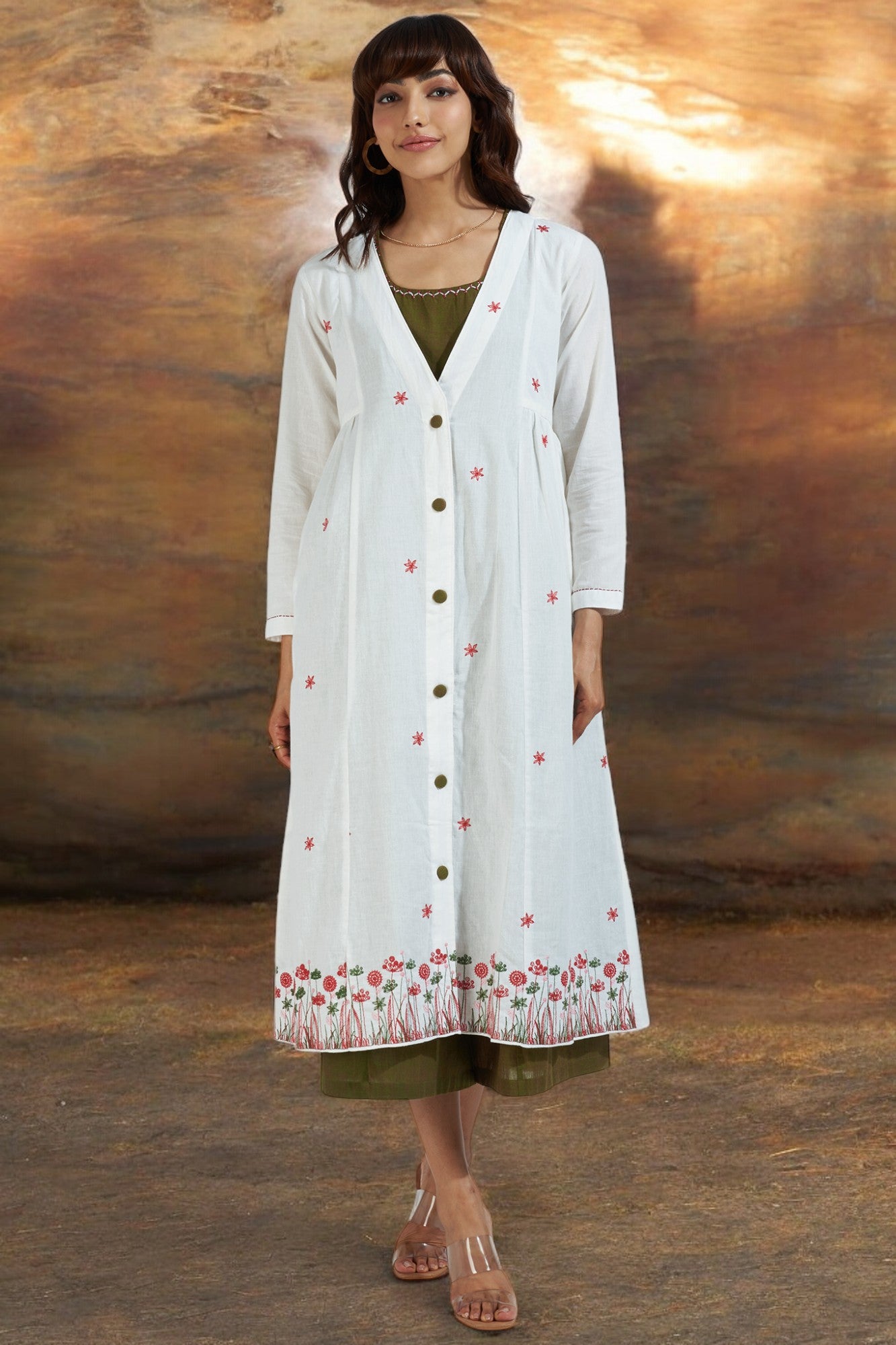 Every stitch and detail has been thoughtfully considered, from the accentuating green fabric buttons to the meticulously hand-hemmed finish. The jacket stands out as the showstopper of our collection, exuding a serene vibe that is both enchanting and captivating.