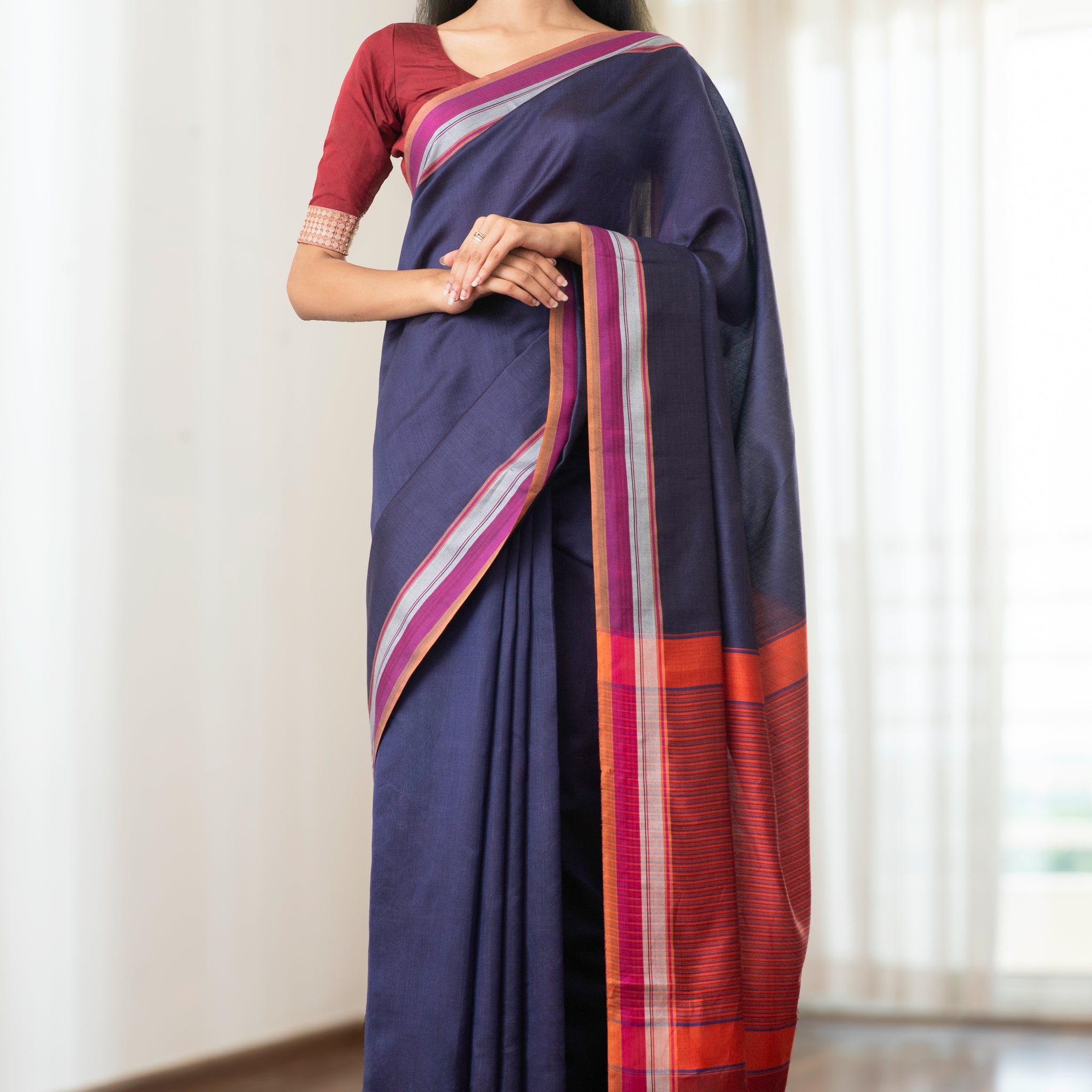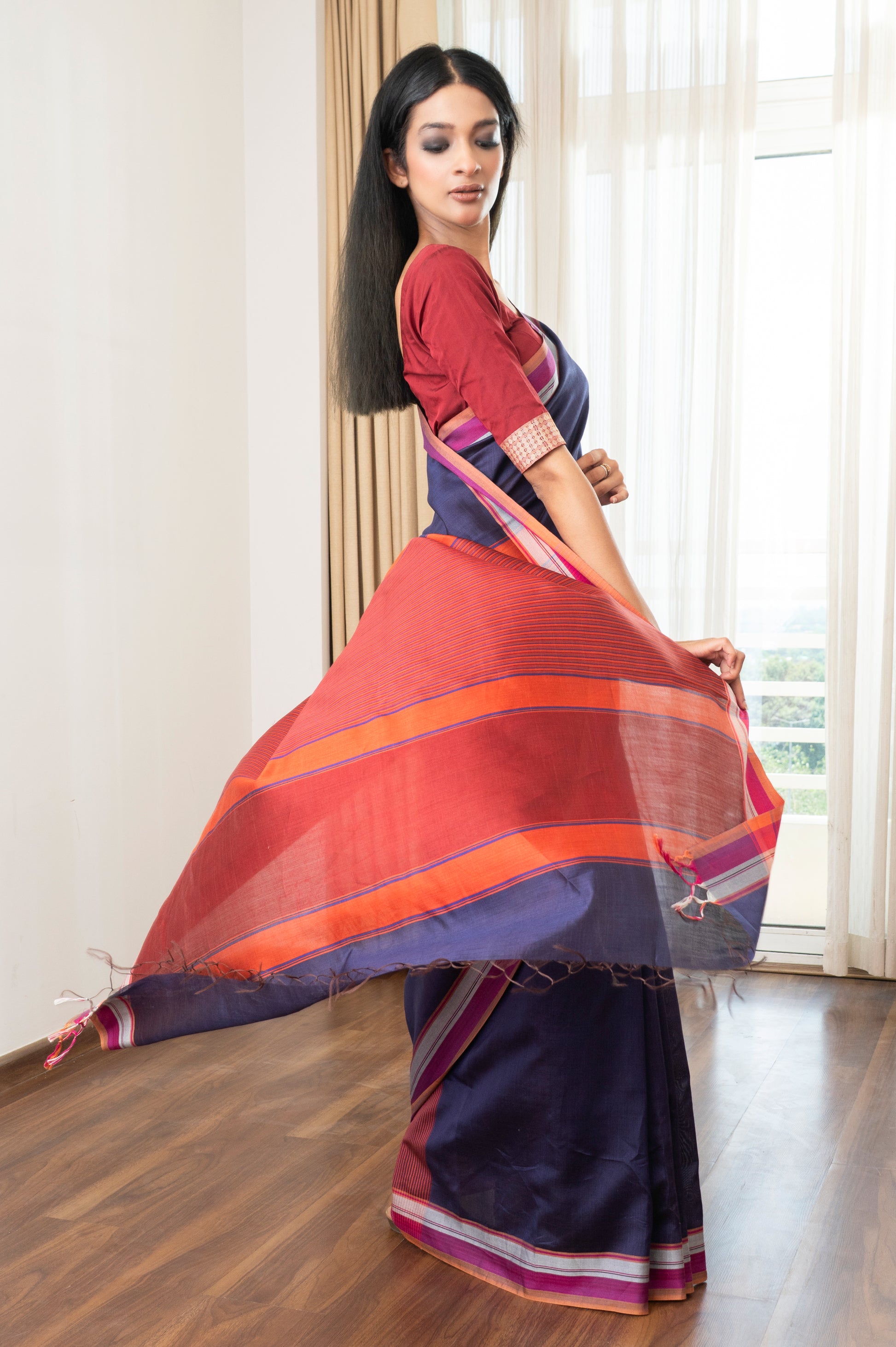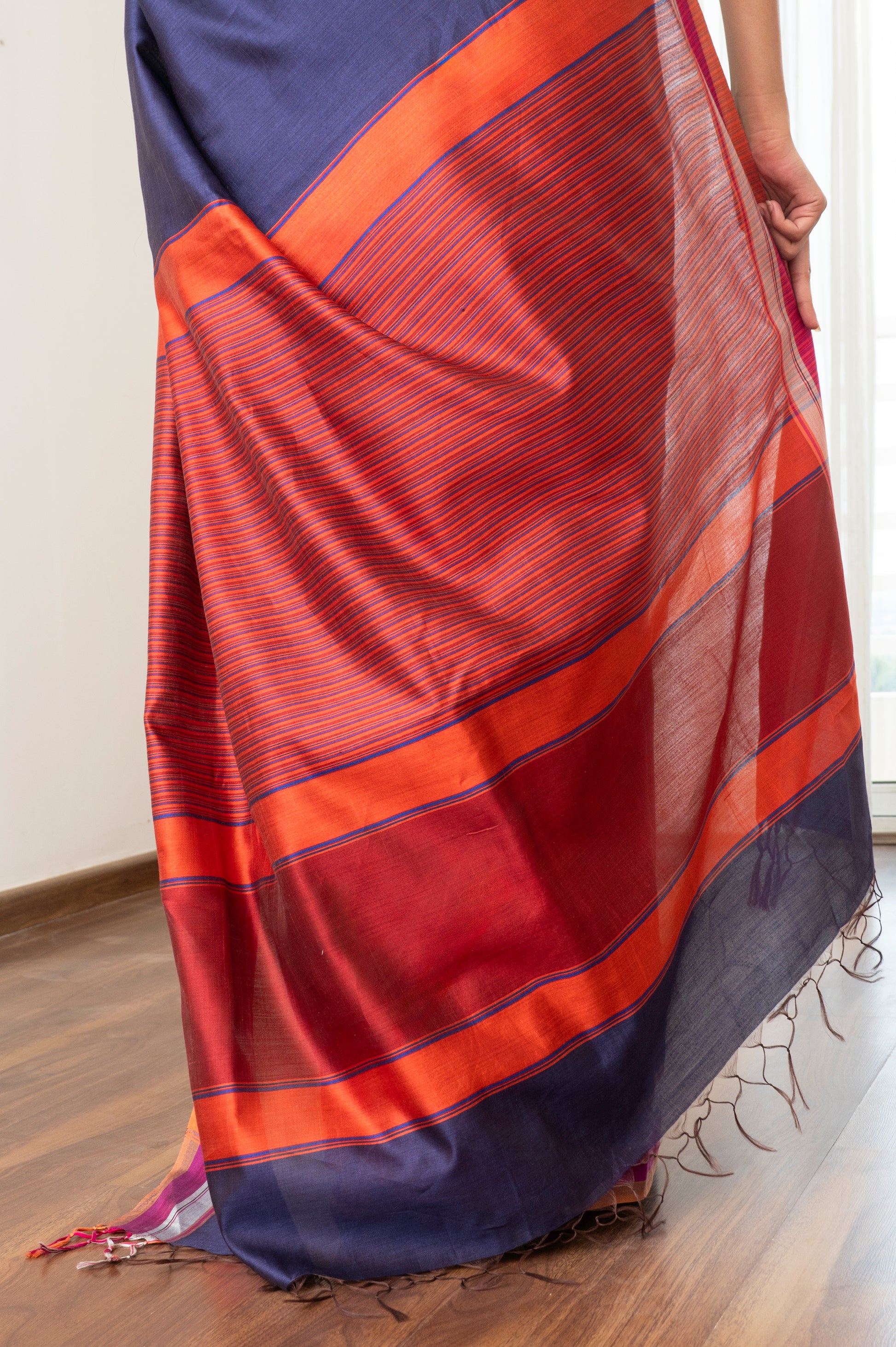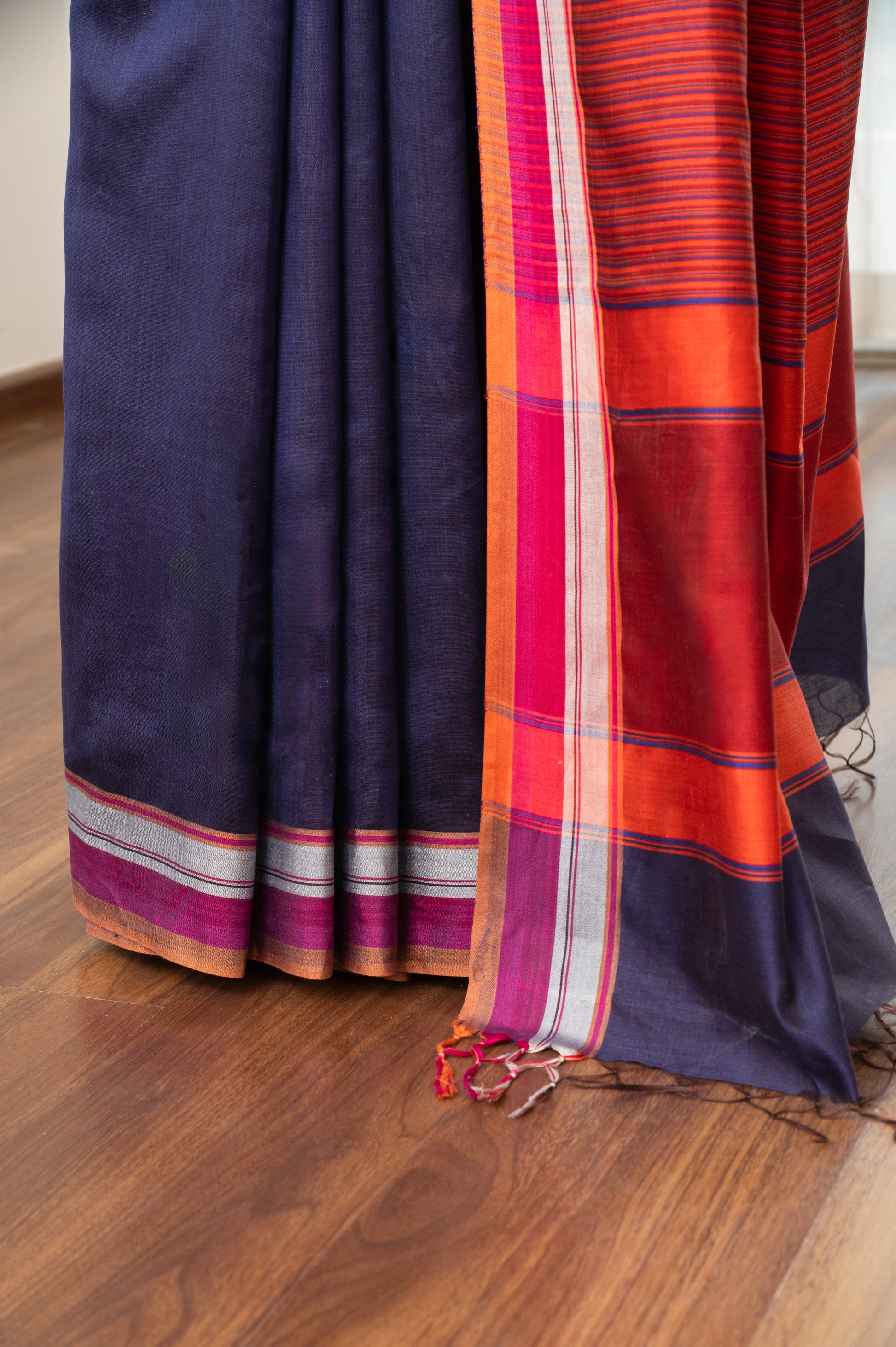 Elevate your festive dressing with this elegant handwoven Eri silk saree in deep navy blue, brought to life by a bold red-orange pallu. A striking play of contrast, this piece blends richness with restraint, radiance with calm. The natural texture of wild silk feels soft against the skin, while its sustainable soul makes a quiet, confident statement. Designed for the woman who moves with purpose and celebrates with grace.