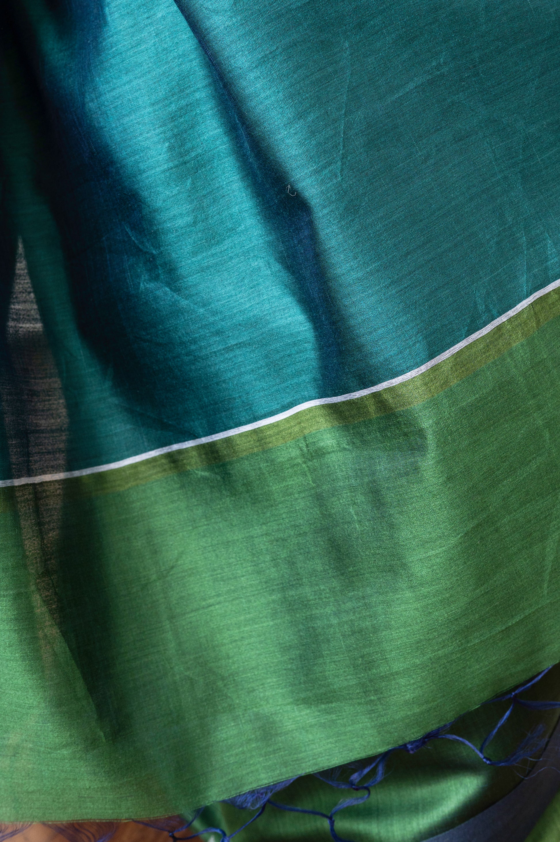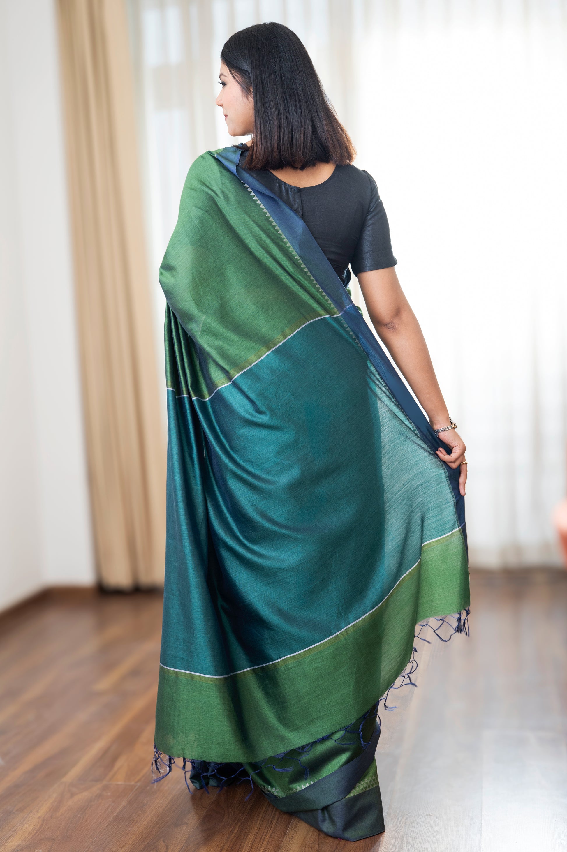 Elevate everyday elegance with this handwoven Eri Silk saree in a graceful green hue, finished with a deep blue border and pallu that evoke forest shadows and twilight skies. The raw, tactile texture of wild silk pairs beautifully with the rich contrast, offering a timeless drape that feels rooted yet refined. Whether worn for thoughtful gatherings or personal milestones, this piece carries presence without noise.