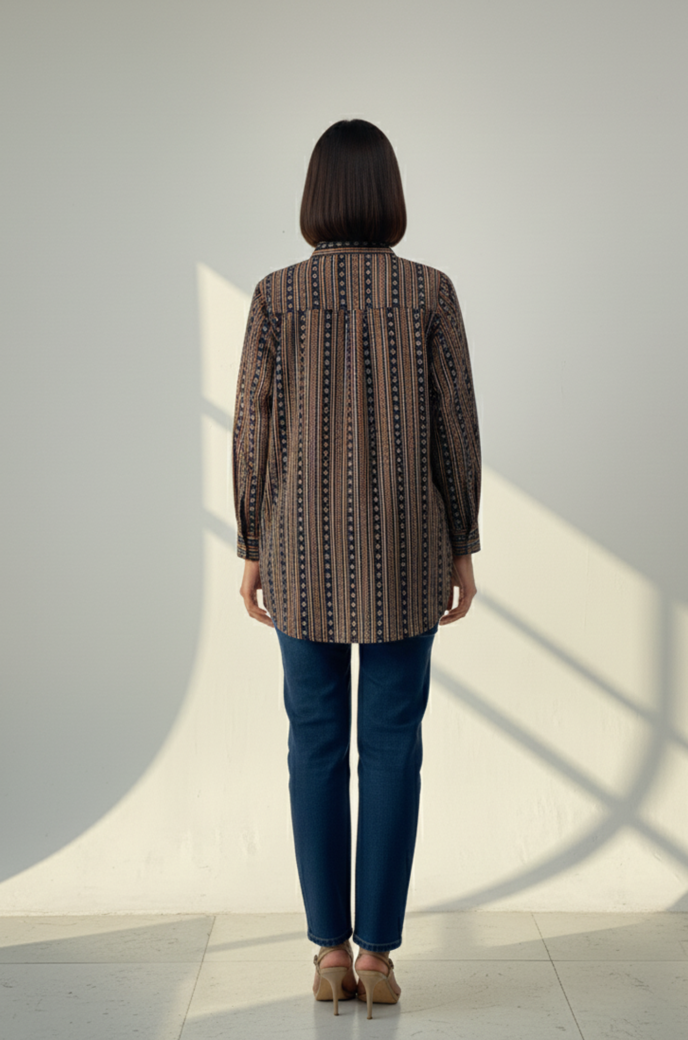 Handcrafted in 100% cotton,Ajrakh shirt in deep green and black celebrates craft through a modern lens. The collared neckline, button-down design, and full sleeves make it a refined essential for all-day comfort and understated elegance.Style it with trousers and silver hoops for a polished look, or pair it with denims and flats for easy everyday charm.