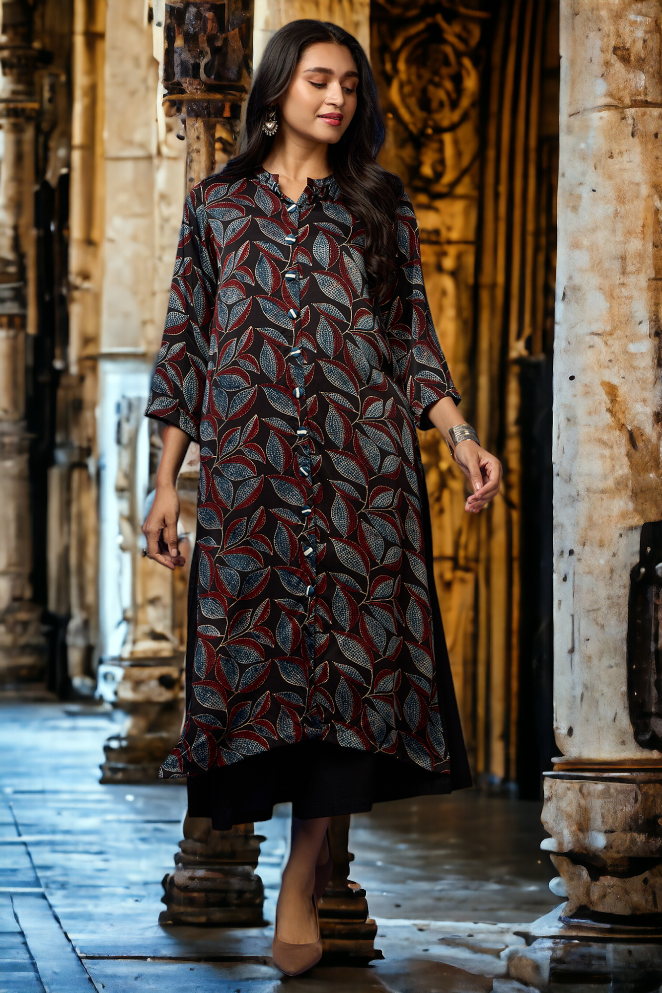 Introducing our exquisite creation, the "Raven Feather & Auburn Leaves" ensemble—a masterpiece crafted with care and precision. This button-down kurta is handcrafted in beautiful hues of black and auburn, with a distinct touch of artistry from the ajrakh technique by a national award-winning artisan in Ajrakhpur, Gujarat, using natural dyes.