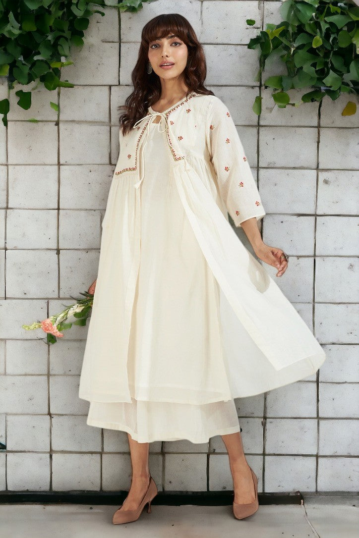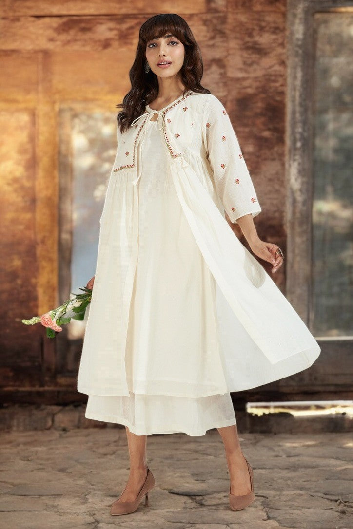 Introducing the Maati Signature Overlay with Gathers – a masterpiece of free-flowing elegance that adds a touch of breezy style to your wardrobe this season. Whether you're transitioning between seasons, embarking on travels, or attending festive gatherings, this Mughal-inspired overlay with a yoke design is edgy yet modern.