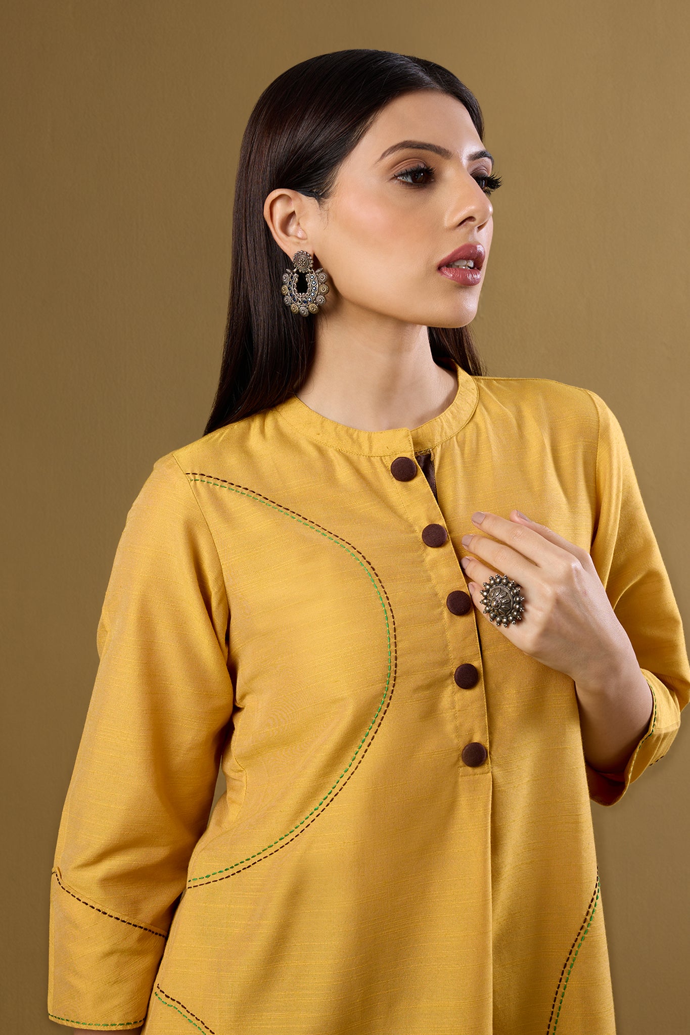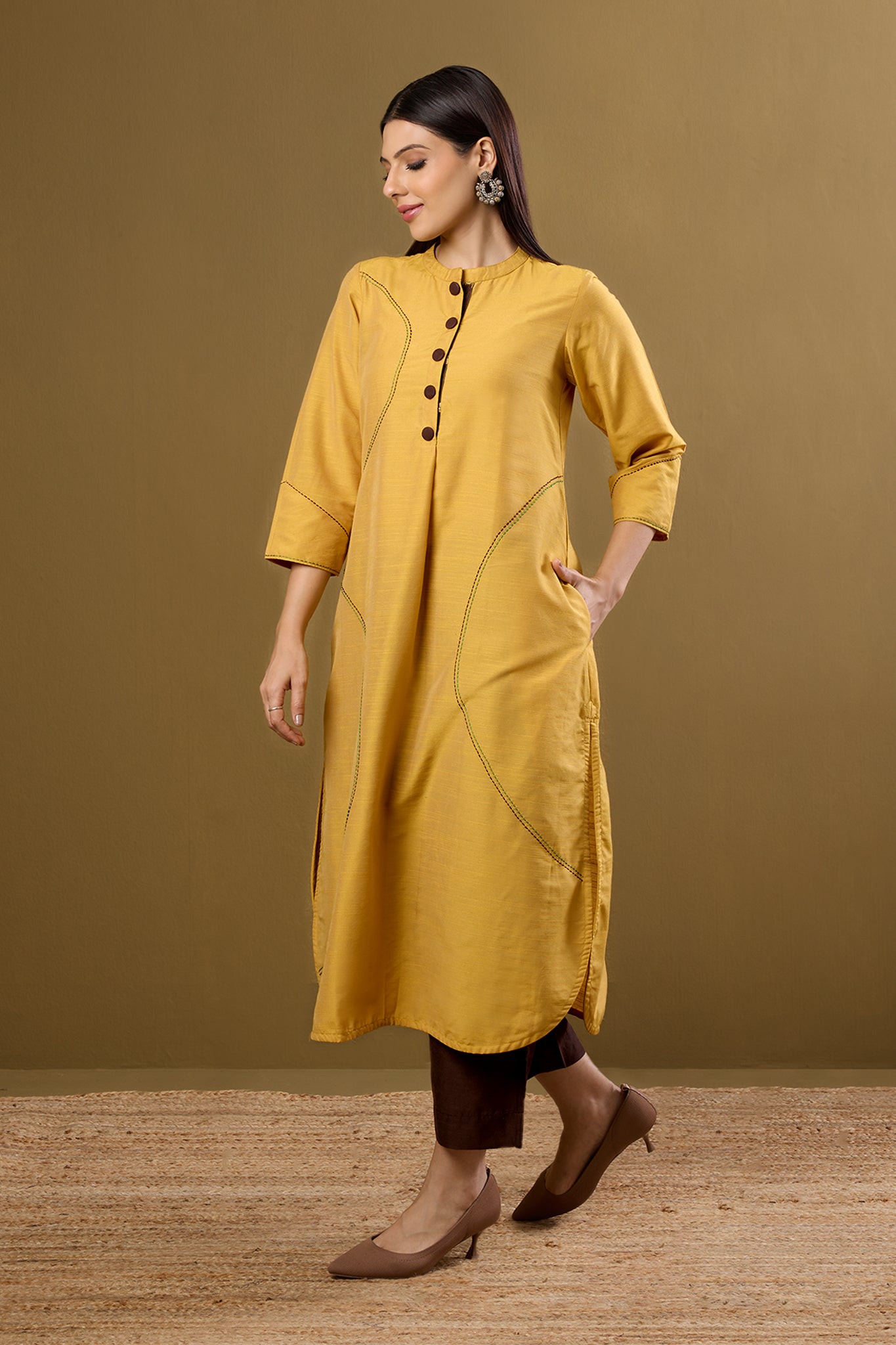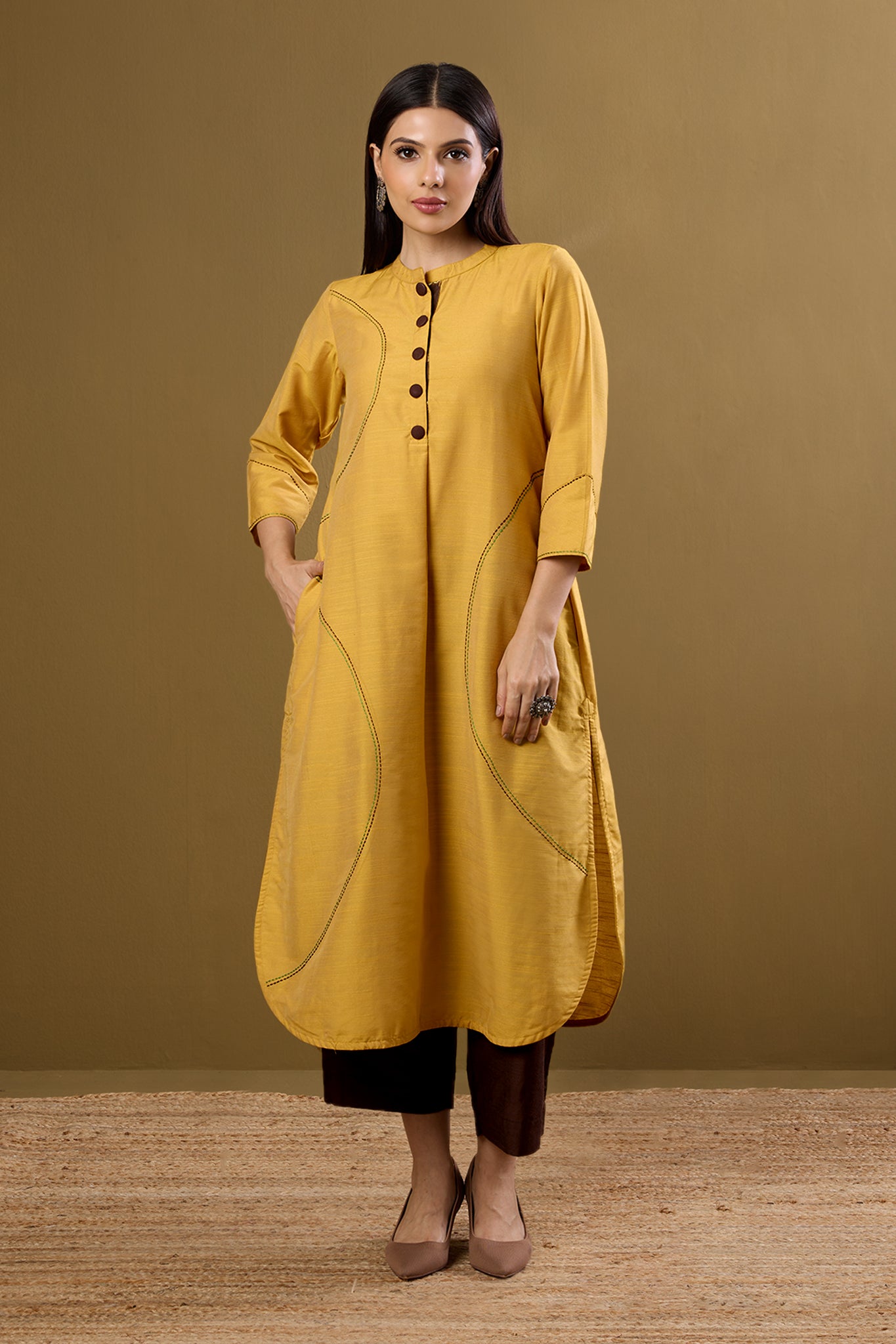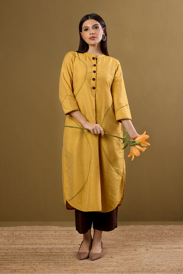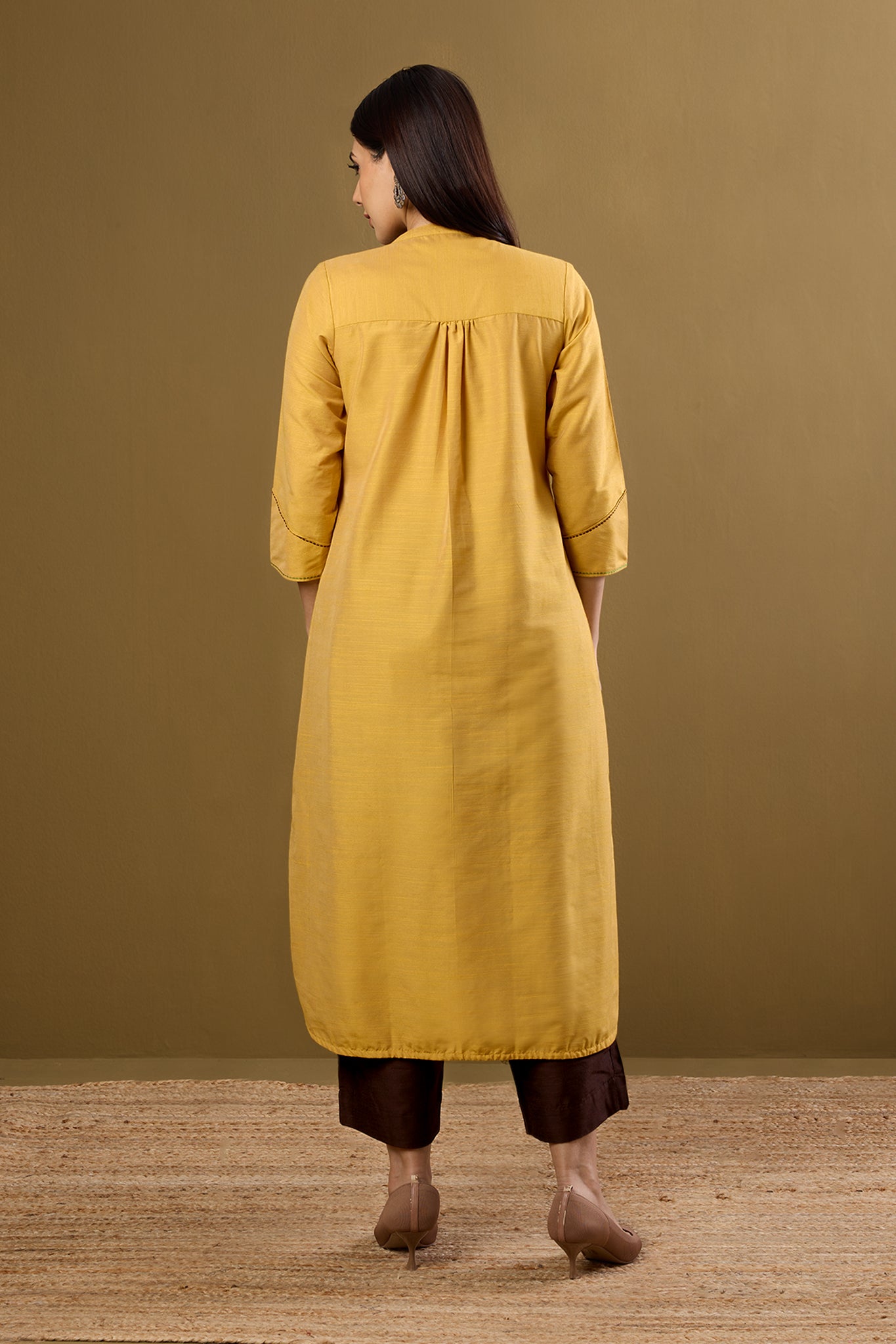 Collar Kurta Rounded Hem And Pockets In Yellow Silk Slub Brown Gold Lurex by Maati Crafts