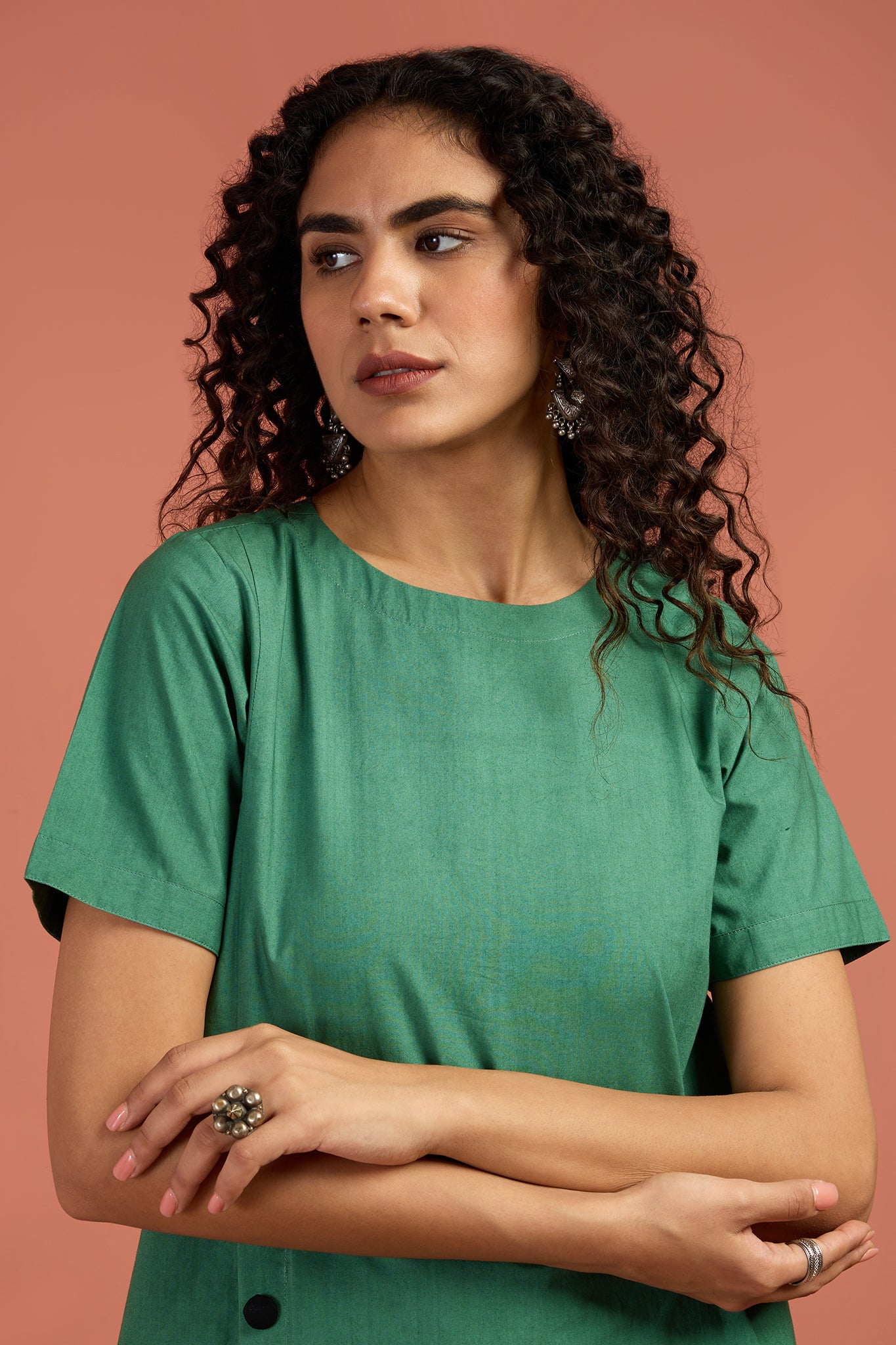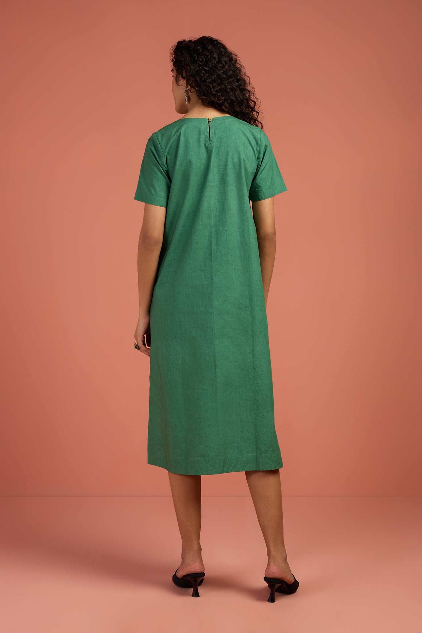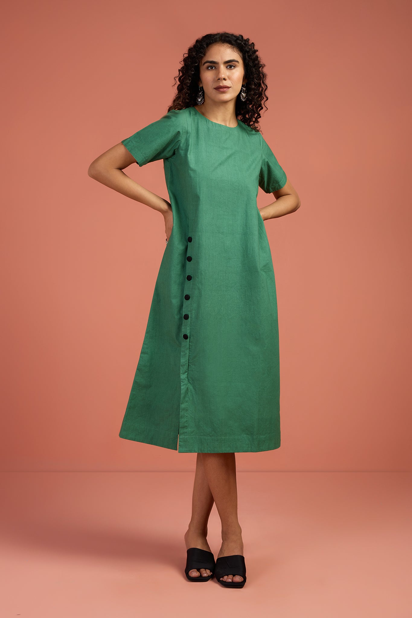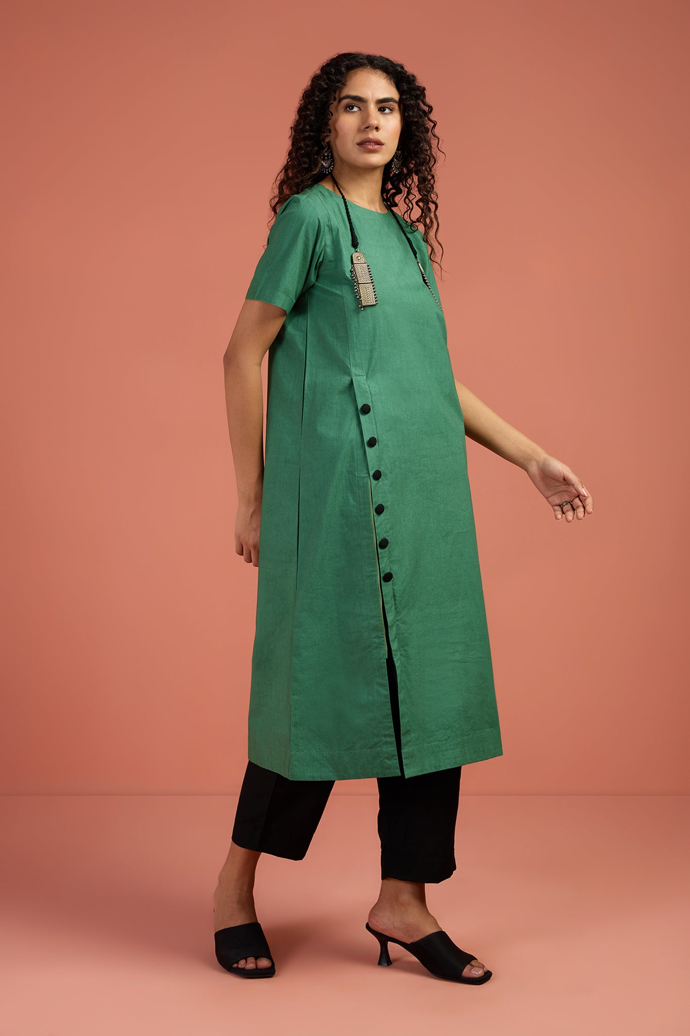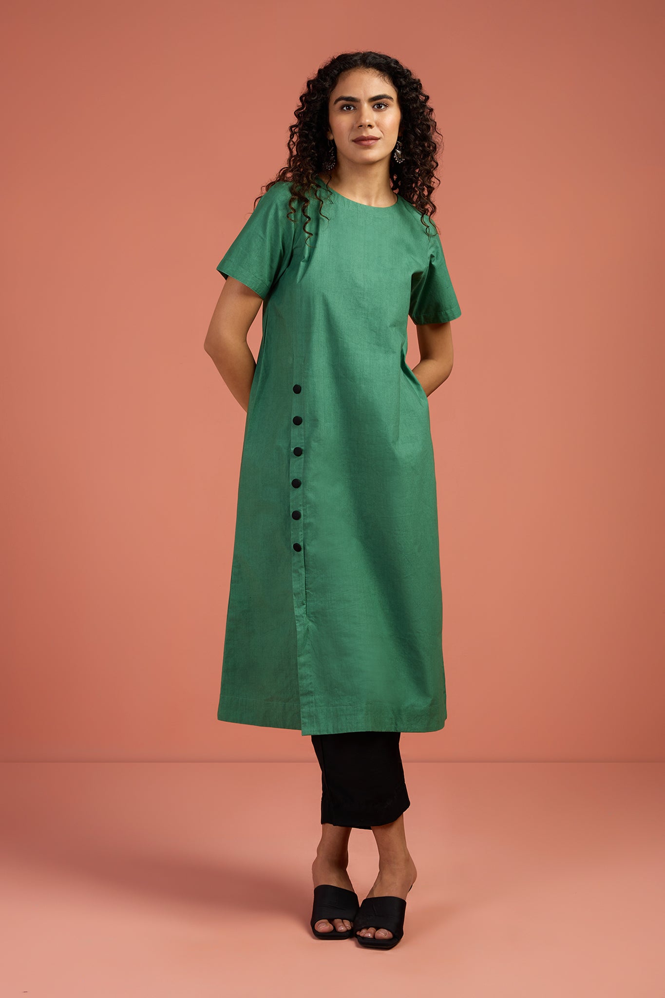 Chic and versatile, this kurta is crafted in soft cotton in a striking serpentine green hue. The front placket is accentuated with handcrafted black buttons, adding a subtle yet bold contrast. Designed in a modern, easy fit with timeless appeal, it’s perfect for everyday dressing or elevated evenings. Style it solo for a minimal statement, or pair it with our black silk slub pants (sold separately) for a polished, contemporary look. A wardrobe essential that blends clean design with artisanal detail. Styling Note: Pair with silver jewelry and flats for daytime ease, or dress it up with black pants and heels for refined evening chic. Luxury in every detail at Maati.