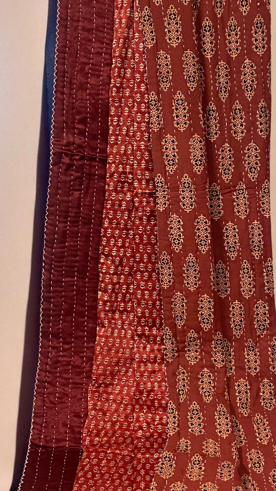 'Godri' or ‘Gudri’ is handmade, hand-stitched quilt which is sewn by women from nearby villages of Kachchh. Two layers of multi-colored patchwork fabric are sewn together with a thick cotton thread. The quilting pattern consists of running stitches through the length & width of the godri.