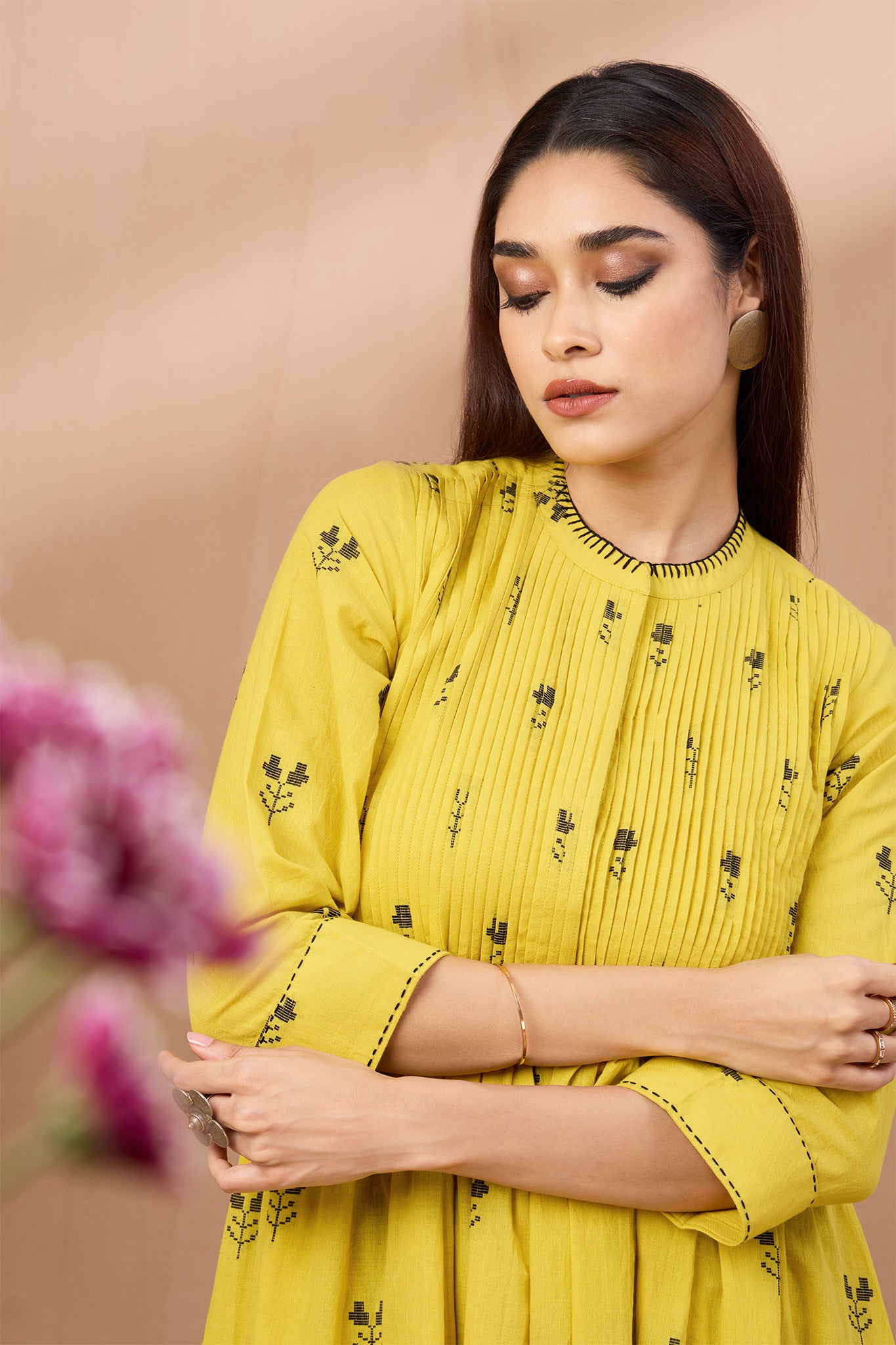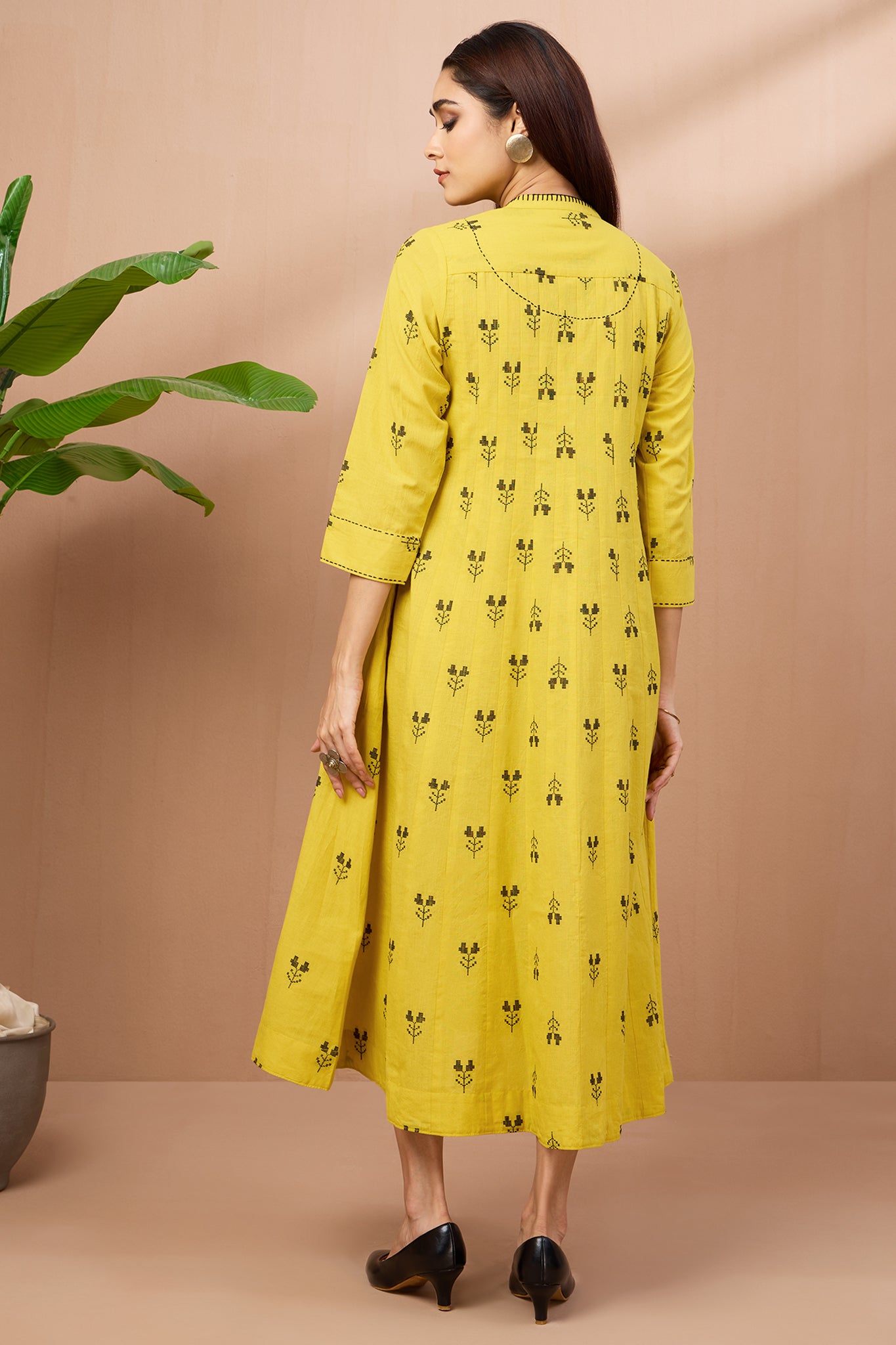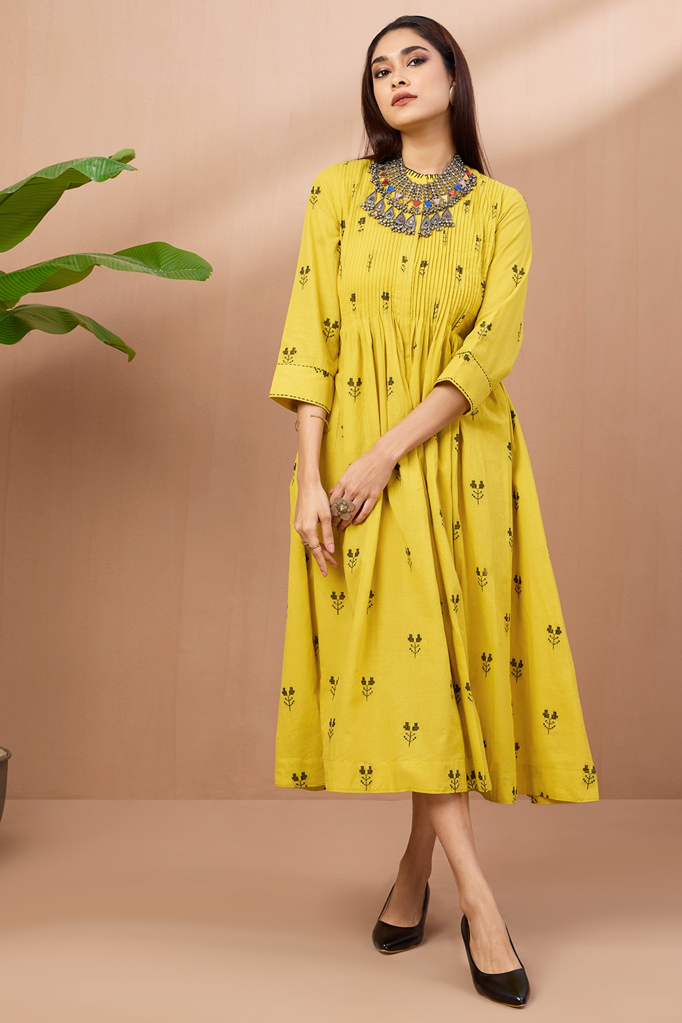 Introducing our ethereal Infinity Pintuck Dress, a symphony of summer elegance in radiant yellow with delicate black butti motifs. Accentuated by intricate bucket stitch detailing on the neckline and sleeves, it exudes refined charm. Handcrafted from 100% cotton, its soft fabric and delicate gathers make it perfect for sunny days. Featuring a stand collar neckline and versatile button-down design, it can be worn as a dress or jacket, offering versatility with every wear. Inspired by Mughal aesthetics, its flattering fit and kalis add a touch of regal grace. Each hand-pintucked detail reflects the skillful karigari of artisans, ensuring every piece is a masterpiece. A perennial favorite for four years running, this dress is the epitome of timeless elegance, designed to enchant at summer dinners and pre-wedding gatherings alike. Wear as a dress, anarkali with pants or as a jacket with denims or dresses of your choice, one dress many options!