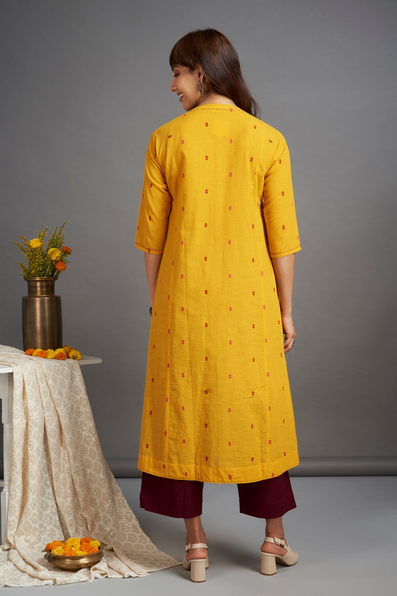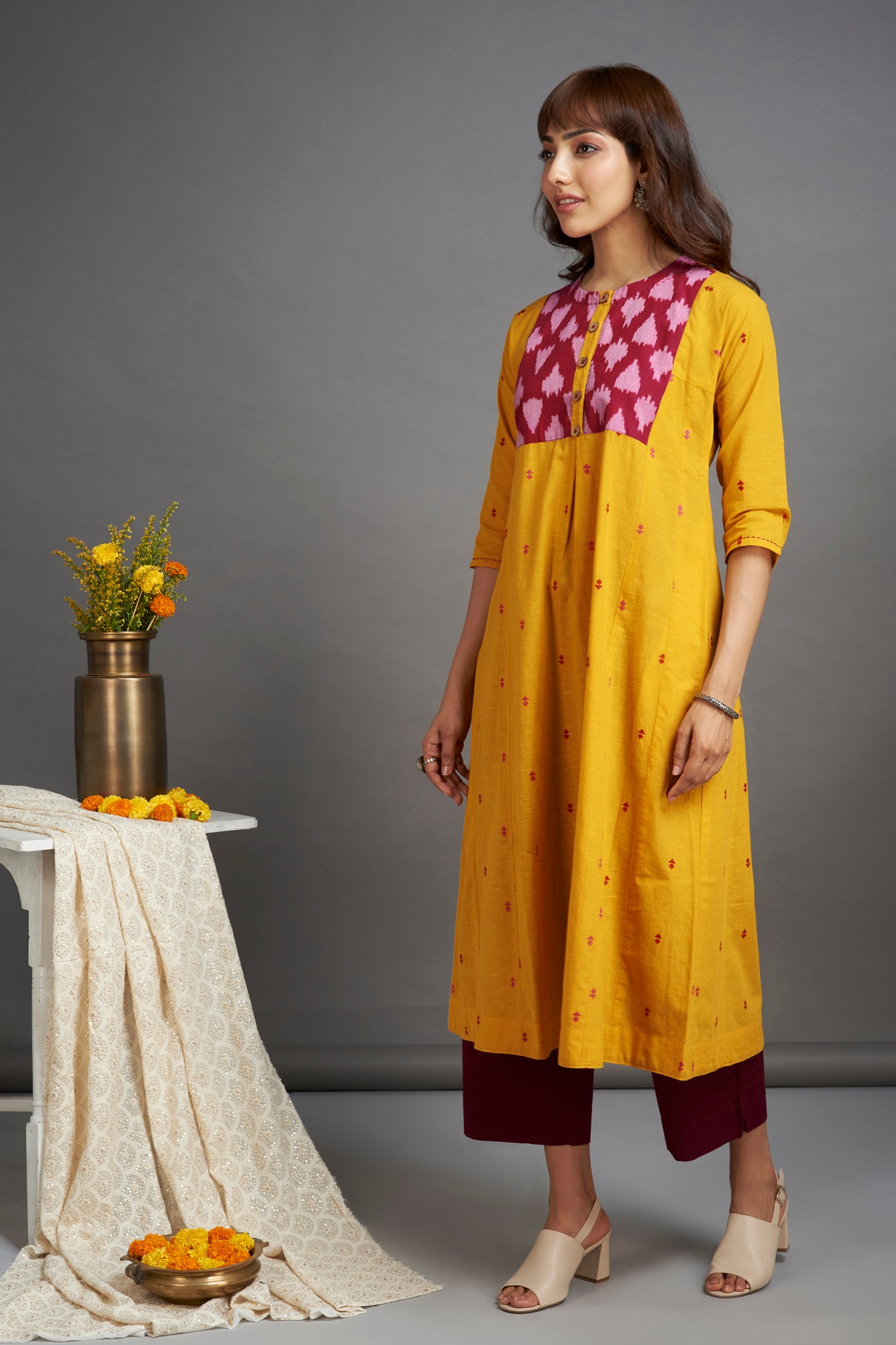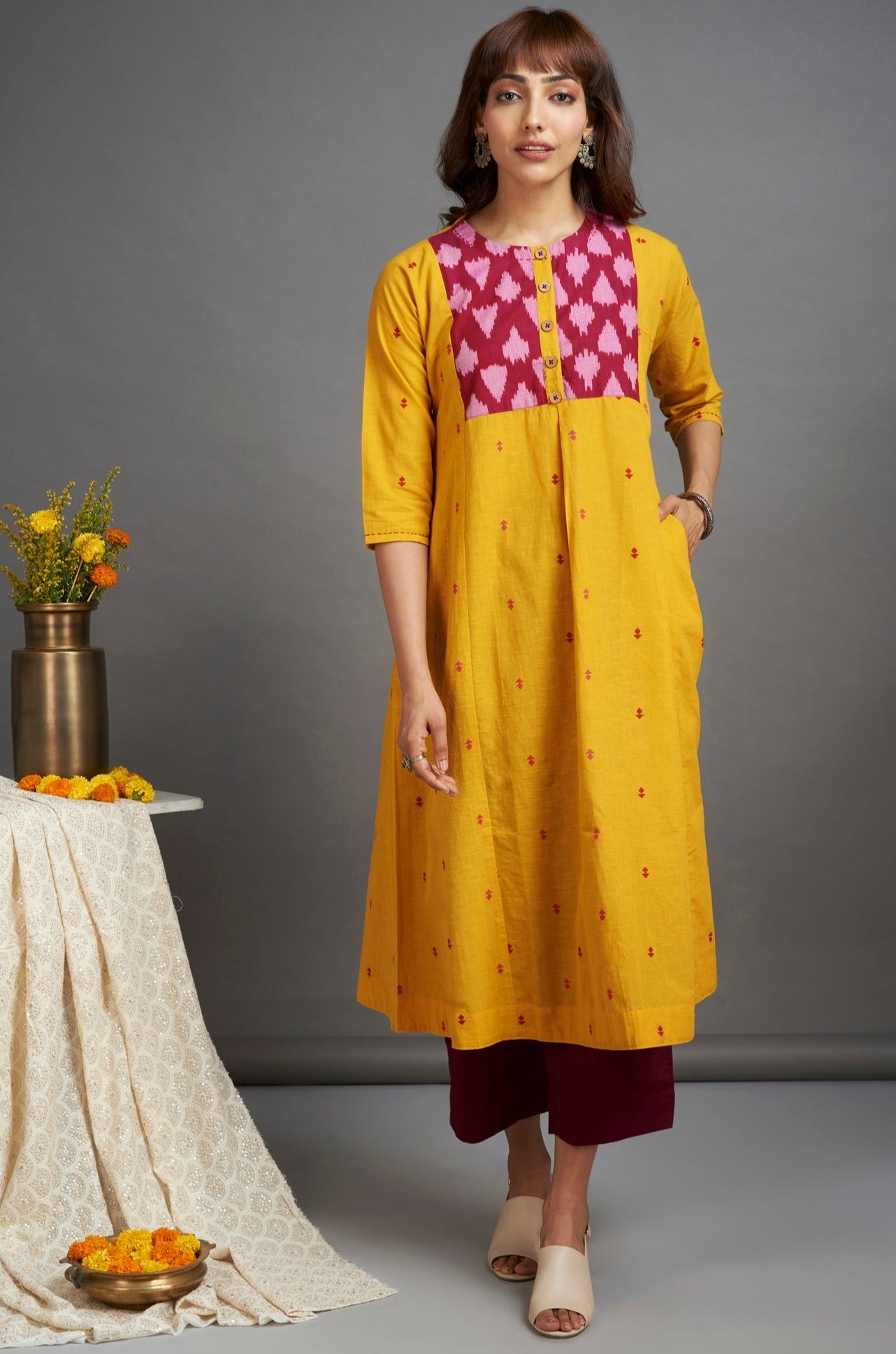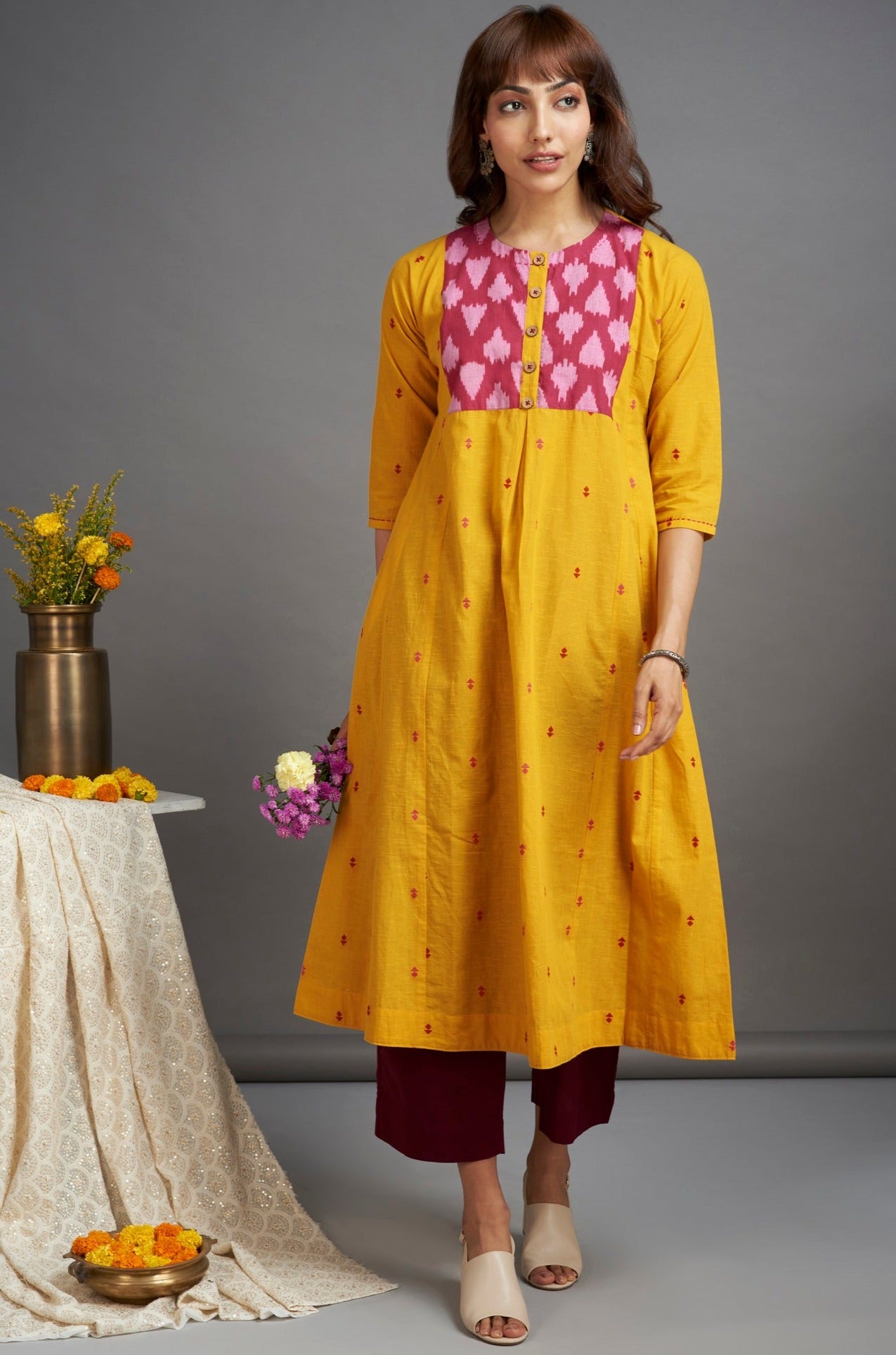Inspired by the vibrancy of yellow and rani pink, this kalidar is our take on the modern dressing!  This elegant long kalidar features pink ikat detail on the yoke, finished with wooden buttons on the placket. We at Maati, take pride in our forte of mixing prints creating a unique, beautiful & timeless silhouette. The kalidar kurta is perfect for work or a formal dinner! Style it with black culottes or pants, juttis & silver jewelry for a modern mughal look. The fabric is sourced from Mumbai, hand finished by women artisans at our studio and manufactured at our atelier in Mumbai, maharashtra.