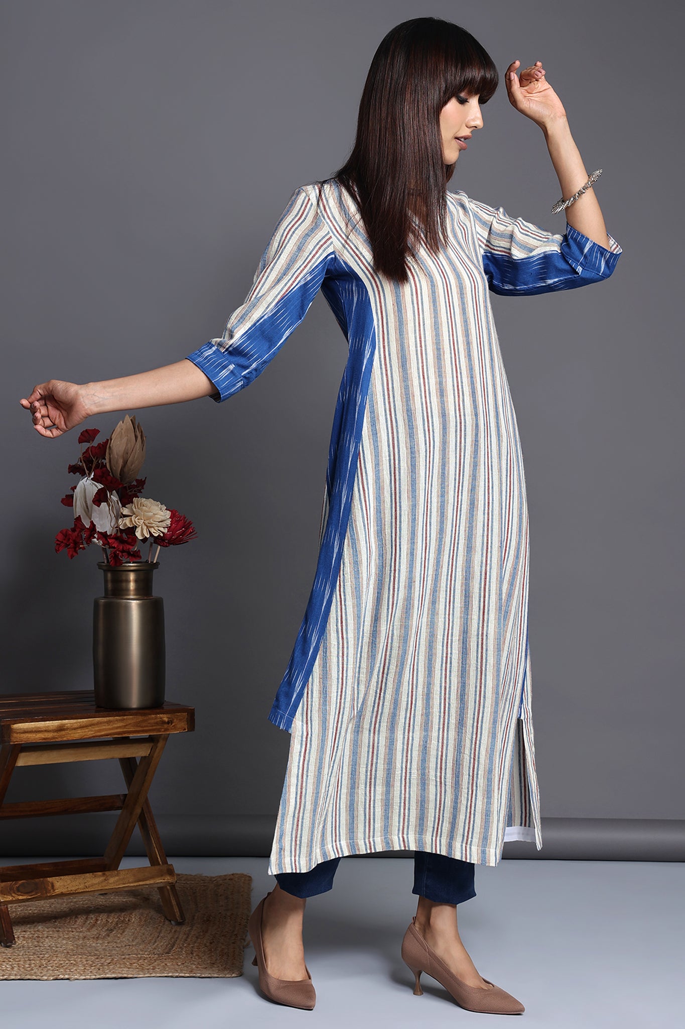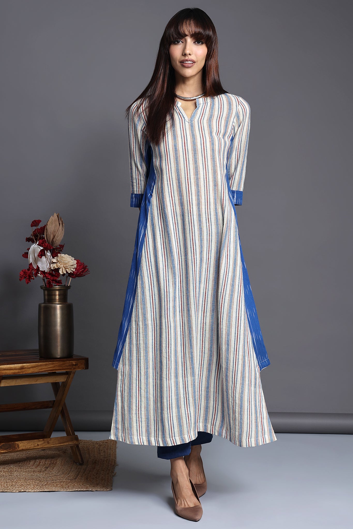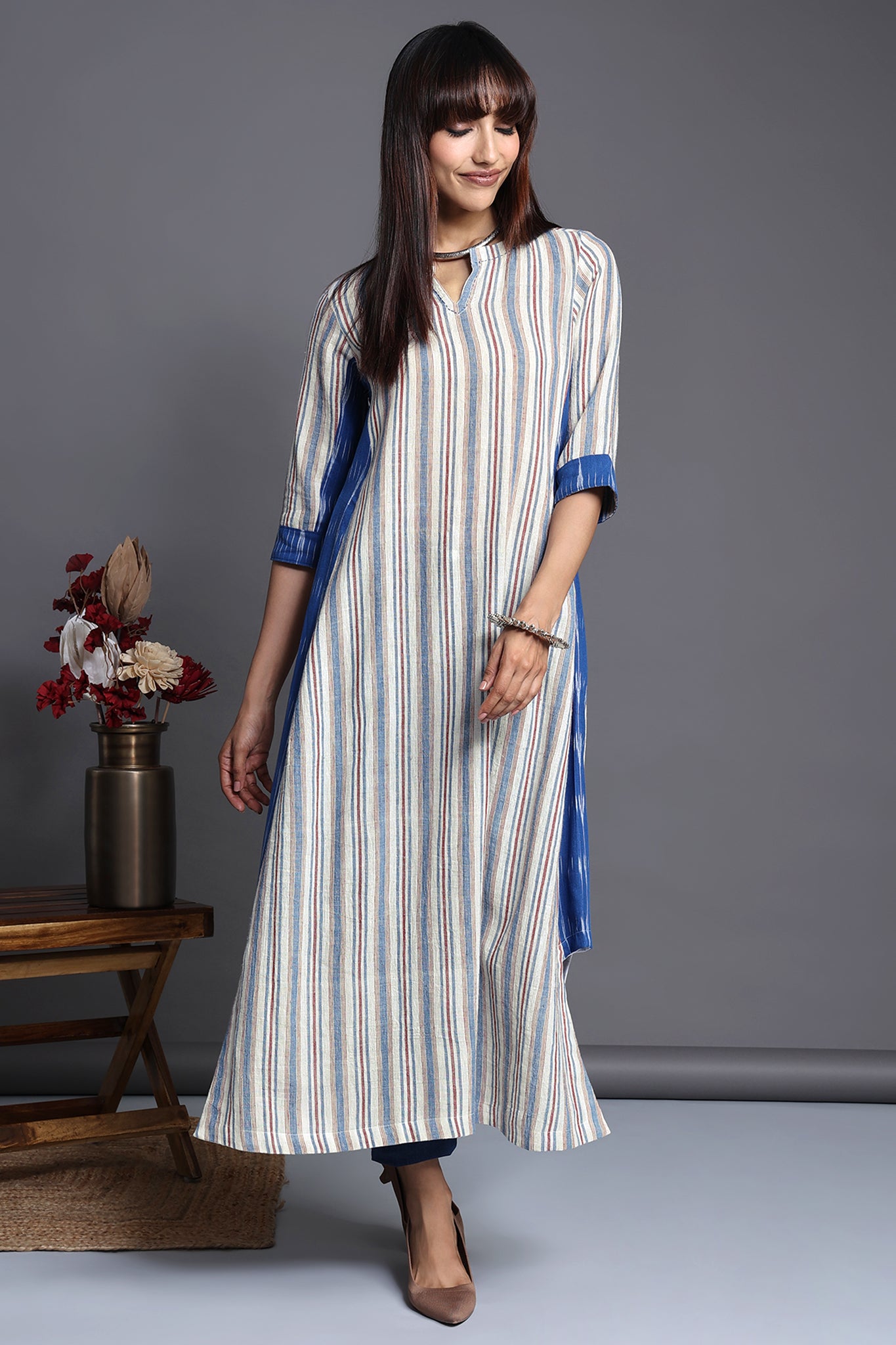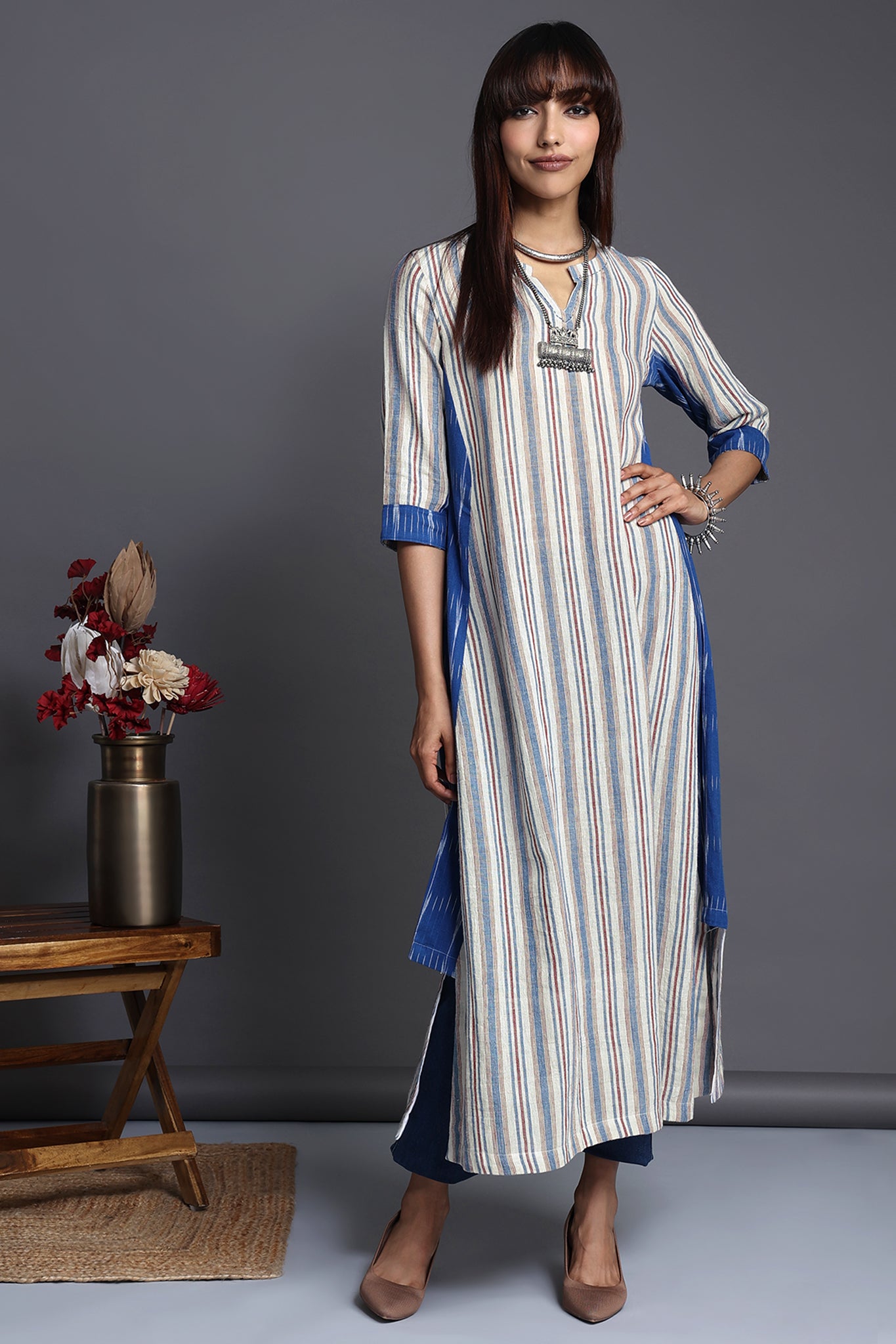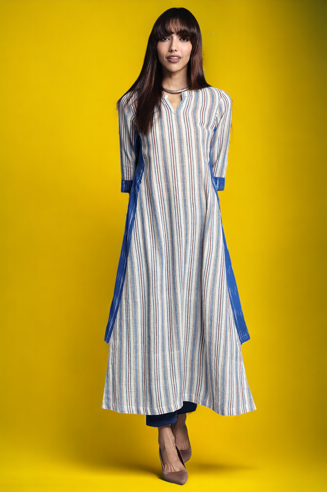 Introducing our modern and sophisticated long kurta, a stylish blend of kala cotton weave and contemporary flair. a true embodiment of timeless style and sustainability. Handcrafted in Kala Cotton, a short staple cotton indigenous to Kutch, it's a statement piece perfect for year-round, this kurta is a perfect fusion of heritage and modern styling.
