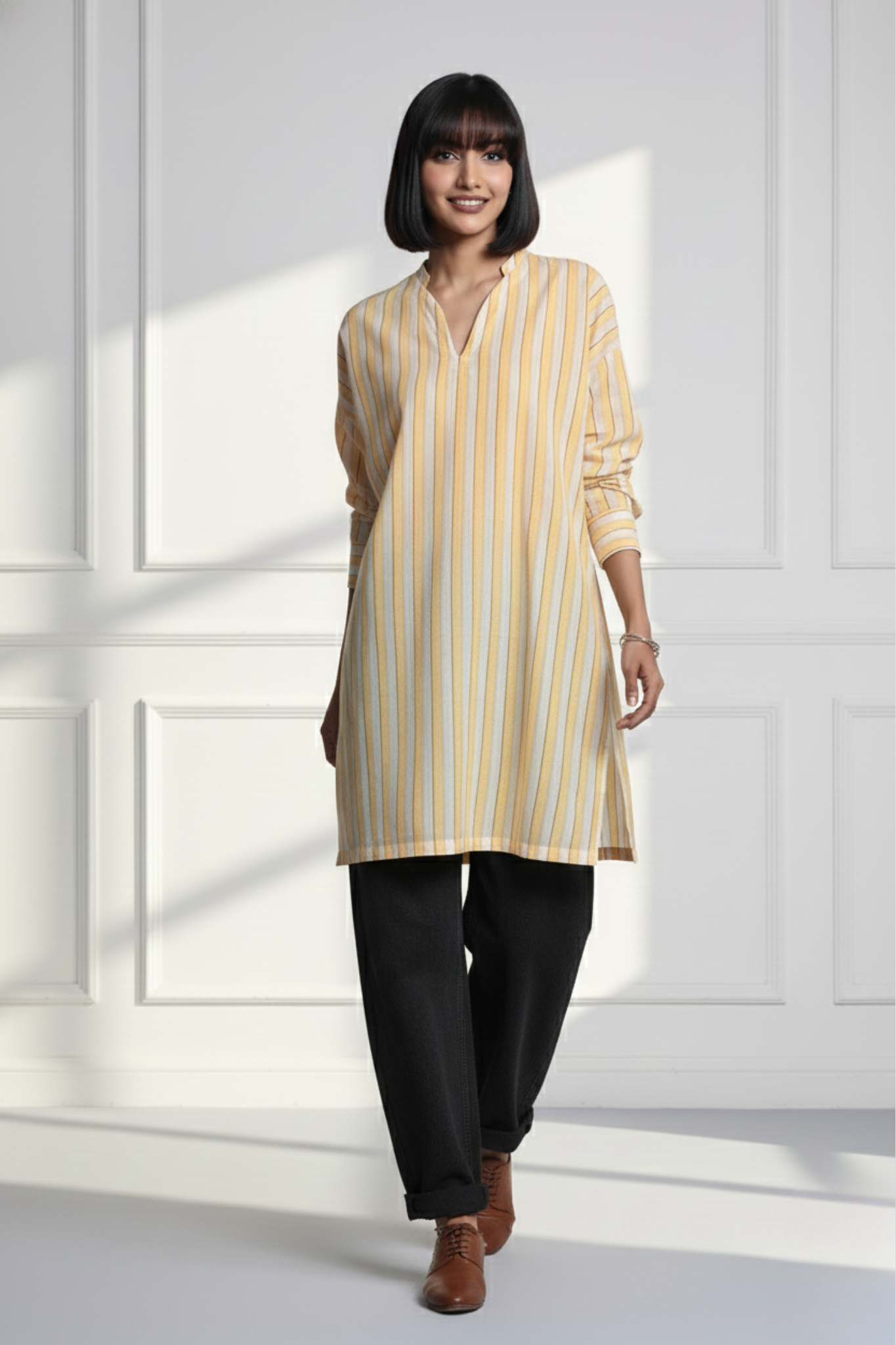 Crafted from handwoven cotton, these tops boast a functional and stylish silhouette. The weaves seamlessly intertwine, presenting a serene palette of yellow and white stripes that paint an enchanting visual. The tunic showcases an edgy long side slit, a delicate round collar on the neckline, long sleeves with cuff details and a button for that perfect styling, offering a refined finish to the ensemble. The hemline introduces an extra edge to your outfit. Whether paired with denim or pants, elevate your style with your favorite heels or sneakers.