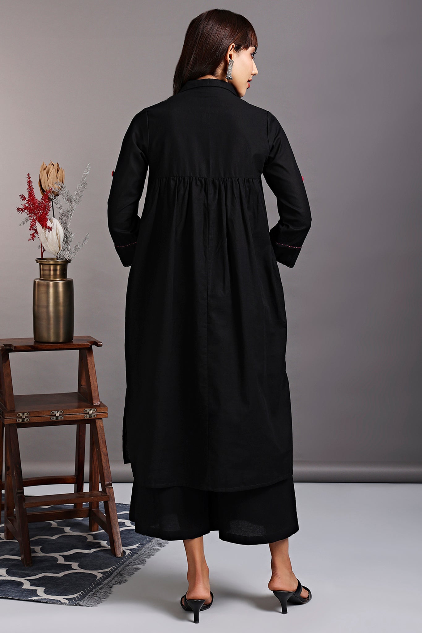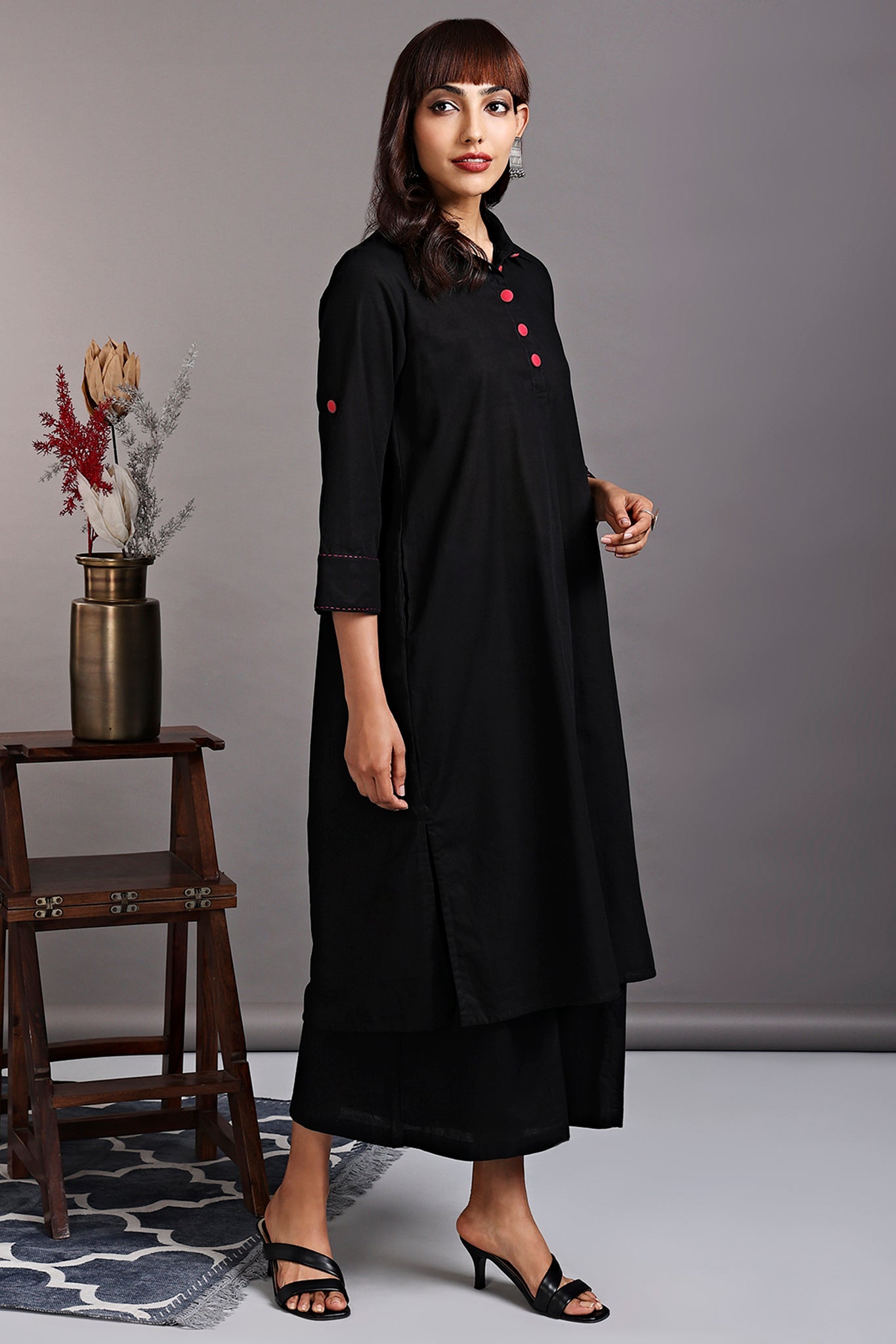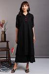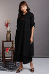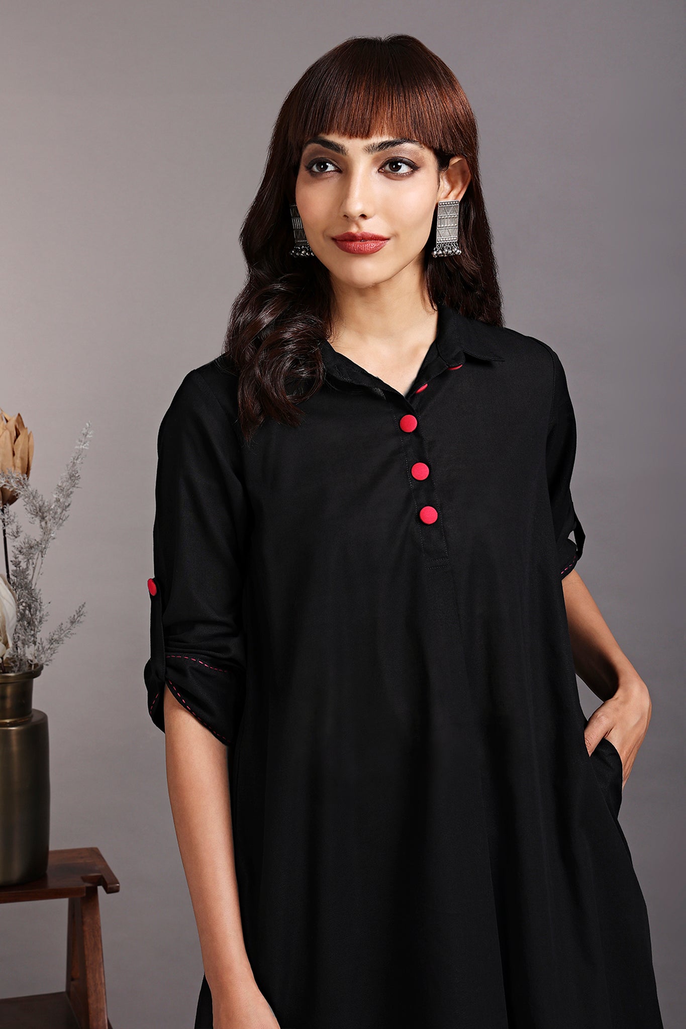 Introducing our stunning Shirt Dress, a versatile and fashionable silhouette! This dress is thoughtfully designed with side slits and a round hem, creating a modern and flattering silhouette that effortlessly enhances your style. The dress features a contrasting placket adorned with eye-catching big buttons in a vibrant pink hue, beautifully contrasting against the gorgeous kohl black. This striking color combination adds a pop of excitement and uniqueness to this outfit.