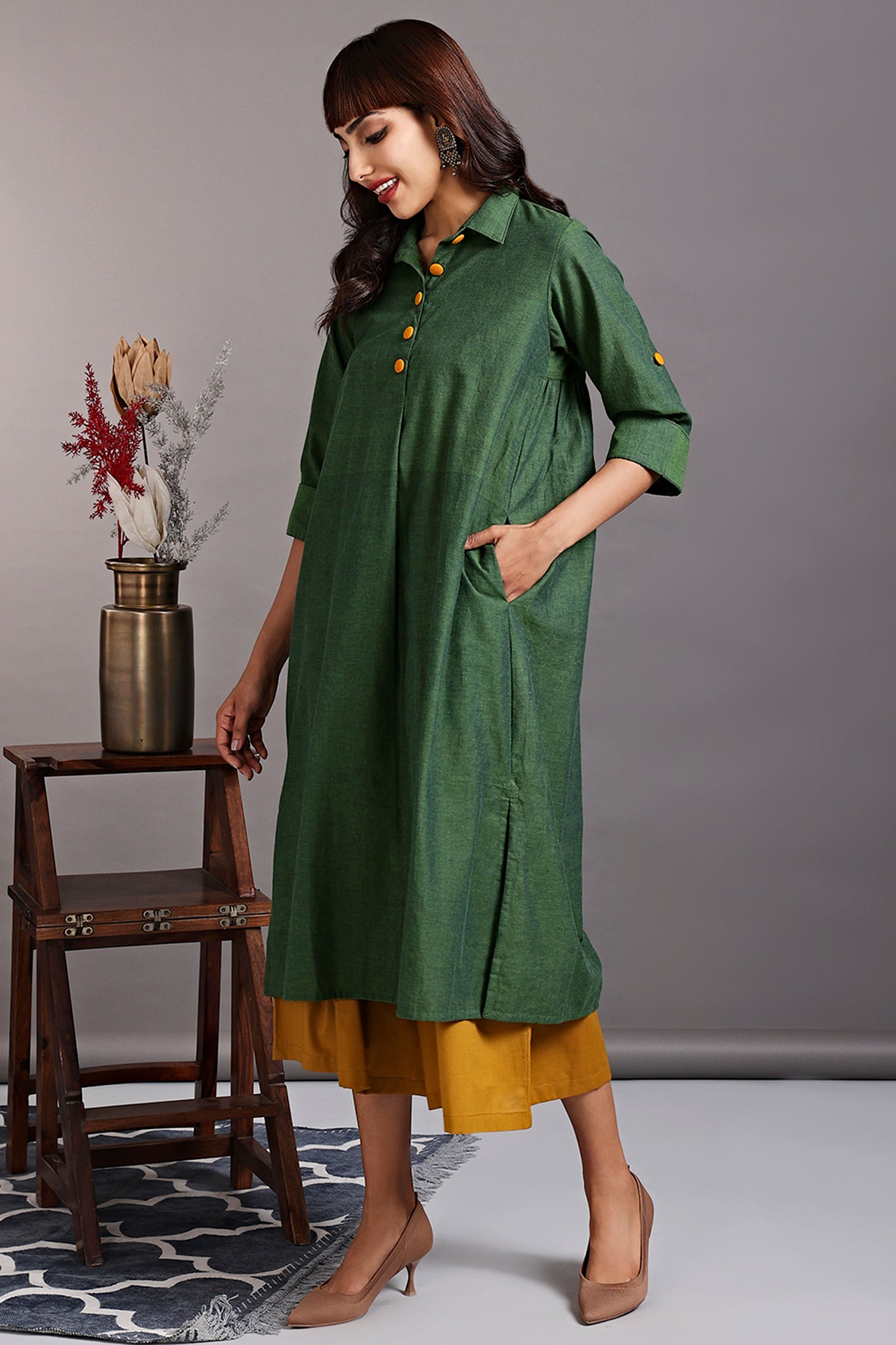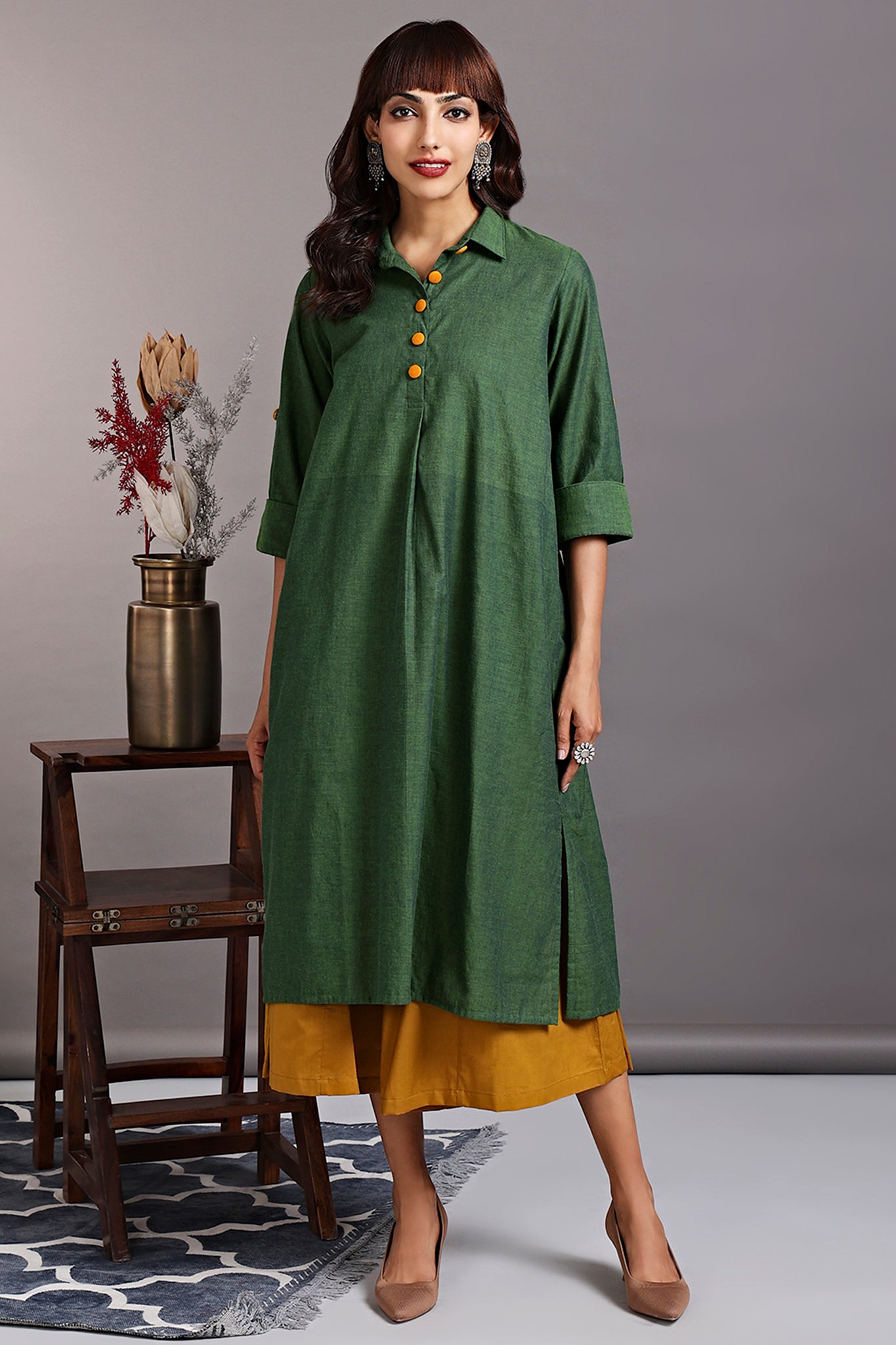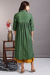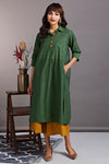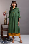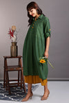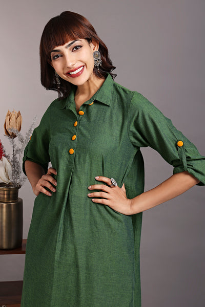 Introducing our stunning Shirt Dress, a versatile and fashionable silhouette! This dress is thoughtfully designed with side slits and a round hem, creating a modern and flattering silhouette that effortlessly enhances your style.The dress features a contrasting placket adorned with eye-catching big buttons in a vibrant orange hue, beautifully contrasting against the gorgeous green fabric. This striking color combination adds a pop of excitement and uniqueness to this outfit.