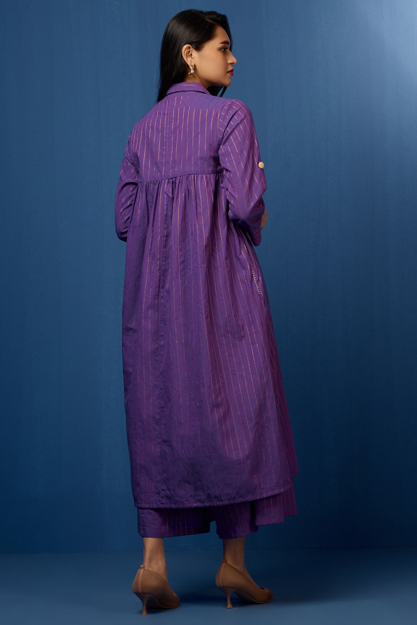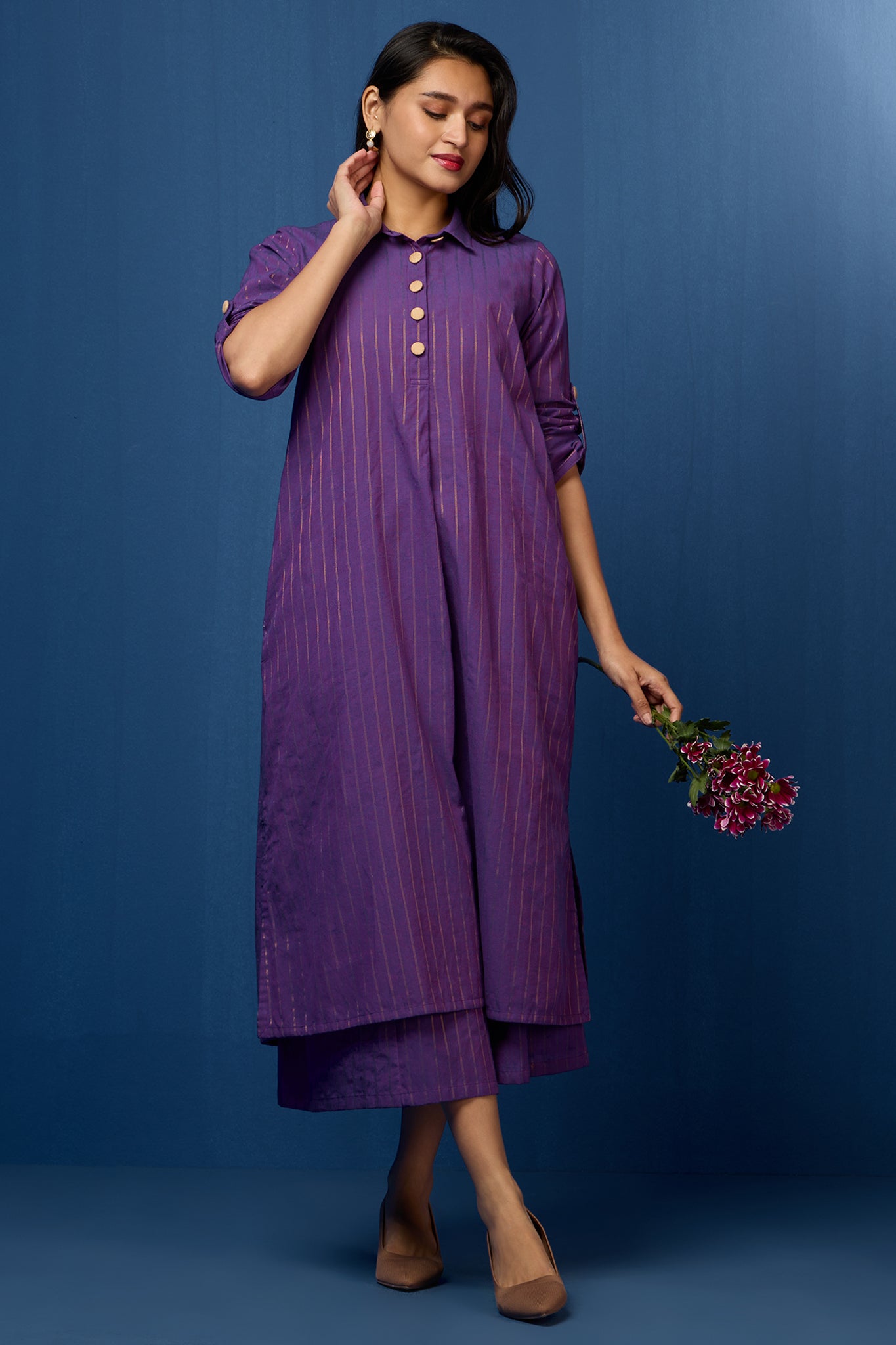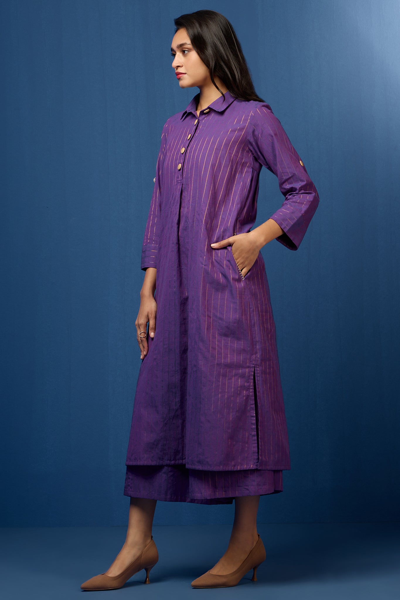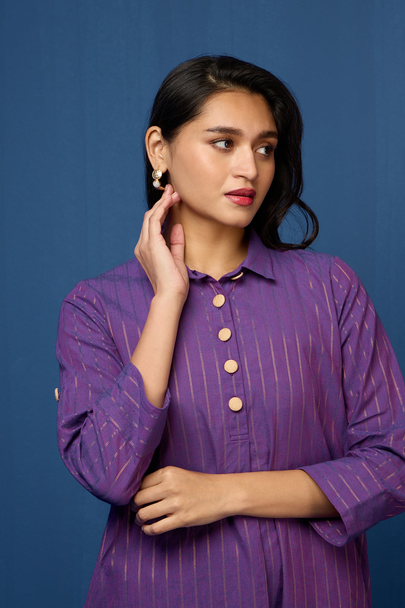 Introducing our "Lustrous Amethyst & Gold Strokes" shirt dress – a masterpiece handcrafted in the soft embrace of high-quality cotton, blending hues of regal purple with elegant gold stripes. This shirt dress is not just an ensemble; it's a statement of timeless elegance.